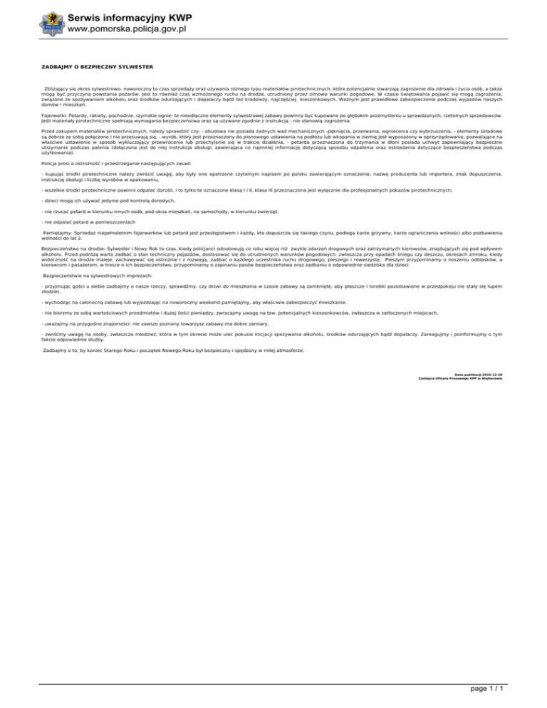 Serwis informacyjny KWP www.pomorska.policja.gov.pl ZADBAJMY O BEZPIECZNY SYLWESTER Zbliżający się okres sylwestrowo- noworoczny to czas sprzedaży oraz używania różnego typu materiałów pirotechnicznych, które potencjalnie stwarzają zagrożenie dla zdrowia i życia osób, a także mogą być przyczyną powstania pożarów. Jest to również czas wzmożonego ruchu na drodze, utrudniony przez zimowe warunki pogodowe. W czasie świętowania pojawić się mogą zagrożenia, związane ze spożywaniem alkoholu oraz środków odurzających i dopalaczy bądź też kradzieży, najczęściej kieszonkowych. Ważnym jest prawidłowe zabezpieczenie podczas wyjazdów naszych domów i mieszkań. Fajerwerki: Petardy, rakiety, pochodnie, rzymskie ognie- te nieodłączne elementy sylwestrowej zabawy powinny być kupowane po głębokim przemyśleniu u sprawdzonych, rzetelnych sprzedawców. Jeśli materiały pirotechniczne spełniają wymagania bezpieczeństwa oraz są używane zgodnie z instrukcją - nie stanowią zagrożenia. Przed zakupem materiałów pirotechnicznych, należy sprawdzić czy: - obudowa nie posiada żadnych wad mechanicznych -pęknięcia, przerwania, wgniecenia czy wybrzuszenia, - elementy składowe są dobrze ze sobą połączone i nie przesuwają się, - wyrób, który jest przeznaczony do pionowego ustawienia na podłożu lub wkopania w ziemię jest wyposażony w oprzyrządowanie, pozwalające na właściwe ustawienie w sposób wykluczający przewrócenie lub przechylenie się w trakcie działania, - petarda przeznaczona do trzymania w dłoni posiada uchwyt zapewniający bezpieczne utrzymanie podczas palenia (dołączona jest do niej instrukcja obsługi, zawierająca co najmniej informację dotyczącą sposobu odpalenia oraz ostrzeżenia dotyczące bezpieczeństwa podczas użytkowania). Policja prosi o ostrożność i przestrzeganie następujących zasad: - kupując środki pirotechniczne należy zwrócić uwagę, aby były one opatrzone czytelnym napisem po polsku zawierającym oznaczenie, nazwę producenta lub importera, znak dopuszczenia, instrukcję obsługi i liczbę wyrobów w opakowaniu, - wszelkie środki pirotechniczne powinni odpalać dorośli, i to tylko te oznaczone klasą I i II, klasa III przeznaczona jest wyłącznie dla profesjonalnych pokazów pirotechnicznych, - dzieci mogą ich używać jedynie pod kontrolą dorosłych, - nie rzucać petard w kierunku innych osób, pod okna mieszkań, na samochody, w kierunku zwierząt, - nie odpalać petard w pomieszczeniach Pamiętajmy: Sprzedaż niepełnoletnim fajerwerków lub petard jest przestępstwem i każdy, kto dopuszcza się takiego czynu, podlega karze grzywny, karze ograniczenia wolności albo pozbawienia wolności do lat 2. Bezpieczeństwo na drodze: Sylwester i Nowy Rok to czas, kiedy policjanci odnotowują co roku więcej niż zwykle zdarzeń drogowych oraz zatrzymanych kierowców, znajdujących się pod wpływem alkoholu. Przed podróżą warto zadbać o stan techniczny pojazdów, dostosować się do utrudnionych warunków pogodowych, zwłaszcza przy opadach śniegu czy deszczu, okresach zmroku, kiedy widoczność na drodze maleje, zachowywać się ostrożnie i z rozwagą, zadbać o każdego uczestnika ruchu drogowego, pieszego i rowerzystę. Pieszym przypominamy o noszeniu odblasków, a kierowcom i pasażerom, w trosce o ich bezpieczeństwo, przypominamy o zapinaniu pasów bezpieczeństwa oraz zadbaniu o odpowiednie siedziska dla dzieci. Bezpieczeństwie na sylwestrowych imprezach: - przyjmując gości u siebie zadbajmy o nasze rzeczy, sprawdźmy, czy drzwi do mieszkania w czasie zabawy są zamknięte, aby płaszcze i torebki pozostawione w przedpokoju nie stały się łupem złodziei, - wychodząc na całonocną zabawę lub wyjeżdżając na noworoczny weekend pamiętajmy, aby właściwie zabezpieczyć mieszkanie, - nie bierzmy ze sobą wartościowych przedmiotów i dużej ilości pieniędzy, zwracajmy uwagę na tzw. potencjalnych kieszonkowców, zwłaszcza w zatłoczonych miejscach, - uważajmy na przygodne znajomości- nie zawsze poznany towarzysz zabawy ma dobre zamiary, - zwróćmy uwagę na osoby, zwłaszcza młodzież, która w tym okresie może ulec pokusie inicjacji spożywania alkoholu, środków odurzających bądź dopalaczy. Zareagujmy i poinformujmy o tym fakcie odpowiednie służby. Zadbajmy o to, by koniec Starego Roku i początek Nowego Roku był bezpieczny i spędzony w miłej atmosferze. Data publikacji:2015-12-28 Zastępca Oficera Prasowego KPP w Wejherowie page 1 / 1 Powered by TCPDF (www.tcpdf.org)