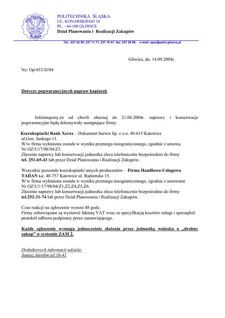 POLITECHNIKA ŚLĄSKA UL. KONARSKIEGO 18 PL. - 44-100 GLIWICE Dział Planowania i Realizacji Zakupów Tel.: 237 24 95, 237 11 71, 237 16 41 fax: 237 26 86, e-mail: [email protected] Gliwice, dn. 14.09.2004r. Nz: Op/453/JJ/04 Dotyczy pogwarancyjnych napraw kopiarek Informujemy,że od chwili obecnej do 21.06.2004r. pogwarancyjne będą dokonywały następujące firmy: naprawy i konserwacje Kserokopiarki Rank Xerox – Dokument Serwis Sp. z o.o. 40-615 Katowice ul.Gen. Jankego 11. W/w firma wyłoniona została w wyniku przetargu nieograniczonego, zgodnie z umową Nr OZ/U17/98/04/Z3. Zlecenie naprawy lub konserwacji jednostka zleca telefonicznie bezpośrednio do firmy tel. 251-65-43 lub przez Dział Planowania i Realizacji Zakupów. Wszystkie pozostałe kserokopiarki innych producentów – Firma Handlowo-Usługowa TADAN s.c. 40-757 Katowice ul. Radomska 15. W/w firma wyłoniona została w wyniku przetargu nieograniczonego, zgodnie z umowami Nr OZ/U1/17/98/04/Z1,Z2,Z4,Z5,Z6. Zlecenie naprawy lub konserwacji jednostka zleca telefonicznie bezpośrednio do firmy tel.252-31-74 lub przez Dział Planowania i Realizacji Zakupów. Czas reakcji na zgłoszenie wynosi 48 godz. Firmy zobowiązane są wystawić fakturę VAT wraz ze specyfikacją kosztów usługi i sporządzić protokół odbioru podpisany przez zamawiającego. Każde zgłoszenie wymaga jednocześnie złożenia przez jednostkę wniosku o „drobny zakup” w systemie ZAM 2. Dodatkowych informacji udziela: Janusz Jarolim tel.16-41