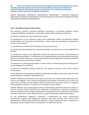 Za: http://www.nipip.pl/index.php/samorzad/osrodek-informacyjno-edukacyjny/uznawaniekwalifikacji-zawodowych/291-zasady-uznawania-kwalifikacji-zawodowych-pielegniarek-ipoloznych-bedacych-obywatelami-panstw-czlonkowskich-unii-europejskiej-na-podstawieogolnego-systemu-uznawania-kwalifikacji-zawodowych ZASADY UZNAWANIA KWALIFIKACJI ZAWODOWYCH PIELĘGNIAREK I POŁOŻNYCH BĘDĄCYCH OBYWATELAMI PAŃSTW CZŁONKOWSKICH UNII EUROPEJSKIEJ NA PODSTAWIE OGÓLNEGO SYSTEMU UZNAWANIA KWALIFIKACJI ZAWODOWYCH Krok 1: Weryfikacja złożonych dokumentów Aby rozpocząć procedurę uznawania kwalifikacji zawodowych na podstawie ogólnego systemu uznawania kwalifikacji zawodowych, wnioskodawca winien złożyć następujące dokumenty: a) wniosek o stwierdzenie prawa wykonywania zawodu, b) zaświadczenie lub inny dokument wydany przez odpowiednie władze lub organizacje państwa członkowskiego Unii Europejskiej potwierdzający, że dana osoba jest uprawniona do wykonywania zawodu w tym państwie, c) oświadczenie o posiadaniu pełnej zdolności do czynności prawnych, d) zaświadczenie poświadczające stan zdrowia pozwalający na wykonywanie zawodu pielęgniarki lub położnej, e) zaświadczenie wydane przez odpowiednie władze lub organizacje państwa członkowskiego Unii Europejskiej potwierdzające, że wnioskodawca nie został pozbawiony prawa wykonywania zawodu lub prawo to nie zostało zawieszone i nie toczy się przeciwko niemu postępowanie w sprawie pozbawienia lub zawieszenia prawa wykonywania zawodu, f) oświadczenie, że włada językiem polskim w mowie i piśmie w zakresie koniecznym do wykonywania zawodu pielęgniarki lub położnej, g) dokument określający przebieg kształcenia oraz program nauczania szkoły, którą ukończył wnioskodawca, h) inne dokumenty potwierdzające posiadanie dodatkowych kwalifikacji związanych z wykonywaniem zawodu (dyplomy, certyfikaty, zaświadczenia itp.). WAŻNE: Przedstawione dokumenty winny zostać dostarczone wraz z tłumaczeniem dokonanym przez tłumacza przysięgłego. Termin ważności zaświadczenia wskazanego w punktach b), d) i e) wynosi nie więcej niż trzy miesiące od daty wydania. Wskazane dokumenty winny zostać złożone w okręgowej izbie pielęgniarek i położnych nie później niż trzy miesiące od daty wydania. UWAGA: Właściwy organ przyjmującego Państwa Członkowskiego potwierdza otrzymanie wniosku w terminie miesiąca od jego otrzymania oraz zawiadamia wnioskodawcę w stosownym przypadku, o konieczności dostarczenia brakujących dokumentów. Zawiadomienie winno zostać dokonane w formie pisemnej i dostarczone osobie zainteresowanej w sposób umożliwiający potwierdzenie odbioru. W razie jakichkolwiek wątpliwości związanych z prawdziwością lub treścią dostarczonych dokumentów, okręgowa rada pielęgniarek i położnych jako organ właściwy, może zwrócić się do kompetentnych władz państwa pochodzenia aplikanta z prośbą o wyjaśnienia. Okres oczekiwania na odpowiedź, przerywa bieg terminów przewidzianych na rozpatrzenie sprawy. Za: http://www.nipip.pl/index.php/samorzad/osrodek-informacyjno-edukacyjny/uznawaniekwalifikacji-zawodowych/291-zasady-uznawania-kwalifikacji-zawodowych-pielegniarek-ipoloznych-bedacych-obywatelami-panstw-czlonkowskich-unii-europejskiej-na-podstawieogolnego-systemu-uznawania-kwalifikacji-zawodowych Krok 2: Weryfikacja poziomu kwalifikacji określonego w zaświadczeniu Po dokonaniu weryfikacji prawdziwości oraz kompletności przedłożonych dokumentów oraz przesłaniu wnioskodawcy właściwego zawiadomienia opisanego w punkcie „Krok l", okręgowa rada pielęgniarek i położnych, celem podjęcia dalszych kroków powinna ustalić poziom kwalifikacji, posiadanych przez wnioskodawcą zgodnie z art. 11 Dyrektywy 2005/36/WE cytowanym poniżej. Dokumentami, na podstawie których określa się poziom kwalifikacji będą: zaświadczenie wydane przez odpowiednie władze państwa pochodzenia, dyplom lub świadectwo, program nauczania szkoły. Artykuł 11 Dyrektywy 2005/36/WE Dla potrzeb stosowania art. 13 kwalifikacje zawodowe są pogrupowane na następujące poziomy: POZIOM LICEUM MEDYCZNEGO b) świadectwo potwierdzające ukończenie kształcenia w szkole średniej: i) o charakterze ogólnym, uzupełnionego o kurs lub szkolenie zawodowe inne niż te, o których mowa w lit. c), lub praktykę w okresie próbnym lub praktykę zawodową wymaganą jako uzupełnienie tego kursu, ii) lub o charakterze technicznym lub zawodowym, uzupełnionego w stosownych przypadkach kursem lub szkoleniem zawodowym, o których mowa w ppkt i) lub praktyką w okresie próbnym lub praktyką zawodową wymaganą jako uzupełnienie tego kursu; POZIOM MEDYCZNEJ SZKOŁY ZAWODOWEJ c) dyplom poświadczający ukończenie: i) kształcenia na poziomie pomaturalnym innego niż określone w lit. d) i e), trwającego przynajmniej rok lub równoważny okres w niepełnym wymiarze, które generalnie można podjąć dopiero po uzyskaniu wykształcenia średniego wymaganego do przyjęcia na studia uniwersyteckie lub inne studia wyższe lub uzyskanie równoważnego wykształcenia średniego drugiego stopnia, jak również szkolenia zawodowego, które mogą być wymagane jako uzupełnienie tego kursu na poziomie pomaturalnym; ii) lub w przypadku zawodu regulowanego, kształcenia o specjalnym programie, wymienionego w załączniku II, równoważnego z kształceniem, o którym mowa w ppkt i), które zapewnia porównywalny poziom przygotowania zawodowego i przygotowuje do pełnienia porównywalnych obowiązków i funkcji. Wykaz zawarty w załączniku II może być zmieniany zgodnie z procedurą, o której mowa w art. 58 ust. 2, w celu uwzględnienia kursów kształcenia, spełniających wymogi przewidziane w zdaniu poprzedzającym; _________________________________________________________________________ POZIOM LICENCJATA Za: http://www.nipip.pl/index.php/samorzad/osrodek-informacyjno-edukacyjny/uznawaniekwalifikacji-zawodowych/291-zasady-uznaw
