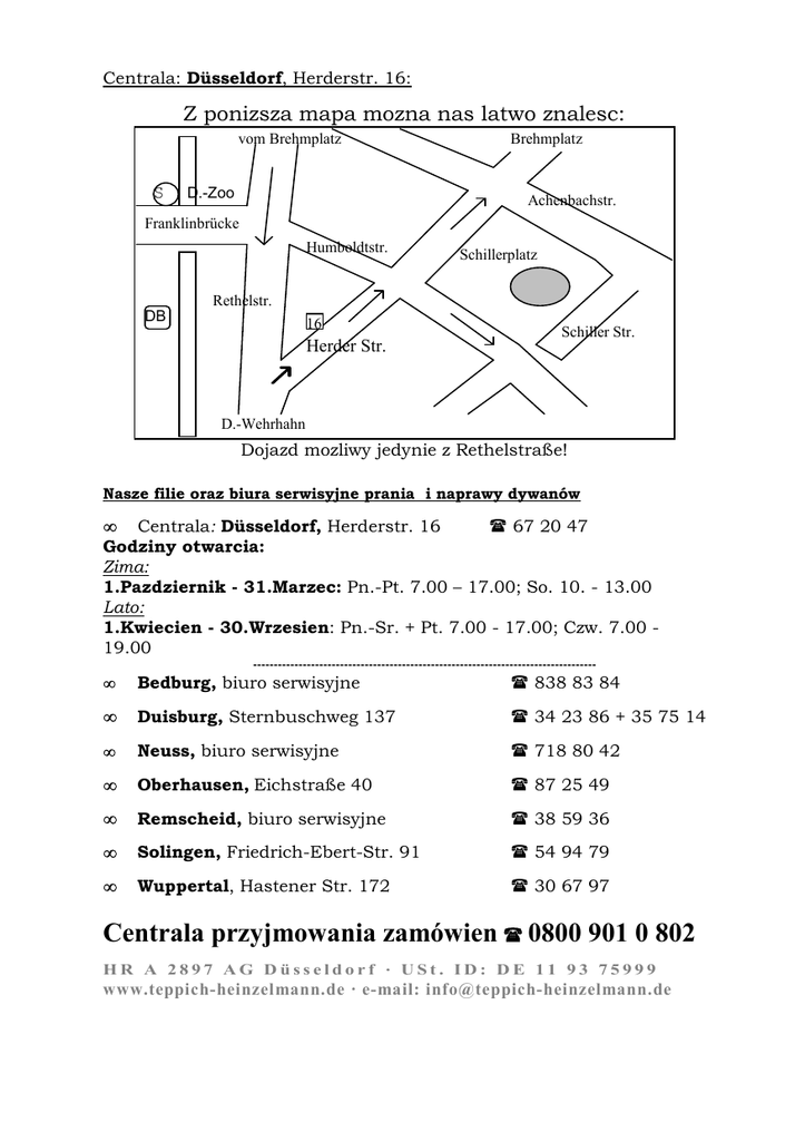 Centrala: Düsseldorf, Herderstr. 16: Z ponizsza mapa mozna nas latwo znalesc: vom Brehmplatz S Brehmplatz D.-Zoo Achenbachstr. Franklinbrücke Humboldtstr. Schillerplatz Rethelstr. DB 16 Schiller Str. Herder Str. D.-Wehrhahn Dojazd mozliwy jedynie z Rethelstraße! Nasze filie oraz biura serwisyjne prania i naprawy dywanów 67 20 47 • Centrala: Düsseldorf, Herderstr. 16 Godziny otwarcia: Zima: 1.Pazdziernik - 31.Marzec: Pn.-Pt. 7.00 – 17.00; So. 10. - 13.00 Lato: 1.Kwiecien - 30.Wrzesien: Pn.-Sr. + Pt. 7.00 - 17.00; Czw. 7.00 19.00 ----------------------------------------------------------------------------------- • Bedburg, biuro serwisyjne 838 83 84 • Duisburg, Sternbuschweg 137 34 23 86 + 35 75 14 • Neuss, biuro serwisyjne 718 80 42 • Oberhausen, Eichstraße 40 87 25 49 • Remscheid, biuro serwisyjne 38 59 36 • Solingen, Friedrich-Ebert-Str. 91 54 94 79 • Wuppertal, Hastener Str. 172 30 67 97 Centrala przyjmowania zamówien HR A 2897 AG Düsseldorf www.teppich-heinzelmann.de 0800 901 0 802 USt. ID: DE 11 93 75999 e-mail: [email protected] od 1949 Zaklad restauracji textylnej Podklady do dywanow Cennik ____________________________________________ Wazny od 01. marca 2016 do 29. lutego 2017 Pralnia Dywanów € Ceny za m² (kazdorazowo cena minimalna za sztuke) Dywany welurowe-, dlugowloseoraz tknane 9,90 Dywany orientalne oraz tkane wlasnorecznie 13,90 Dywany tuftowane 14,90 Dywany chinskie-, nepalskie-, berberyjskie oraz gabbeh 15,90 Dywany jedwabne (wszystkie rodzaje) 21,90 Szkody wyrzadzone przez pozar lub przez wode (stare) (dywany sa suche) 3,00 doplata za m² (wlacznie z plukanka higieniczna) Przy szkodach wodnych (swieze) (dywany sa mokre,wilgotne) 5,00 doplata za m² (wlacznie z plukanka higieniczna) --------------------------------------------------------------------------------------------------------------------------------------------- EKSTRA: doplata za m² Czyszczenie spodu dywanu 1,90 Plukanka higieniczna¹ ... przeciwko plesni i bakteriom 1,90 Ekstra impregnacja 1,90 ... chroni dodatkowo Srodek przeciw molom 2,90 nalezy odnowic po trzech miesacach ¹zawiera DDAC-C10 (uzywany tez w czyszczeniu ubran) Dodatkowa obróbka impregnacja oraz plukanka higieniczna sa mozliwe tylko w polaczeniu z praniem dywanów. Czyszczenie/Pranie odbywa sie wedlug normy RAL 991 A2, paragraf 4.1.1. und 4.1.4., dodatkowa obróbka paragraf 6. Wszystkie nasze ceny sa ustalone z góry i zawieraja,oprócz pelnego prania zawsze automatyczne nawilzanie dywanów z welny w kapieli octowej, dodatkowa obróbka fredzli, jezeli konieczne równiez odkurzanie urzadzeniem wibracyjnym. Swiadomie nie oferujemy zadnych dodatkowych prac których skutecznosc lub dzialanie jest watpliwe z naszego wieloletniego doswiadczenia : Na przyklad „pranie polyskowe“ lub obróbka przeciwko roztoczom na bazie roslinnej. Wszyskie ceny zawieraja 19 % VAT, normalna obróbka plam* oraz odbiór i dostarczenie zgodnie z naszym planem dostaw w obszarach/okregach: Düsseldorf, Duisburg, Krefeld, Mettmann, Mönchengladbach, Mülheim/R., Neuss, Oberhausen, Remscheid, Rhein-Erft-Kreis, Solingen oraz Wuppertal. W innych obszarach kalkulacja kosztów podrózy ryczaltowa za porozumieniem. Transport zastepczny (dla klienta bez dodatkowych oplat) przez wspólników oraz uslugi kurierskie pozostaje naszym wyborem. Zwijanie lub rozkladanie dywanów oraz przestawianie mebli nie jest wliczone w cene. Jesli nasi pracownicy w tym pomoga, to odbywa sie to bezplatnie na ryzyko klienta. Jesli wymagany jest dodatkowy pracownik przy odbiorze/dostawie z powodu wielkosci i warunków lokalnych, liczymy za podróz 10,00€ oplaty serwisowej. * zawsze bez gwarancji sukcesu Naprawy dywanów i restaurowanie w naszym warsztacie tylko wedlug kosztorysu, który dla klienta zawsze jest bezplatny i niezobowiazujacy. Przy skladaniu zamówienia w ciaglu szesciu miesiecy kosztorysy sa dla nas wiazace i precyzyjne przestrzeganie kosztów jest zawsze gwarantowane. Ze wzgledów higienicznych naprawy będą wykonywane tylko na nowych lub swiezo wyczyszczonych dywanach. Maszynowe dzierganie podluznych krawedzi: 11,50 €/m wlacznie z pracami przygotowawczymi (ciecie, fortyfikacja kantow). Dzierganie zasadniczo tylko w polaczeniu z pralnia. Na wiele napraw udzielamy piec lat gwarancji. Wiecej szczególowych informacji mozna znalesc w danym kosztorysie. Zdjecia przykladowe naszej pracy na stronie www.teppichreparaturen.de Podkłady do dywanów wyprobowane i skuteczne: Super Teppichbremse na tekstylne podlogi przeciw falowaniu oraz slizganiu chroni/oszczedza dywan Elastic na sliskie podlogi stabilna w formie nadajaca sie do prania 2,5 mm gruba € za m² w fasonie 6,50 w rolce € za m² w szerokosci 60cm 110cm 6,90 € 12,50€ Korzystne standartowe wymiary 160 x 230 cm 21,60 160 x 225 cm 49,00 190 x 290 cm 31,70 190 x 290 cm 70,00 240 x 340 cm 46,60 240 x 340 cm 102,00 290 x 390 cm 59,80 290 x 390 cm 141,00 Na zyczenie wysylamy bezplatne próbki z dokladniejszym opisem. Wszystkie podklady mozna równiez latwo dociac samemu nozyczkami. Bezplatna dostawa przez nasz servis przy minimalnej wartosci zamówienia 15,00€. Minimalna wartosc zamówienia odpada przy jednoczesnej dostawie oczyszczonych/naprawionych dywanów. Alternatywnie mozemy wyslac podklady do dywanów jako pakiet. Przy zamówieniu na przynajmniej 25,00€ dostawa jest bezplatna. Dla zamówien ponizej 25,00€ beda pobierane koszty 5,90€. Przed wlasnym odbiorem podkladu (jedynie w centrali w Düsseldorfie) prosimy zawsze o zamawianie telefoniczne, faksem lub e-mailem.