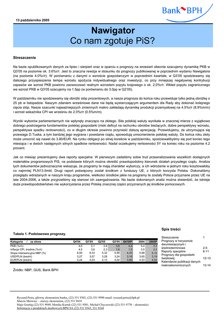 13 października 2005 Nawigator Co nam zgotuje PiS? Streszczenie Na bazie opublikowanych danych za lipiec i sierpień oraz w oparciu o prognozy na wrzesień obecnie szacujemy dynamikę PKB w Q3’05 na poziomie ok. 3.6%r/r. Jest to znaczna rewizja w stosunku do prognozy publikowanej w poprzednim wydaniu Nawigatora (na poziomie 4.0%r/r). W porównaniu z danymi o wzroście gospodarczym w poprzednim kwartale, w Q3’05 spodziewamy się dalszego przyspieszenia tempa wzrostu spożycia indywidualnego oraz inwestycji, co przy mniejszej negatywnej kontrybucji zapasów we wzrost PKB powinno zaowocować realnym wzrostem popytu krajowego o ok. 2.0%r/r. Wkład popytu zagranicznego we wzrost PKB w Q3’05 szacujemy na 1.5pp (w porównaniu do 3.0pp w Q2’05). W październiku nie spodziewamy się obniżki stóp procentowych, a nasza prognoza do końca roku przewiduje tylko jedną obniżkę o 25 pb w listopadzie. Naszym zdaniem wrześniowe dane nie będą wystarczającym argumentem dla Rady aby dokonać kolejnego cięcia stóp. Nasze szacunki najważniejszych zmiennych makro zakładają dynamikę produkcji przemysłowej na 4.5%r/r (8.9%m/m) i wzrost wskaźnika CPI we wrześniu do 2.0%r/r (0.5%m/m). Wyniki wyborów parlamentarnych nie wpłynęły znacząco na złotego. Siła polskiej waluty wynikała w znacznej mierze z wyjątkowo dobrego postrzegania fundamentów polskiej gospodarki (niski deficyt na rachunku obrotów bieżących, dobre perspektywy wzrostu, perspektywa spadku rentowności), co w długim okresie powinno przynieść dalszą aprecjację. Przewidujemy, że utrzymująca się przewaga D.Tuska, a tym bardziej jego wygrana i powstanie rządu, spowodują umocnienienie polskiej waluty. Do końca roku złoty może umocnić się nawet do 3.80/EUR. Na rynku obligacji po silnej korekcie w październiku, spodziewalibyśmy się pod koniec tego miesiąca i w dwóch następnych silnych spadków rentowności. Nadal oczekujemy rentowności 5Y na koniec roku na poziomie 4.2 procent. Jak co miesiąc prezentujemy dwa raporty specjalne. W pierwszym zadaliśmy sobie trud przeanalizowania wszelkich dostępnych materiałów programowych PiS, na podstawie których można określić prawdopodobny kierunek działań przyszłego rządu. Analiza tych dokumentów jednoznacznie wskazuje, że programy te mają charakter wyborczy, a ich wdrożenie w jednym roku kosztowałoby co najmniej PLN13.5mld. Drugi raport poświęcony został środkom z funduszy UE, z których korzysta Polska. Dokonaliśmy przeglądu wdrażanych w naszym kraju programów, wielkości środków jakie na programy te zostały Polsce przyznane przez UE na lata 2004-2006, a także przyjrzeliśmy się stanowi ich zaangażowania. Na bazie dokonanych analiz można stwierdzić, że istnieje duże prawdopodobieństwo nie wykorzystania przez Polskę znacznej części przyznanych jej środków pomocowych. Spis treści Tabela 1. Podstawowe prognozy. Kategoria / za okres PKB (%r/r) Inflacja CPI, średnia (%r/r) Stopa interwencyjna NBP (%) USD/PLN (średni) EUR/PLN (średni) Q4'04 4,0 4,5 6,50 3,27 4,24 Q1'05 2,1 3,6 6,33 3,07 4,03 Q2'05 2,8 2,3 5,33 3,28 4,13 Q3'05 Q4'05P 2004 2005P 3,6 1,6 4,58 3,24 4,02 4,4 1,5 4,33 3,16 3,90 5,4 3,5 5,88 3,65 4,53 3,3 2,3 5,15 3,19 4,02 Źródło: NBP, GUS, Bank BPH Ryszard.Petru, główny ekonomista banku, (22) 531 9303, (22) 531 9990 email: [email protected] Marcin Mrowiec – starszy ekonomista, (22) 531 9410 Maja Goettig (22) 531 9949, Monika Kurtek (22) 531 9501, Michał Chyczewski (22) 531 9770 – ekonomiści Informacja o produktach skarbowych BPH SA (22) 531 9343, 531 9344 Streszczenie Prognozy w horyzoncie dwumiesięcznym i średnioterminowe Raporty specjalne Prognozy dla gospodarki światowej Kalendarze publikacji danych makroekonomicznych 1 2-5 6-11 12-13 13-14 13 października 2005 Nawigator PROGNOZY W HORYZONCIE DWUMIESIĘCZNYM I ŚREDNIOTERMINOWE Dane dotyczące wzrostu gospodarczego w Q3’05 opublikowane zostaną przez GUS w końcu listopada br. Nie dysponujemy jeszcze wszystkimi danymi miesięcznymi w tym kwartale (takimi jak produkcja sprzedana przemysłu, sprzedaż detaliczna czy eksport i import), niemniej jednak na bazie danych już opublikowanych (za lipiec i sierpień) oraz w oparciu o prognozy (na wrzesień) możemy ocenić jakiego rzędu wzrost PKB miał miejsce w tym okresie. Według naszych szacunków dynamika PKB w Q3’05 była wyższa w porównaniu do kwartału poprzedniego i wyniosła ok. 3.6%r/r. W Q4’05 szacujemy dalsze przyspieszenie dynamiki wzrostu gospodarczego do ok. 4.4%r/r. W całym 2005 roku realny wzrost PKB nie przekroczy 3.3%. W porównaniu z danymi o wzroście gospodarczym w Q2’05 w Q3’05 spodziewamy się dalszego przyspieszenia tempa wzrostu spożycia indywidualnego oraz inwestycji, co przy mniejszej negatywnej kontrybucji zapasów we wzrost PKB (ok. –0.8pp) powinno zaowocować wzrostem realnym popytu krajowego o ok. 2.0%r/r (wobec spadku o 0.3%r/r w poprzednim kwartale). Wzrost konsumpcji sektora gospodarstw domowych w Q3’05 prognozujemy na poziomie 2.7%r/r. Na wyraźnie lepszą dynamikę tej kategorii wskazują w pierwszej kolejności dane dotyczące sprzedaży detalicznej, która w ujęciu realnym wzrosła w lipcu o 3.2%, a w sierpniu o 5.6%. Przewidujemy, że we wrześniu sprzedaż detaliczna utrzymywała się na relatywnie wysokim poziomie, co w rezultacie przełoży się na realny wzrost handlu detalicznego w Q3’05 o ok. 5.0%r/r. Biorąc pod uwagę realny spadek sprzedaży w poprzednim kwartale o 3.2%r/r, 5-procentowy wzrost w Q3 jest sporym odbiciem. Nie należy zapominać jednak o efektach statystycznych z poprzedniego roku, które szczególny wpływ na kształtowanie się dynamik sprzedaży i konsumpcji miały właśnie w pierwszej połowie br. Pozytywny wpływ na zwiększanie wydatków przez gospodarstwa domowe mają rosnące wynagrodzenia oraz zatrudnienie. O ile w Q1’05 wynagrodzenia w sektorze przedsiębiorstw spadły realnie o 1.4%r/r, to w Q2’05 nast