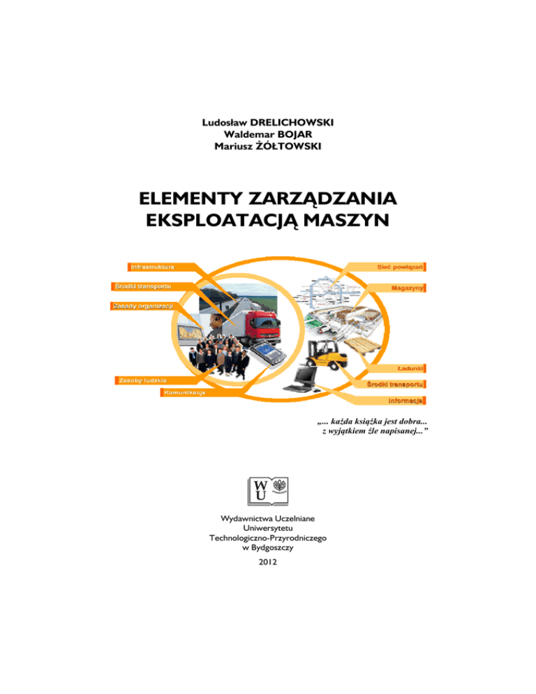 Ludosław DRELICHOWSKI Waldemar BOJAR Mariusz ŻÓŁTOWSKI ELEMENTY ZARZĄDZANIA EKSPLOATACJĄ MASZYN „... każda książka jest dobra... z wyjątkiem źle napisanej...” Wydawnictwa Uczelniane Uniwersytetu Technologiczno−Przyrodniczego w Bydgoszczy 2012 Ludosław DRELICHOWSKI, Waldemar BOJAR, Mariusz ŻÓŁTOWSKI ELEMENTY ZARZADZANIA EKSPLOATACJĄ MASZYN Treści merytoryczne tej książki są poświęcone w ogólności elementom zarządzania eksploatacją maszyn w inżynierii produkcji przedsiębiorstw przemysłowych. W książce wyróżniono i rozpatrzono trzy istotne problemy: zadania i funkcjonowanie systemu eksploatacji maszyn w systemach działania; koncepcje budowy systemów eksploatacji maszyn; informatyczne systemy zarządzania w praktyce przedsiębiorstw. Na zarządzanie w inżynierii eksploatacji składa się zbiór działań obejmujących: planowanie i podejmowanie decyzji, organizowanie oraz kierowanie i kontrolowanie skierowane na zasoby systemu (ludzkie, finansowe, rzeczowe, informacyjne) w celu racjonalnego planowania i realizacji produkcji. Efektywność zarządzania w inżynierii eksploatacji jest charakteryzowana wskaźnikami: skuteczności, opisującymi stopień osiągnięcia celów oraz ekonomiczności, określający relacje między korzyściami a nakładami. W tym opracowaniu omówiono nowoczesne metody i narzędzia zarządzania w inżynierii eksploatacji maszyn, przy uwzględnieniu potrzeb, możliwości i doświadczeń z wykorzystania nowoczesnych technologii informatycznych. Racjonalne, proinnowacyjne myślenie w obszarze eksploatacji maszyn jest źródłem oszczędności surowców, energii i nakładów kapitałowych oraz podstawową strategią uzyskania korzyści i osiągania zysków przez przedsiębiorstwa. Praca przeznaczona jest dla szerokiego kręgu odbiorców, pracowników przedsiębiorstw, kadry zarządzającej, a szczególnie dla studentów i słuchaczy kierunków zarządzanie oraz zarządzanie i inżynieria produkcji. Recenzenci: prof. n. dr hab. inż. Witold BIAŁY – PŚl., Gliwice prof. dr hab. inż. Bogdan ŻÓŁTOWSKI – UTP, Bydgoszcz © Copyright by Ludosław DRELICHOWSKI, Waldemar BOJAR, Mariusz ŻÓŁTOWSKI, 2012 r. © Copyright by Wydawnictwa Uczelniane Uniwersytetu Technologiczno-Przyrodniczego, 2012 r. Wydawnictwo dofinansowane z środków projektu nr WND-POIG.01.03.01-00-212/09 „Techniki wirtualne w badaniach stanu, zagrożeń bezpieczeństwa i środowiska eksploatowanych maszyn” współfinansowanego przez Unię Europejską ze środków Europejskiego Funduszu Rozwoju Regionalnego. Cytaty zaczerpnięto z wielu dostępnych ksiąg cytatów Wydawnictwa Uczelniane Uniwersytetu Technologiczno-Przyrodniczego Redaktor Naczelny – prof. dr hab. inż. Józef Flizikowski ul. Ks. A. Kordeckiego 20, 85-225 Bydgoszcz, tel. 52 3749482, 52 3749426 e-mail: [email protected] http://www.wu.utp.edu.pl Wyd. I. Nakład 100 egz. Ark. aut. 8,7. Ark. druk. 9,2. Zamówienie nr 23/2012 Zakład Małej Poligrafii UTP Bydgoszcz, ul. Ks. A. Kordeckiego 20 … sukcesy motywują nas do działania – oto nasze wybrane dokonanie… SPIS TREŚCI WPROWADZENIE ....................................................................................................... 5 1. ZARZĄDZANIE PRZEDSIĘBIORSTWEM ........................................................ 7 1.1. Modele organizacji w przedsiębiorstwie ............................................................ 7 1.2. Metody i narzędzia zarządzania jakością w przedsiębiorstwie ........................ 18 1.3. Systemy informacyjne zarządzania przedsiębiorstwem ................................... 38 2. SYSTEMY UTRZYMANIA ZDATNOŚCI MASZYN ....................................... 49 2.1. Modele obiektów eksploatacji.......................................................................... 49 2.2. Modele procesów eksploatacji ......................................................................... 55 2.3. Procedury eksploatacji maszyn ....................................................................... 61 2.4. Modele zarządzania w eksploatacji maszyn ..................................................... 69 2.5. Modelowanie procesów rozwoju organizacji ................................................... 72 3. MODUŁY SYSTEMU EKSPLOATACJI MASZYN.......................................... 82 3.1. Moduł przetwarzania danych i realizacji zadań ............................................... 85 3.2. Moduł funkcji kierowniczych i logistycznych ................................................. 90 3.3. Moduł realizacji usług i kontroli eksploatacji .................................................. 92 3.4. Moduł szkolenia kadr i rozliczeń ..................................................................... 94 3.5. Omówienie wybranych programów ................................................................. 97 4. PROCES ZARZĄDZANIA W EKSPLOATACJI MASZYN .......................... 109 4.1. Podstawowe wymagania systemu informatycznego ...................................... 109 4.2. Funkcje planistyczne produkcji...................................................................... 111 4.3. Podsystem obsługiwania maszyny ................................................................. 129 4.4. Systemy utrzymania ruchu maszyn ................................................................ 135 PODSUMOWANIE ................................................................................................... 142 LITERATURA ........................................................................................................... 143 4 5 ... łatwiej sprzeciwić się początkowi niż końcowi... WPROWADZENIE W ostatnim dziesięcioleciu tematyka zarządzania eksploatacją maszyn stała się przedmiotem współzawodnictwa w procesie zapewnienia konkurencyjności wytwarzania w warunkach niezwykle dynamicznego tempa postępu technologicznego i elastycznego dostosowania się do oczekiwań konsumenta. Każda firma posi
