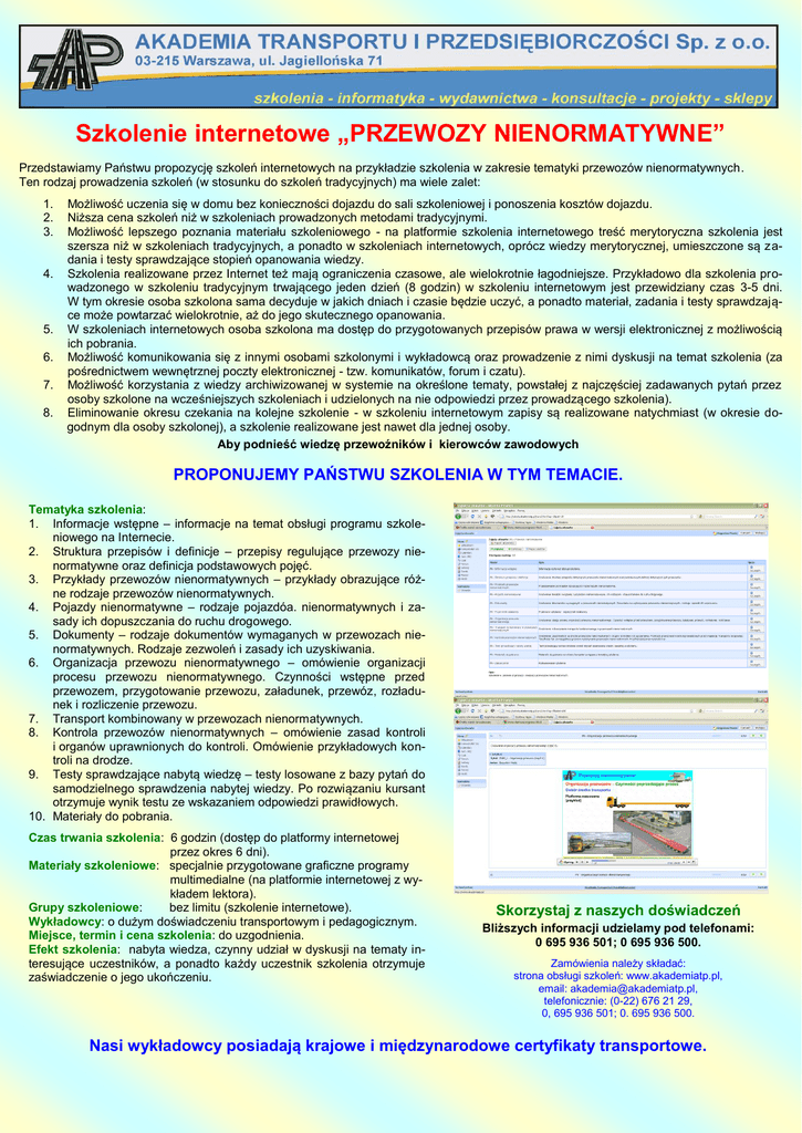 Szkolenie internetowe „PRZEWOZY NIENORMATYWNE” Przedstawiamy Państwu propozycję szkoleń internetowych na przykładzie szkolenia w zakresie tematyki przewozów nienormatywnych. Ten rodzaj prowadzenia szkoleń (w stosunku do szkoleń tradycyjnych) ma wiele zalet: 1. 2. 3. 4. 5. 6. 7. 8. Możliwość uczenia się w domu bez konieczności dojazdu do sali szkoleniowej i ponoszenia kosztów dojazdu. Niższa cena szkoleń niż w szkoleniach prowadzonych metodami tradycyjnymi. Możliwość lepszego poznania materiału szkoleniowego - na platformie szkolenia internetowego treść merytoryczna szkolenia jest szersza niż w szkoleniach tradycyjnych, a ponadto w szkoleniach internetowych, oprócz wiedzy merytorycznej, umieszczone są zadania i testy sprawdzające stopień opanowania wiedzy. Szkolenia realizowane przez Internet też mają ograniczenia czasowe, ale wielokrotnie łagodniejsze. Przykładowo dla szkolenia prowadzonego w szkoleniu tradycyjnym trwającego jeden dzień (8 godzin) w szkoleniu internetowym jest przewidziany czas 3-5 dni. W tym okresie osoba szkolona sama decyduje w jakich dniach i czasie będzie uczyć, a ponadto materiał, zadania i testy sprawdzające może powtarzać wielokrotnie, aż do jego skutecznego opanowania. W szkoleniach internetowych osoba szkolona ma dostęp do przygotowanych przepisów prawa w wersji elektronicznej z możliwością ich pobrania. Możliwość komunikowania się z innymi osobami szkolonymi i wykładowcą oraz prowadzenie z nimi dyskusji na temat szkolenia (za pośrednictwem wewnętrznej poczty elektronicznej - tzw. komunikatów, forum i czatu). Możliwość korzystania z wiedzy archiwizowanej w systemie na określone tematy, powstałej z najczęściej zadawanych pytań przez osoby szkolone na wcześniejszych szkoleniach i udzielonych na nie odpowiedzi przez prowadzącego szkolenia). Eliminowanie okresu czekania na kolejne szkolenie - w szkoleniu internetowym zapisy są realizowane natychmiast (w okresie dogodnym dla osoby szkolonej), a szkolenie realizowane jest nawet dla jednej osoby. Aby podnieść wiedzę przewoźników i kierowców zawodowych PROPONUJEMY PAŃSTWU SZKOLENIA W TYM TEMACIE. Tematyka szkolenia: 1. Informacje wstępne – informacje na temat obsługi programu szkoleniowego na Internecie. 2. Struktura przepisów i definicje – przepisy regulujące przewozy nienormatywne oraz definicja podstawowych pojęć. 3. Przykłady przewozów nienormatywnych – przykłady obrazujące różne rodzaje przewozów nienormatywnych. 4. Pojazdy nienormatywne – rodzaje pojazdóa. nienormatywnych i zasady ich dopuszczania do ruchu drogowego. 5. Dokumenty – rodzaje dokumentów wymaganych w przewozach nienormatywnych. Rodzaje zezwoleń i zasady ich uzyskiwania. 6. Organizacja przewozu nienormatywnego – omówienie organizacji procesu przewozu nienormatywnego. Czynności wstępne przed przewozem, przygotowanie przewozu, załadunek, przewóz, rozładunek i rozliczenie przewozu. 7. Transport kombinowany w przewozach nienormatywnych. 8. Kontrola przewozów nienormatywnych – omówienie zasad kontroli i organów uprawnionych do kontroli. Omówienie przykładowych kontroli na drodze. 9. Testy sprawdzające nabytą wiedzę – testy losowane z bazy pytań do samodzielnego sprawdzenia nabytej wiedzy. Po rozwiązaniu kursant otrzymuje wynik testu ze wskazaniem odpowiedzi prawidłowych. 10. Materiały do pobrania. Czas trwania szkolenia: 6 godzin (dostęp do platformy internetowej przez okres 6 dni). Materiały szkoleniowe: specjalnie przygotowane graficzne programy multimedialne (na platformie internetowej z wykładem lektora). Grupy szkoleniowe: bez limitu (szkolenie internetowe). Wykładowcy: o dużym doświadczeniu transportowym i pedagogicznym. Miejsce, termin i cena szkolenia: do uzgodnienia. Efekt szkolenia: nabyta wiedza, czynny udział w dyskusji na tematy interesujące uczestników, a ponadto każdy uczestnik szkolenia otrzymuje zaświadczenie o jego ukończeniu. Skorzystaj z naszych doświadczeń Bliższych informacji udzielamy pod telefonami: 0 695 936 501; 0 695 936 500. Zamówienia należy składać: strona obsługi szkoleń: www.akademiatp.pl, email: [email protected], telefonicznie: (0-22) 676 21 29, 0, 695 936 501; 0. 695 936 500. Nasi wykładowcy posiadają krajowe i międzynarodowe certyfikaty transportowe.
