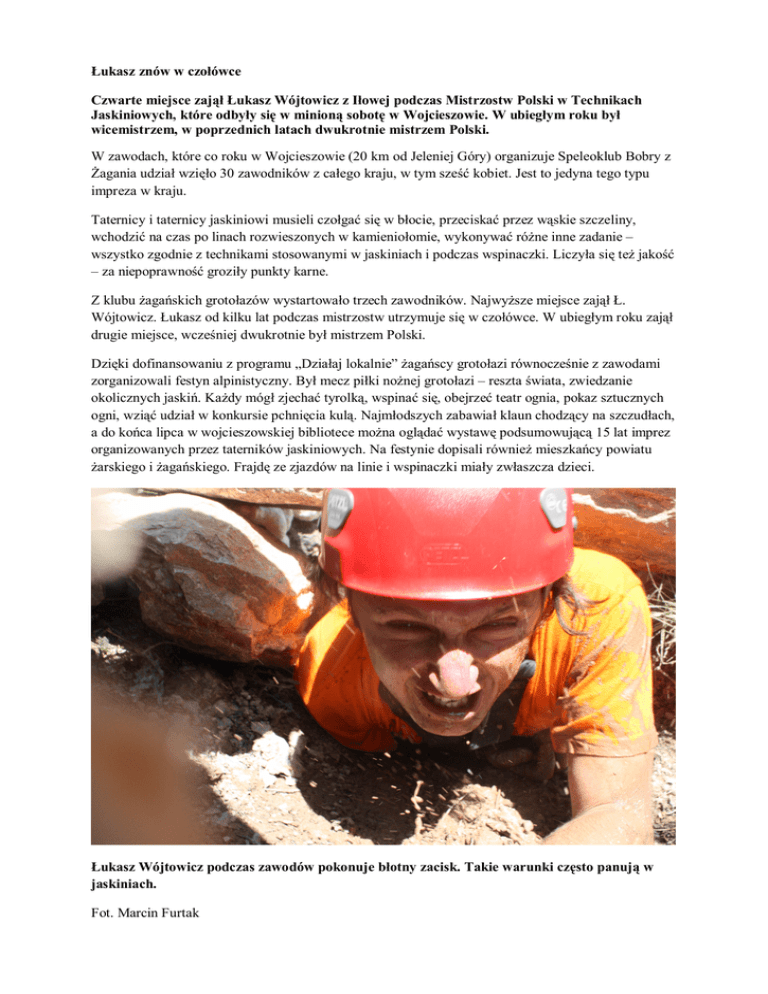 ukasz znów w czo ówce Czwarte miejsce zaj ukasz Wójtowicz z I owej podczas Mistrzostw Polski w Technikach Jaskiniowych, które odby y si w minion sobot w Wojcieszowie. W ubieg ym roku by wicemistrzem, w poprzednich latach dwukrotnie mistrzem Polski. W zawodach, które co roku w Wojcieszowie (20 km od Jeleniej Góry) organizuje Speleoklub Bobry z agania udzia wzi o 30 zawodników z ca ego kraju, w tym sze kobiet. Jest to jedyna tego typu impreza w kraju. Taternicy i taternicy jaskiniowi musieli czo ga si w b ocie, przeciska przez w skie szczeliny, wchodzi na czas po linach rozwieszonych w kamienio omie, wykonywa ró ne inne zadanie – wszystko zgodnie z technikami stosowanymi w jaskiniach i podczas wspinaczki. Liczy a si te jako – za niepoprawno grozi y punkty karne. Z klubu aga skich groto azów wystartowa o trzech zawodników. Najwy sze miejsce zaj . Wójtowicz. ukasz od kilku lat podczas mistrzostw utrzymuje si w czo ówce. W ubieg ym roku zaj drugie miejsce, wcze niej dwukrotnie by mistrzem Polski. Dzi ki dofinansowaniu z programu „Dzia aj lokalnie” aga scy groto azi równocze nie z zawodami zorganizowali festyn alpinistyczny. By mecz pi ki no nej groto azi – reszta wiata, zwiedzanie okolicznych jaski . Ka dy móg zjecha tyrolk , wspina si , obejrze teatr ognia, pokaz sztucznych ogni, wzi udzia w konkursie pchni cia kul . Najm odszych zabawia klaun chodz cy na szczud ach, a do ko ca lipca w wojcieszowskiej bibliotece mo na ogl da wystaw podsumowuj 15 lat imprez organizowanych przez taterników jaskiniowych. Na festynie dopisali równie mieszka cy powiatu arskiego i aga skiego. Frajd ze zjazdów na linie i wspinaczki mia y zw aszcza dzieci. ukasz Wójtowicz podczas zawodów pokonuje b otny zacisk. Takie warunki cz sto panuj w jaskiniach. Fot. Marcin Furtak Wsparcie mistrzostw: Burmistrz i Rada Miasta Wojcieszów, Burmistrz i Rada Miasta aga , Komisja Taternictwa Jaskiniowego przy Polskim Zwi zku Alpinizmu, Wa brzyski Klub Górski i Jaskiniowy, Starostwo Powiatu aga skiego, Starostwo Powiatu Z otoryjskiego, Grupa Ratownictwa Specjalnego PCK ary oraz Sklep Górski „Skalnik” Wroc aw, Sklep Górski „Skalnik” Jelenia Góra, Lhotse, Adam Ma achowski, Józef Drabik, Tatra Trade, Himal Sport, Sklep Górski „Tatry” Gorzów Wlkp., Polpharma Starogard Gda ski Wsparcie festynu: Burmistrz i Rada Miasta Wojcieszów, Stowarzyszenie „Sobieradzik” Wojcieszów, Wa brzyski Klub Górski i Jaskiniowy, Grupa Ratownictwa Specjalnego PCK ary Festyn dofinansowano ze rodków Programu „Dzia aj Lokalnie VI” Polsko-Ameryka skiej Fundacji Wolno ci realizowanego przez Akademi Rozwoju Filantropii w Polsce oraz Lokalnej Organizacji Grantowej – Stowarzyszenia Kaczawskiego w M ciwojowie”.