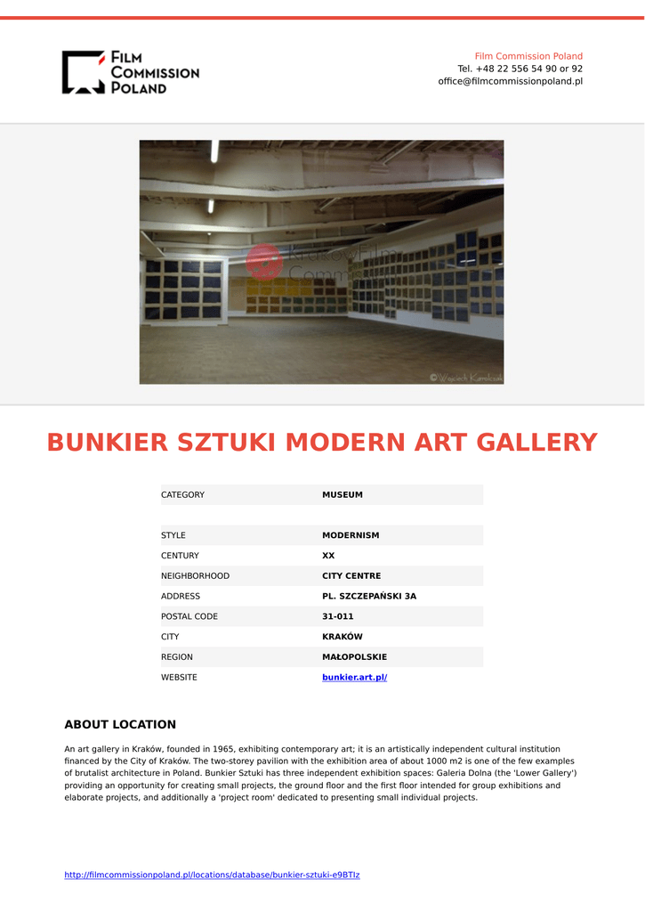 Film Commission Poland Tel. +48 22 556 54 90 or 92 office@filmcommissionpoland.pl BUNKIER SZTUKI MODERN ART GALLERY CATEGORY MUSEUM STYLE MODERNISM CENTURY XX NEIGHBORHOOD CITY CENTRE ADDRESS PL. SZCZEPAŃSKI 3A POSTAL CODE 31-011 CITY KRAKÓW REGION MAŁOPOLSKIE WEBSITE bunkier.art.pl/ ABOUT LOCATION An art gallery in Kraków, founded in 1965, exhibiting contemporary art; it is an artistically independent cultural institution financed by the City of Kraków. The two-storey pavilion with the exhibition area of about 1000 m2 is one of the few examples of brutalist architecture in Poland. Bunkier Sztuki has three independent exhibition spaces: Galeria Dolna (the 'Lower Gallery') providing an opportunity for creating small projects, the ground floor and the first floor intended for group exhibitions and elaborate projects, and additionally a 'project room' dedicated to presenting small individual projects. http://filmcommissionpoland.pl/locations/database/bunkier-sztuki-e9BTIz