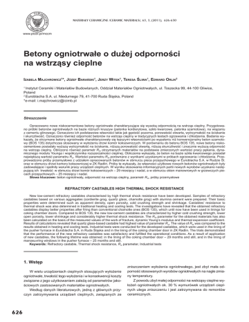 MATERIA£Y CERAMICZNE /CERAMIC MATERIALS/, 63, 3, (2011), 626-630 www.ptcer.pl/mccm Betony ogniotrwaáe o duĪej odpornoĞci na wstrząsy cieplne IZABELA MAJCHROWICZ1*, JÓZEF BARAēSKI1, JERZY WITEK1, TERESA ĝLIWA1, EDWARD ORLIK2 Instytut Ceramiki i Materiaáów Budowlanych, Oddziaá Materiaáów Ogniotrwaáych, ul. Toszecka 99, 44-100 Gliwice, Poland 2 Euroblacha S.A. ul. Niedurnego 79, 41-700 Ruda ĝląska, Poland *e-mail: [email protected] 1 Streszczenie Opracowano nowe niskocementowe betony ogniotrwaáe charakteryzujące siĊ wysoką odpornoĞcią na wstrząs cieplny. Przygotowano próbki betonów ogniotrwaáych na bazie róĪnych kruszyw (palonka kordierytowa, szkáo kwarcowe, palonka szamotowa), na wiązaniu z cementu glinowego. Oznaczono ich podstawowe wáasnoĞci takie jak gĊstoĞü pozorna, porowatoĞü otwarta, wytrzymaáoĞü na Ğciskanie i skurczliwoĞü. Oznaczono równieĪ odpornoĞü betonów na wstrząs cieplny w tradycyjnych testach ogrzewania i cháodzenia. Badania wykazaáy, Īe otrzymane betony ogniotrwaáe charakteryzowaáy siĊ lepszymi wáasnoĞciami po wypaleniu niĪ konwencjonalny beton szamotowy (BOS 135) dotychczas stosowany w wyáoĪeniu drzwi komór koksowniczych. W porównaniu do betonu BOS 135, nowe betony niskocementowe posiadaáy wyĪszą wytrzymaáoĞü na Ğciskanie, niĪszą porowatoĞü otwartą, niĪszą skurczliwoĞü i znacznie wyĪszą odpornoĞü na wstrząs cieplny. Obliczono równieĪ parametr RSt otrzymanych materiaáów na podstawie zmierzonych wartoĞci pracy pĊkania, dynamicznego moduáu Younga i wspóáczynnika rozszerzalnoĞci cieplnej. Obliczenia wykazaáy, Īe beton na bazie szkáa kwarcowego posiadaá najwiĊkszą wartoĞü parametru Rst. WartoĞci parametru RSt porównano z wynikami uzyskanymi w próbach ogrzewania i cháodzenia. Przeprowadzono próby przemysáowe z udziaáem opracowanych betonów w obmurzu pieca przepychowego w Euroblacha S.A. w Rudzie ĝl. oraz w obmurzu drzwi komory koksowniczej w ZK Radlin. Próby te wykazaáy, Īe wáasnoĞci uĪytkowe nowych betonów ogniotrwaáych byáy zadowalające i speániáy warunki pracy urządzeĔ cieplnych. W wyniku stosowania informacyjnych partii nowych wyrobów uzyskano nastĊpującą ich trwaáoĞü: w obmurzu drzwi komór koksowniczych – 29 miesiĊcy i nadal, a w obmurzu okien manewrowych w grzewczych piecach przepychowych – 25 miesiĊcy i nadal. Sáowa kluczowe: beton ogniotrwaáy, odpornoĞü na wstrząs cieplny, parametr Rst, próby przemysáowe REFRACTORY CASTABLES HIGH THERMAL SHOCK RESISTANCE New low-cement refractory castables characterised by high thermal shock resistance have been developed. Samples of refractory castables based on various aggregates (cordierite grog, quartz glass, chamotte grog) with alumina cement were prepared. Their basic properties were determined such as apparent density, open porosity, cold crushing strength and shrinkage. Castables’ resistance to thermal shock was also determined in traditional heating and cooling tests. The investigations have revealed that the obtained refractory castables display better properties after ¿ring than conventional chamotte ones (BOS 135), which until now have been used in linings for coking chamber doors. Compared to BOS 135, the new low-cement castables are characterized by higher cold crushing strength, lower open porosity, lower shrinkage and considerably higher thermal shock resistance. The RSt parameter for the obtained materials has also been calculated on the basis of the measured values of the work of fracture, dynamic Young’s modulus and thermal expansion coef¿cient. Results of calculations revealed that quartz glass-based castable had highest value of parameter Rst. The value of RSt was compared to the results obtained in heating and cooling tests. Industrial tests were conducted for the developed castables, which were used in the lining of the pusher furnace in Euroblacha S.A. in Ruda ĝląska and in the lining of the coking chamber door in ZK Radlin. The trials demonstrated that the performance of the new refractory castables was satisfactory and ful¿lled the operational conditions. As a result of application of new castables, the following lifetime was obtained: in the lining of the coking chamber door – 29 months and still, and in the lining of manoeuvring windows in the pusher furnace – 25 months and still. Keywords: Refractory castable, Thermal shock resistance, Rst parameter, Industrial tests 1. WstĊp W wielu urządzeniach cieplnych stosujących wyáoĪenie ogniotrwaáe, trwaáoĞü tego wyáoĪenia i w konsekwencji koszty związane z jego uĪytkowaniem zaleĪą od parametrów jakoĞciowych zastosowanych materiaáów ogniotrwaáych. Wedáug danych literaturowych, jedną z gáównych przyczyn zatrzymywania urządzeĔ cieplnych, związanych ze 626 zniszczeniem wyáoĪenia ogniotrwaáego, jest zbyt maáa odpornoĞü stosowanych wyrobów ogniotrwaáych na nagáe zmiany temperatury. Z powodu zbyt maáej odpornoĞci na wstrząsy cieplne wyáoĪeĔ ogniotrwaáych ok. 30 % wymurówek urządzeĔ cieplnych ulega zniszczeniu i jest zatrzymywana do remontów ceramicznych. BETONY OGNIOTRWAàE O DUĩEJ ODPORNOĝCI NA WSTRZĄSY CIEPLNE SpoĞród wielu urządzeĔ cieplnych, w których wymurówka naraĪona jest na czĊste wstrząsy cieplne, naleĪy wymieniü obmurze regeneratorów oraz drzwi komór w bateriach koksowniczych, obmurze pieców grzewczych (pokrocznych, przepychowych) i pieców do obróbki cieplnej w strefach wysadowych, a takĪe obmurze górnego obszaru Ğcian i pokrywy pieców wgáĊbnych eksploatowanych w hutnictwie Īelaza i stali. Tradycyjnie, jako wyáoĪenie ogniotrwaáe drzwi komór koksowniczych stosuje siĊ wyroby szamotowe w gatunku As lub prefabrykaty z szamotowego betonu ogniotrwaáego w gatunku BOS 135. WáasnoĞci tych materiaáów przedstawiono w Tabeli 1. Tabela 1. WáasnoĞci wyrobów w gatunku As i betonu ogniotrwaáego BOS 135. Table 1. Properties of As grade bric