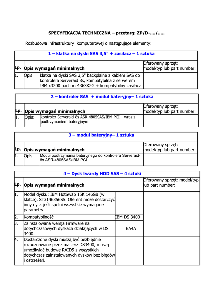 SPECYFIKACJA TECHNICZNA – przetarg: ZP/D-..../..... Rozbudowa infrastruktury komputerowej o następujące elementy: 1 – klatka na dyski SAS 3,5" + zasilacz – 1 sztuka Lp. Opis wymagań minimalnych 1. Opis: Oferowany sprzęt: model/typ lub part number: klatka na dyski SAS 3,5" backplaine z kablem SAS do kontrolera Serveraid 8s, kompatybilna z serwerem IBM x3200 part nr: 4363K2G + kompatybilny zasilacz 2 – kontroler SAS + moduł bateryjny– 1 sztuka Lp. Opis wymagań minimalnych 1. Opis: kontroler Serveraid-8s ASR-4805SAS/IBM PCI – wraz z Oferowany sprzęt: model/typ lub part number: podtrzymaniem bateryjnym 3 – moduł bateryjny– 1 sztuka Oferowany sprzęt: Lp. Opis wymagań minimalnych model/typ lub part number: 1. Opis: Moduł podtrzymania bateryjnego do kontrolera Serveraid8s ASR-4805SAS/IBM PCI 4 – Dysk twardy HDD SAS – 4 sztuki Lp. Opis wymagań minimalnych 1. Model dysku: IBM HotSwap 15K 146GB (w klatce), ST3146356SS. Oferent może dostarczyć inny dysk jeśli spełni wszystkie wymagane parametry. 2. 3. Kompatybilność IBM DS 3400 Zainstalowana wersja Firmware na dotychczasowych dyskach działających w DS BA4A 3400: Dostarczone dyski muszą być bezbłędnie rozpoznawane przez macierz DS3400, muszą umożliwiać budowę RAID5 z wszystkich dotychczas zainstalowanych dysków bez błędów i ostrzeżeń. 4. Oferowany sprzęt: model/typ lub part number: 5 – Urządzenie wielofunkcyjne monochromatyczne – 3 sztuki Oferowany sprzęt: model/typ lub part number: l.p. Funkcje Drukowanie, kopiowanie, skanowanie, faksowanie 1. 2. 3. 4. 5. 6. 7. 8. Standardowe języki drukarki Rozdzielczość druku: Technologia druku Prędkość druku Czas wydruku pierwszej strony: Druk dwustronny Skanowanie kolorowe Typ skanera 9. Rozdzielczość skanowania PCL 6, PCL 5 min. 600 x 600 dpi w trybie normal Druk laserowy czarnobiały (A4): min. 25 str./min maks. 8,5 s TAK TAK Skaner płaski, automatyczny podajnik dokumentów Optymalizowana: Do 19200 dpi; Urządzenie: Do 1200 x 1200 dpi; Do 1200 dpi min 15 str./min; Czarny (tryb normalny): min 15 str./min; ADF: min 15 str./min JPEG, TIF, BMP, GIF, PDF, PNG TAK 10. Optyczny: 11. Szybkość skanowania 12. Format pliku skanowania 13. Tryby skanowania Przyciski skanowania, kopiowania i faksowania na frontowym panelu sterowania 14. Format skanowania 15. Rozdzielczość kopiowania 16. Prędkość kopiowania 17. Skala zmiany rozmiarów w kopiarce 18. Rozdzielczość faksu 19. 20. 21. 22. 23. 24. 25. 26. 27. 28. 29. Szybkość faksu cechy faksowania Obsługiwana automatyczna redukcja faksu Opóźnione wysyłanie Automatyczne powtarzanie numeru: obsługiwanie przekazywanie faksów: Obsługiwany interfejs faksu/telefonu/automatycznej sekretarki: Obsługiwane odpytywanie faksu Obsługiwany tryb telefonu z faksem Obsługiwana funkcja blokady niepożądanych faksów. liczba numerów szybkiego wybierania: Płaski: min. A4 Czarny (tekst i grafika): Do 600 x 600 dpi; Kolor (tekst i grafika): Do 600 x 600 dpi (efektywna rozdzielczość 1200 dpi) Czarny (A4): Do 25 kopii/min 25 do 400% Czarno-biały, tryb best: Maksymalnie 300 x 300 dpi (półtony włączone); Czarno-biały, tryb standard: 203 x 98 dpi Do 3 sekund na stronę Pamięć faksu (A4): Do 400 stron; TAK TAK TAK TAK TAK TAK (tylko odbieranie) TAK TAK min. 120 Spełnia parametry (TAK/NIE) 30. 31. 32. 33. port Hi-Speed USB 2.0 Port sieciowy 10/100 Ethernet Port modem/FAX przygotowany do pracy w sieci: Wbudowana karta sieciowa 34. Panel sterowania - rodzaj wyświetlacza 35. alfanumeryczne przyciski na panelu sterowania 36. Przyciski kopiowania (Start, Zmniejszenie/Powiększenie, Jaśniej/Ciemniej, Menu, Liczba kopii) 37. Przyciski faksu (Start, Książka telefoniczna, Menu, Ponowne wybieranie numeru, Szybkie wybieranie numerów) 38. Pamięć Maksimum/Standard 39. szybkość procesora 40. wydruk z dupleksem 41. automatyczny podajnik dokumentów 42. podajnik papieru 43. podajnik szczelinowy papieru z priorytetem pobory 44. Gramatura mediów Podajnik 45. zakres wymiaru papieru dla podajnika szczelinowego z priorytetem poboru 46. Nośniki Papier (wysoko- i niskogramaturowy, firmowy, zwykły, wstępnie zadrukowany, dziurkowany, ekologiczny, szorstki), koperty, przeźrocza, etykiety, pocztówki 47. odbiornik papieru TAK TAK TAK TAK Min Dwuwierszowy wyświetlacz tekstowy LCD TAK TAK TAK Min 128 MB min. 500 MHz TAK TAK, min. 35 arkuszy TAK, min. 250 arkuszy TAK, min. 10 arkuszy od 60 do 163 g/m˛ 76 x 127 do 216 x 356 mm TAK TAK, min. 100 arkuszy 48. Zasilanie Typ zasilacza: Wbudowany zasilacz 49. Zasilanie: 230V 50. Pełna instalacja oprogramowania w systemach: 52. Waga produktu +/- 0,5 kg Windows®7 32-bitowy i 64-bitowy, Windows® Vista 32-bitowy i 64-bitowy, Microsoft® Windows® XP 32-bitowy (SP2 lub nowszy) Microsoft® Windows® Server 2003 32bitowy (SP3 lub nowszy), Server 2008 32-bitowy i 64-bitowy; Mac OS X; Linpus Linux (9.4, 9.5), RED HAT Enterprise Linux 5.0; SUSE Linux (10.3, 11.0, 11, 11.1, 11.2), Fedora™ (9, 9.0, 10, 10.0, 11.0, 11, 12, 12.0), Ubuntu® (8.04, 8.04.1, 8.04.2, 8.10, 9.04, 9.10, 10.04), Debian (5.0, 5.0.1, 5.0.2, 5.0.3) 11,5 kg 53. gwarancja 12 miesięcy 54. Inne dołączony kabel USB 2.0 dł. 1,8m 51. instalacja samych sterowników w systemach 55. tonery 56. Certyfikaty dodatkowe 2 tonery do każdego urządzenia Przepisy FCC nr 47 CFR, GB92541998, dyrektywa EMC 2004/108/EC ze znakiem CE (Europa) ENERGY STAR:TAK; Telekomunikacja: ES 203 021, Dyrektywa R&TTE 6 – Inne Lp. Opis wymagań minimalnych 1. Norton Ghost 15.0 – 1 szt. 2. 3. Drukarka laserowa mono HP 2055dn lub równoważna 1 szt. Microsoft Visio 2010 Professional PL BOX – 1 szt. Oferowany sprzęt: model/typ lub part number: