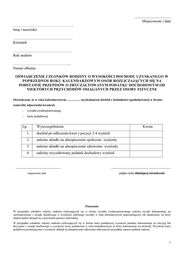 ....................................... Miejscowość i data …………………………………………. Imię i nazwisko ………………………………………… Kierunek ………………………………………… Rok studiów ……………………………………….. Numer albumu OŚWIADCZENIE CZŁONKÓW RODZINY O WYSOKOŚCI DOCHODU UZYSKANEGO W POPRZEDNIM ROKU KALENDARZOWYM OSÓB ROZLICZAJĄCYCH SIĘ NA PODSTAWIE PRZEPISÓW O ZRYCZAŁTOWANYM PODATKU DOCHODOWYM OD NIEKTÓRYCH PRZYCHODÓW OSIĄGANYCH PRZEZ OSOBY FIZYCZNE Oświadczam, że w roku kalendarzowym ................. uzyskałam/em dochód z działalności opodatkowanej w formie: (zakreślić odpowiedni kwadrat) ryczałtu ewidencjonowanego karty podatkowej Wyszczególnienie Lp. Kwota 1. dochód po odliczeniu kwot z pozycji 2-4 wyniósł 2. należne składki na ubezpieczenie społeczne wyniosły 3. należne składki na ubezpieczenie zdrowotne wyniosły 4. należny zryczałtowany podatek dochodowy wyniósł ........................................................ .......................................................................... podpis osoby składającej oświadczenie miejscowość, data Pouczenie W przypadku członków rodziny studenta rozliczających się w formie ryczałtu ewidencjonowanego należny ryczałt dokumentuje się zaświadczeniem Z urzędu skarbowego o wysokości należnego ryczałtu w roku kalendarzowym poprzedzającym rok akademicki, na który student będzie ubiegał się o przyznanie pomocy materialnej. W przypadku członków rodziny studenta rozliczających się w formie karty podatkowej wysokość podatku dokumentuje się decyzją lub decyzjami z urzędu skarbowego o wysokości karty podatkowej w roku kalendarzowym za który dokumentuje się dochody. Wysokość karty podatkowej pomniejszona o wysokość składek na ubezpieczenie zdrowotne odliczanych od podatku stanowi podatek należny. 1
