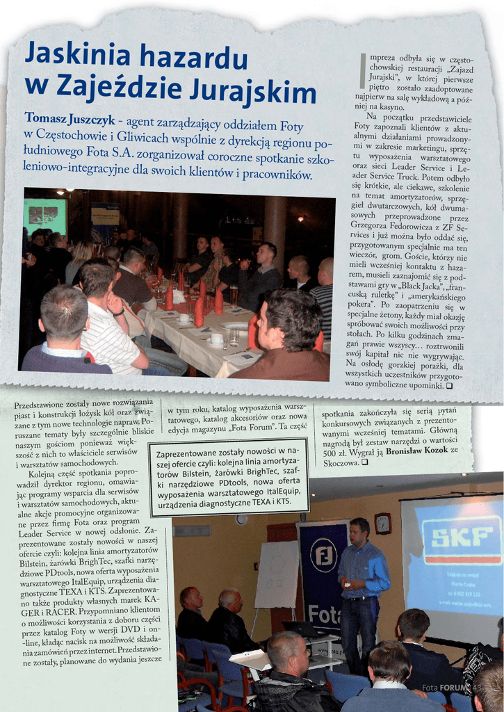 Jaskinia hazardu w Zajeździe Jurajskim I Tomasz Juszczyk - agent zarządzający oddziałem Foty w Częstochowie i Gliwicach wspólnie z dyrekcją regionu południowego Fota S.A. zorganizował cor oczne spotkanie szkoleniowo-integracyjne dla swoich klien tów i pracowników. iaa ania ą an ązan ąz wiiiąza ozw oz we rrozw we now ały no ał s ały stał ost zost nee zo on ione wio dstaw d zeedsta z zPrze Pr P w rrssszwa nia war ni enia żżeni saże oosaż posa wyp llogg wy talo kata rokku, kka w tym roku zwią oraz kół sk a piast i konstrukcji łoży now tatowego, katalog akcesoriów oraz Poć zane z tym nowe technologie napraw. częś Ta edycja magazynu „Fota Forum”. ie ruszane tematy były szczególnie blisk naszym gościom ponieważ więkw naZaprezentowane zostały nowości szość z nich to właściciele serwisów rtyzaszej ofercie czyli: kolejna linia amo i warsztatów samochodowych. szafKolejną część spotkania poprotorów Bilstein, żarówki BrighTec, oferta wadził dyrektor regionu, omawiaki narzędziowe PDtools, nowa quip, jąc programy wsparcia dla serwisów wyposażenia warsztatowego ItalE . i warsztatów samochodowych, aktu urządzenia diagnostyczne TEXA i KTS waalne akcje promocyjne organizo ne przez firmę Fota oraz program ZaLeader Service w nowej odsłonie. ej nasz w ości now prezentowane zostały ów ator rtyz amo linia ofercie czyli: kolejna ęBilstein, żarówki BrighTec, szafki narz enia osaż wyp ta ofer a now dziowe PDtools, diawarsztatowego ItalEquip, urządzenia antow reze Zap . KTS i A gnostyczne TEX KA ek mar nych włas ukty prod no także tom GER i RACER. Przypomniano klien ci o możliwości korzystania z doboru częś oni D przez katalog Foty w wersji DV da-line, kładąc nacisk na możliwość skła wio dsta Prze . nia zamówień przez internet cze jesz ania wyd ne zostały, planowane do mpreza odbyła się w częstochowskiej restauracji „Zajazd Jurajski”, w której pier wsze piętro zostało zaadoptowane najpierw na salę wykładową a później na kasyno. Na początku przedstawiciele Foty zapoznali klientów z aktualnymi działaniami prowadzonymi w zakresie marketingu, sprzętu wyposażenia warsztatowego oraz sieci Leader Service i Leader Service Truck. Potem odbyło się krótkie, ale ciekawe, szkolenie na temat amortyzatorów, sprzęgieł dwutarczowych, kół dwumasowych przeprowadzone przez Grzegorza Fedorowicza z ZF Services i już można było oddać się, przygotowanym specjalnie ma ten wieczór, grom. Goście, którzy nie mieli wcześniej kontaktu z hazarem, musieli zaznajomić się z podstawami gry w „Black Jacka”, „francuską ruletkę” i „amerykańskiego pokera”. Po zaopatrzeniu się w specjalne żetony, każdy miał okazję spróbować swoich możliwości przy stołach. Po kilku godzinach zmagań prawie wszyscy… roztrwonili swój kapitał nic nie wygrywając. Na osłodę gorzkiej porażki, dla wszystkich uczestników przygotowano symboliczne upominki.  ń y ań yt pyta ię seriąą p łaa się czyła ńczy koń z ko za niaa zako kan k ni otka pot spot konkursowych związanych z prezento wną wanymi wcześniej tematami. Głó i nagrodą był zestaw narzędzi o wartośc ze ok Koz 500 zł. Wygrał ją Bronisław Skoczowa.  Fota FORUM 43