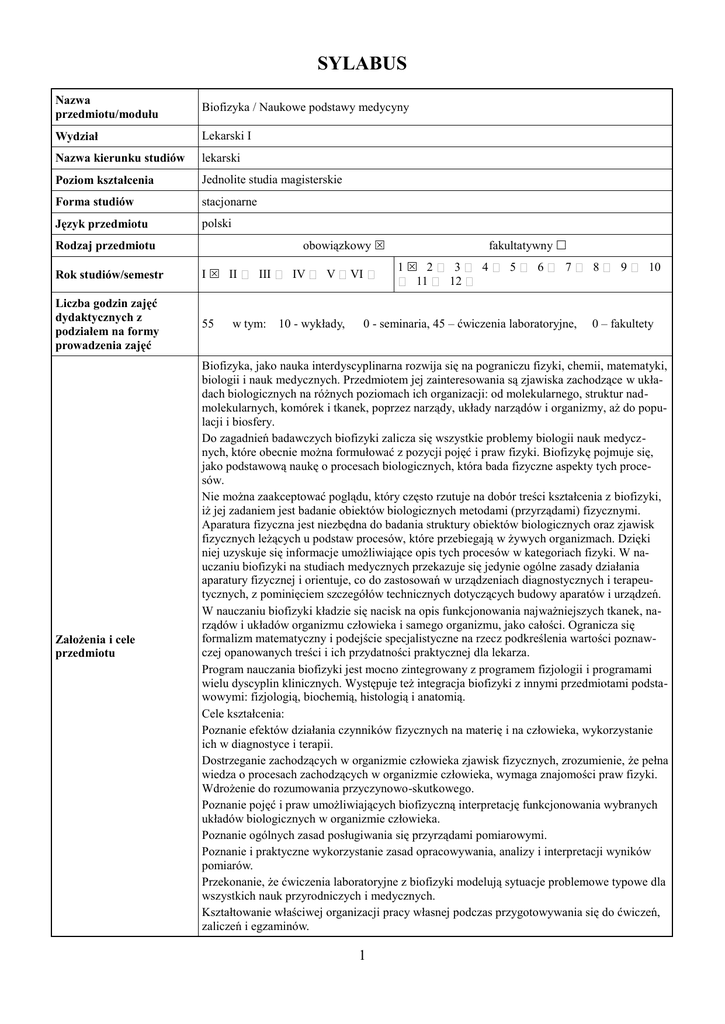 SYLABUS Nazwa przedmiotu/modułu Biofizyka / Naukowe podstawy medycyny Wydział Lekarski I Nazwa kierunku studiów lekarski Poziom kształcenia Jednolite studia magisterskie Forma studiów stacjonarne Język przedmiotu polski obowiązkowy Rodzaj przedmiotu fakultatywny 1 2 11 3 12 4 5 6 7 8 9 10 Rok studiów/semestr I II Liczba godzin zajęć dydaktycznych z podziałem na formy prowadzenia zajęć 55 Założenia i cele przedmiotu Biofizyka, jako nauka interdyscyplinarna rozwija się na pograniczu fizyki, chemii, matematyki, biologii i nauk medycznych. Przedmiotem jej zainteresowania są zjawiska zachodzące w układach biologicznych na różnych poziomach ich organizacji: od molekularnego, struktur nadmolekularnych, komórek i tkanek, poprzez narządy, układy narządów i organizmy, aż do populacji i biosfery. Do zagadnień badawczych biofizyki zalicza się wszystkie problemy biologii nauk medycznych, które obecnie można formułować z pozycji pojęć i praw fizyki. Biofizykę pojmuje się, jako podstawową naukę o procesach biologicznych, która bada fizyczne aspekty tych procesów. Nie można zaakceptować poglądu, który często rzutuje na dobór treści kształcenia z biofizyki, iż jej zadaniem jest badanie obiektów biologicznych metodami (przyrządami) fizycznymi. Aparatura fizyczna jest niezbędna do badania struktury obiektów biologicznych oraz zjawisk fizycznych leżących u podstaw procesów, które przebiegają w żywych organizmach. Dzięki niej uzyskuje się informacje umożliwiające opis tych procesów w kategoriach fizyki. W nauczaniu biofizyki na studiach medycznych przekazuje się jedynie ogólne zasady działania aparatury fizycznej i orientuje, co do zastosowań w urządzeniach diagnostycznych i terapeutycznych, z pominięciem szczegółów technicznych dotyczących budowy aparatów i urządzeń. W nauczaniu biofizyki kładzie się nacisk na opis funkcjonowania najważniejszych tkanek, narządów i układów organizmu człowieka i samego organizmu, jako całości. Ogranicza się formalizm matematyczny i podejście specjalistyczne na rzecz podkreślenia wartości poznawczej opanowanych treści i ich przydatności praktycznej dla lekarza. Program nauczania biofizyki jest mocno zintegrowany z programem fizjologii i programami wielu dyscyplin klinicznych. Występuje też integracja biofizyki z innymi przedmiotami podstawowymi: fizjologią, biochemią, histologią i anatomią. Cele kształcenia: Poznanie efektów działania czynników fizycznych na materię i na człowieka, wykorzystanie ich w diagnostyce i terapii. Dostrzeganie zachodzących w organizmie człowieka zjawisk fizycznych, zrozumienie, że pełna wiedza o procesach zachodzących w organizmie człowieka, wymaga znajomości praw fizyki. Wdrożenie do rozumowania przyczynowo-skutkowego. Poznanie pojęć i praw umożliwiających biofizyczną interpretację funkcjonowania wybranych układów biologicznych w organizmie człowieka. Poznanie ogólnych zasad posługiwania się przyrządami pomiarowymi. Poznanie i praktyczne wykorzystanie zasad opracowywania, analizy i interpretacji wyników pomiarów. Przekonanie, że ćwiczenia laboratoryjne z biofizyki modelują sytuacje problemowe typowe dla wszystkich nauk przyrodniczych i medycznych. Kształtowanie właściwej organizacji pracy własnej podczas przygotowywania się do ćwiczeń, zaliczeń i egzaminów. III w tym: IV V 10 - wykłady, VI 0 - seminaria, 45 – ćwiczenia laboratoryjne, 1 0 – fakultety Kształtowanie umiejętności pracy w zespole podczas wykonywania ćwiczeń. Symbol efektów kształcenia zgodnie ze standardami OPIS KIERUNKOWYCH EFEKTÓW KSZTAŁCENIA WIEDZA (ZGODNIE ZE SZCZEGÓŁOWYMI EFEKTAMI KSZTAŁCENIA) B.W3. zna i rozumie pojęcia: rozpuszczalność, ciśnienie osmotyczne, izotonia, roztwory koloidalne i równowaga Gibbsa-Donnana; B.W5. zna prawa fizyczne opisujące przepływ cieczy oraz czynniki wpływające na opór naczyniowy przepływu krwi; B.W6. zna naturalne i sztuczne źródła promieniowania jonizującego oraz jego oddziaływanie z materią; B.W7. zna fizykochemiczne i molekularne podstawy działania narządów zmysłów; B.W8. zna fizyczne podstawy nieinwazyjnych metod obrazowania; B.W9. zna fizyczne podstawy wybranych technik terapeutycznych, w tym ultradźwięków i naświetlań; B.W11. opisuje budowę lipidów i polisacharydów oraz ich funkcje w strukturach komórkowych i pozakomórkowych; B.W24. zna podstawy pobudzenia i przewodzenia w układzie nerwowym a także fizjologię mięśni prążkowanych i gładkich oraz funkcje krwi; B.W25. zna czynność i mechanizmy regulacji wszystkich narządów i układów organizmu człowieka, w tym układu: krążenia, oddechowego, moczowego; B.W34. zna zasady prowadzenia badań naukowych, obserwacyjnych i doświadczalnych oraz badań in vitro służących rozwojowi medycyny; E.W38. zna podstawy teoretyczne i praktyczne diagnostyki laboratoryjnej; Metody weryfikacji osiągnięcia zamierzonych efektów kształcenia: sprawdziany przed ćwiczeniami, wykonywanie ćwiczeń, sporządzanie protokółów, zaliczenie, egzamin UMIEJĘTNOŚCI (ZGODNIE ZE SZCZEGÓŁOWYMI EFEKTAMI KSZTAŁCENIA) A.U1. obsługuje mikroskop optyczny – także w zakresie korzystania z immersji; B.U1. wykorzystuje znajomość praw fizyki do wyjaśnienia wpływu czynników zewnętrznych, takich jak temperatura, przyspieszenie, ciśnienie, pole elektromagnetyczne oraz promieniowanie jonizujące, na organizm i jego elementy; B.U2. ocenia szkodliwość dawki promieniowania jonizującego i stosuje się do zasad ochrony radiologicznej; B.U3. oblicza stężenia molowe i procentowe związków oraz stężenia substancji w roztworach; B.U6. przewiduje kierunek procesów biochemicznych; B.U7. opisuje zmiany w funkcjonowaniu organizmu w sytuacji zaburzenia homeostazy, określa jego odpowiedź na ekspozycję na wysoką i niską temperaturę, utratę wody, nagłą pionizację B.U10. obsługuje proste przyrządy pomiarowe oraz ocenia