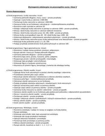 Wymagania edukacyjne na poszczególne oceny klasa V Ocena dopuszczająca: a) Dział programowy: Liczby naturalne. Uczeń: • Zamienia jednostki długości, masy, czasu – proste przykłady. • Zapisuje i czyta liczby w zakresie 1 000 000. • Porównuje liczby naturalne w zakresie 1 000 000. • Zaznacza liczby na osi liczbowej i odczytuje je – nieskomplikowane przykłady. • Rozróżnia znaki rzymskie w zakresie 50. • Dodaje i odejmuje liczby naturalne w pamięci w zakresie 1000 – proste przykłady. • Mnoży i dzieli liczby naturalne w zakresie tabliczki mnożenia. • Mnoży i dzieli liczby naturalne przez 10, 100, 1000 – proste przykłady. • Mnoży liczby w przypadkach typu 40 · 30 i dzieli liczby typu 1200 : 60. • Wykonuje dodawanie i odejmowanie sposobem pisemnym – proste przykłady. • Mnoży i dzieli liczby naturalne przez liczby jednocyfrowe oraz dwucyfrowe – proste przypadki • Wskazuje liczby podzielne przez 2, 5, 10, 100. • Podaje przykłady wielokrotności liczb jednocyfrowych w zakresie 100. b) Dział programowy: Figury geometryczne. Uczeń: • Rozróżnia i nadaje nazwy punktom, prostym, półprostym. • Rysuje odcinki i mierzy je. Podaje jednostki długości. • Zamienia jednostki długości – proste przypadki. • Rozróżnia kąty ostre, proste, rozwarte, pełne, półpełne. • Rozpoznaje proste i odcinki prostopadłe i równoległe. • Wskazuje kąty przyległe i wierzchołkowe. • Wskazuje figury o budowie symetrycznej. • Wyznacza oś symetrii figury, korzystając z lusterka lub składając kartkę. c) Dział programowy: Ułamki zwykłe. Uczeń: • Zapisuje iloraz liczb naturalnych w postaci ułamka zwykłego i odwrotnie. • Przedstawia ułamek jako część całości. • Wyszukuje ułamki właściwe i niewłaściwe w zbiorze ułamków zwykłych. • Zaznacza pola figur – nieskomplikowane przykłady. • Odczytuje ułamki zaznaczone na osi liczbowej. • Podaje przykłady ułamków właściwych, niewłaściwych, liczb mieszanych. • Opisuje zaznaczoną część całości za pomocą ułamka. • Zapisuje część całości za pomocą ułamka – proste przypadki. • Zamienia liczby mieszane na ułamki i odwrotnie – proste przypadki. • Zaznacza ułamki zwykłe na osi liczbowej, gdy podana jest jednostka z odpowiednim jej podziałem. • Skraca i rozszerza ułamki zwykłe – proste przykłady. • Porównuje ułamki – proste przykłady. • Dodaje i odejmuje ułamki o jednakowych i różnych mianownikach – proste przykłady. • Mnoży ułamki zwykłe – proste przykłady. • Dzieli ułamki zwykłe – proste przykłady. d) Dział programowy: Wielokąty. Uczeń: • Rozróżnia wielokąty i nadaje im nazwy ze względu na liczbę boków. • Rysuje wielokąty. • Wskazuje wierzchołki, boki, kąty wewnętrzne wielokąta. • Wskazuje lub rysuje przekątne wielokąta. • Opisuje własności kwadratu i prostokąta. • Porównuje boki prostokąta za pomocą cyrkla. • Oblicza obwód wielokąta – proste przypadki. • Rysuje odcinki, kwadraty w skali 1 : 1, 1 : 2, 2 : 1. e) Dział programowy: Wyrażenia algebraiczne. Uczeń: • Odróżnia wyrażenia arytmetyczne od algebraicznych. • Zapisuje i czyta proste wyrażenia algebraiczne. • Rozwiązuje równania pierwszego stopnia z jedną niewiadomą, występującą po jednej stronie równania, poprzez zgadywanie. f) Dział programowy: Trójkąty. Uczeń: • Rozróżnia trójkąty różnoboczne, równoramienne, równoboczne. • Rozróżnia trójkąty ostrokątne, prostokątne, rozwartokątne. • Wymienia niektóre cechy dowolnego trójkąta. • Wskazuje na rysunku wysokość trójkąta. • Rozwiązuje bardzo proste zadania, dotyczące trójkątów. g) Dział programowy: Ułamki dziesiętne. Uczeń: • Podaje przykłady ułamków dziesiętnych. • Wskazuje ułamki dziesiętne w danym zbiorze liczb. • Odczytuje i zapisuje ułamki dziesiętne – proste przykłady. • Odczytuje ułamki dziesiętne zaznaczone na osi liczbowej – proste przykłady. • Wykonuje dodawanie i odejmowanie ułamków dziesiętnych w pamięci (w najprostszych przykładach) i pisemnie – proste przypadki – oraz za pomocą kalkulatora (w trudniejszych przykładach). • Mnoży i dzieli ułamki dziesiętne przez 10, 100, 1000. • Dzieli proste ułamki dziesiętne w pamięci (w najprostszych przykładach) lub korzysta z kalkulatora. • Wykonuje działania na ułamkach zwykłych i dziesiętnych typu : + 0,2. h) Dział programowy: Czworokąty. Uczeń: • Rozróżnia prostokąty, kwadraty, romby, równoległoboki, trapezy. • Rysuje poznane czworokąty i nazywa je. • Rysuje przekątne czworokątów. • Oblicza obwody czworokątów, gdy długości boków są wyrażone w jednakowych jednostkach. • Wymienia podstawowe własności poznanych czworokątów. i) Dział programowy: Liczby całkowite. Uczeń: • Podaje przykłady liczb całkowitych dodatnich i ujemnych. • Podaje praktyczne przykłady stosowania liczb ujemnych. • Odczytuje liczby całkowite zaznaczone na osi liczbowej – proste przykłady. • Zaznacza liczby całkowite na osi liczbowej – proste przykłady • Dodaje i odejmuje jednocyfrowe liczby całkowite. j) Dział programowy: Pola figur płaskich. Uczeń: • Wymienia jednostki pola. • Zamienia jednostki pola w prostych przypadkach typu: 2cm2= 200mm2, 1m2= 100dm2 • Patrząc na rysunek figury i zaznaczone na nim dane, oblicza pole znanego czworokąta. k) Dział programowy: Ułamki dziesiętne o mianowniku 100. Uczeń: • Określa pojęcie procentu. • Odczytuje procent, zaznaczony na prostokącie, zbudowanym ze 100 prostokątów jednostkowych. • Oblicza 50%, 25% danej liczby, korzystając z rysunku. l) Dział programowy: Graniastosłupy. Uczeń: • Wyróżnia wśród modeli brył sześcian i prostopadłościan. • Pokazuje na modelach graniastosłupów wierzchołki, krawędzie, ściany. • Wymienia podstawowe jednostki pola i objętości. • Rozcina p