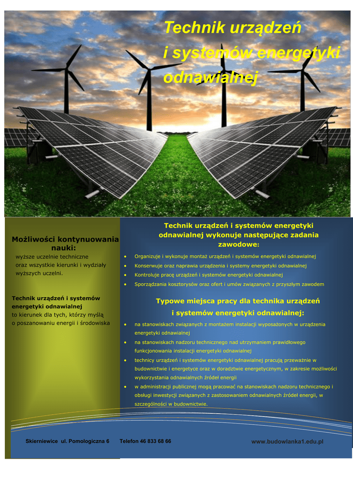 Technik urządzeń i systemów energetyki odnawialnej Technik urządzeń i systemów energetyki odnawialnej wykonuje następujące zadania Możliwości kontynuowania Technik urządzeń i systemów energetyki odnawialnej zawodowe wykonuje :następujące zadania nauki: Organizuje i wykonuje montaż urządzeń i systemów energetyki odnawialnej zawodowe : wyższe uczelnie techniczne oraz wszystkie kierunki i wydziały Konserwuje oraz naprawia urządzenia i systemy energetyki odnawialnej wyższych uczelni. Kontroluje pracę urządzeń i systemów energetyki odnawialnej Sporządzania kosztorysów oraz ofert i umów związanych z przyszłym zawodem Technik urządzeń i systemów Typowe miejsca pracy dla technika urządzeń energetyki odnawialnej i systemów energetyki odnawialnej: to kierunek dla tych, którzy myślą o poszanowaniu energii i środowiska na stanowiskach związanych z montażem instalacji wyposażonych w urządzenia energetyki odnawialnej na stanowiskach nadzoru technicznego nad utrzymaniem prawidłowego funkcjonowania instalacji energetyki odnawialnej technicy urządzeń i systemów energetyki odnawialnej pracują przeważnie w budownictwie i energetyce oraz w doradztwie energetycznym, w zakresie możliwości wykorzystania odnawialnych źródeł energii w administracji publicznej mogą pracować na stanowiskach nadzoru technicznego i obsługi inwestycji związanych z zastosowaniem odnawialnych źródeł energii, w szczególności w budownictwie. Skierniewice ul. Pomologiczna 6 Telefon 46 833 68 66 www.budowlanka1.edu.pl .PL