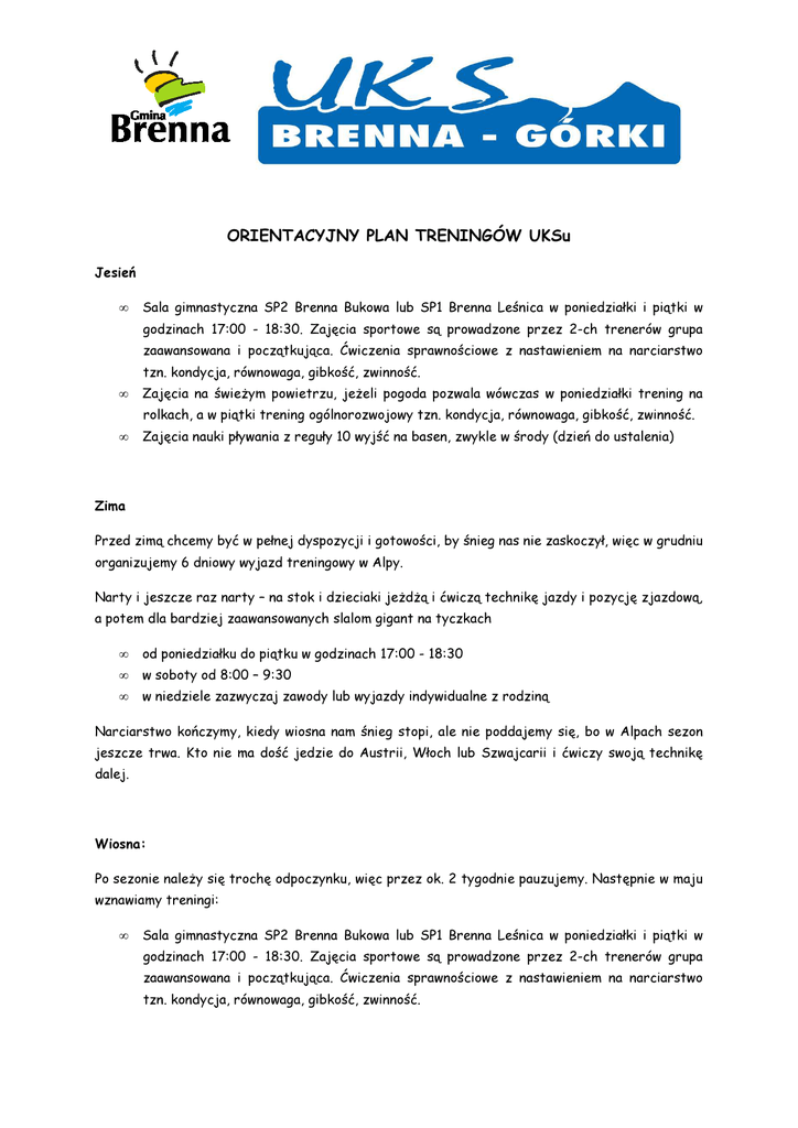 ORIENTACYJNY PLAN TRENINGÓW UKSu Jesień • Sala gimnastyczna SP2 Brenna Bukowa lub SP1 Brenna Leśnica w poniedziałki i piątki w godzinach 17:00 - 18:30. Zajęcia sportowe są prowadzone przez 2-ch trenerów grupa zaawansowana i początkująca. Ćwiczenia sprawnościowe z nastawieniem na narciarstwo tzn. kondycja, równowaga, gibkość, zwinność. • Zajęcia na świeżym powietrzu, jeżeli pogoda pozwala wówczas w poniedziałki trening na rolkach, a w piątki trening ogólnorozwojowy tzn. kondycja, równowaga, gibkość, zwinność. • Zajęcia nauki pływania z reguły 10 wyjść na basen, zwykle w środy (dzień do ustalenia) Zima Przed zimą chcemy być w pełnej dyspozycji i gotowości, by śnieg nas nie zaskoczył, więc w grudniu organizujemy 6 dniowy wyjazd treningowy w Alpy. Narty i jeszcze raz narty – na stok i dzieciaki jeżdżą i ćwiczą technikę jazdy i pozycję zjazdową, a potem dla bardziej zaawansowanych slalom gigant na tyczkach • od poniedziałku do piątku w godzinach 17:00 - 18:30 • w soboty od 8:00 – 9:30 • w niedziele zazwyczaj zawody lub wyjazdy indywidualne z rodziną Narciarstwo kończymy, kiedy wiosna nam śnieg stopi, ale nie poddajemy się, bo w Alpach sezon jeszcze trwa. Kto nie ma dość jedzie do Austrii, Włoch lub Szwajcarii i ćwiczy swoją technikę dalej. Wiosna: Po sezonie należy się trochę odpoczynku, więc przez ok. 2 tygodnie pauzujemy. Następnie w maju wznawiamy treningi: • Sala gimnastyczna SP2 Brenna Bukowa lub SP1 Brenna Leśnica w poniedziałki i piątki w godzinach 17:00 - 18:30. Zajęcia sportowe są prowadzone przez 2-ch trenerów grupa zaawansowana i początkująca. Ćwiczenia sprawnościowe z nastawieniem na narciarstwo tzn. kondycja, równowaga, gibkość, zwinność. • Zajęcia na świeżym powietrzu, jeżeli pogoda pozwala wówczas w poniedziałki trening na rolkach, a w piątki trening ogólnorozwojowy tzn. kondycja, równowaga, gibkość, zwinność. • Dodatkowo zaczynamy zajęcia tenisa ziemnego na korcie w Brennej przy ośrodku narciarskim Stary Groń. Zajęcia odbywają się 2 razy w tygodniu we wtorki i soboty lub czwartki i soboty. Grupy po 4-5 osób z podziałem na wiek i umiejętności (przede wszystkim dużo zabawy). Lato: • Zajęcia tenisa ziemnego rozkręcają się na dobre i dzieciaki, a i czasem rodzice lub całe rodziny poznają tajniki nauki gry w tenisa. Kort dzierżawimy i mamy go na wyłączność od maja do połowy września i jest do dyspozycji klubowiczów. Zajęcia odbywają się 2 razy w tygodniu we wtorki i soboty lub czwartki i soboty. Grupy po 4-5 osób z podziałem na wiek i umiejętności (przede wszystkim dużo zabawy). • Pozostałe zajęcia odpuszczamy, bo zaczynają się wakacje i wyjazdy rodzinne. Od 3 tygodnia sierpnia wznawiamy zajęcia poprzez tzw. „obóz dochodzeniowy” dzieciaki i rodzice (jak im się chce lub gdy mają urlop) wspólnie przez 5 dni spędzają czas np. wyjazd na basen z noclegiem w namiotach i ogniskiem, wycieczka w góry z noclegiem w schronisku i z ogniskiem, wycieczka rowerowa, park linowy, gry i zabawy w Brennej itp. aktywne formy spędzania czasu.