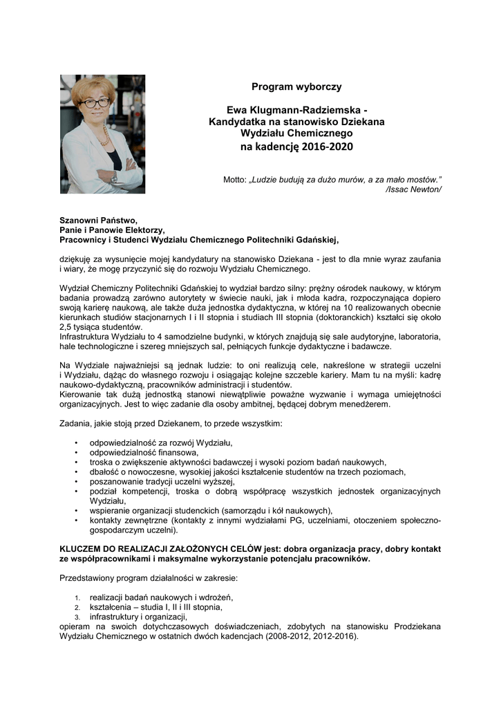 Program wyborczy Ewa Klugmann-Radziemska Kandydatka na stanowisko Dziekana Wydziału Chemicznego na kadencję 2016-2020 Motto: „Ludzie budują za dużo murów, a za mało mostów.” /Issac Newton/ Szanowni Państwo, Panie i Panowie Elektorzy, Pracownicy i Studenci Wydziału Chemicznego Politechniki Gdańskiej, dziękuję za wysunięcie mojej kandydatury na stanowisko Dziekana - jest to dla mnie wyraz zaufania i wiary, że mogę przyczynić się do rozwoju Wydziału Chemicznego. Wydział Chemiczny Politechniki Gdańskiej to wydział bardzo silny: prężny ośrodek naukowy, w którym badania prowadzą zarówno autorytety w świecie nauki, jak i młoda kadra, rozpoczynająca dopiero swoją karierę naukową, ale także duża jednostka dydaktyczna, w której na 10 realizowanych obecnie kierunkach studiów stacjonarnych I i II stopnia i studiach III stopnia (doktoranckich) kształci się około 2,5 tysiąca studentów. Infrastruktura Wydziału to 4 samodzielne budynki, w których znajdują się sale audytoryjne, laboratoria, hale technologiczne i szereg mniejszych sal, pełniących funkcje dydaktyczne i badawcze. Na Wydziale najważniejsi są jednak ludzie: to oni realizują cele, nakreślone w strategii uczelni i Wydziału, dążąc do własnego rozwoju i osiągając kolejne szczeble kariery. Mam tu na myśli: kadrę naukowo-dydaktyczną, pracowników administracji i studentów. Kierowanie tak dużą jednostką stanowi niewątpliwie poważne wyzwanie i wymaga umiejętności organizacyjnych. Jest to więc zadanie dla osoby ambitnej, będącej dobrym menedżerem. Zadania, jakie stoją przed Dziekanem, to przede wszystkim: • • • • • • • • odpowiedzialność za rozwój Wydziału, odpowiedzialność finansowa, troska o zwiększenie aktywności badawczej i wysoki poziom badań naukowych, dbałość o nowoczesne, wysokiej jakości kształcenie studentów na trzech poziomach, poszanowanie tradycji uczelni wyższej, podział kompetencji, troska o dobrą współpracę wszystkich jednostek organizacyjnych Wydziału, wspieranie organizacji studenckich (samorządu i kół naukowych), kontakty zewnętrzne (kontakty z innymi wydziałami PG, uczelniami, otoczeniem społecznogospodarczym uczelni). KLUCZEM DO REALIZACJI ZAŁOŻONYCH CELÓW jest: dobra organizacja pracy, dobry kontakt ze współpracownikami i maksymalne wykorzystanie potencjału pracowników. Przedstawiony program działalności w zakresie: realizacji badań naukowych i wdrożeń, kształcenia – studia I, II i III stopnia, infrastruktury i organizacji, opieram na swoich dotychczasowych doświadczeniach, zdobytych na stanowisku Prodziekana Wydziału Chemicznego w ostatnich dwóch kadencjach (2008-2012, 2012-2016). 1. 2. 3. Doceniając dotychczasowe osiągnięcia, będące zasługą Dziekanów: prof. Jacka Namieśnika i prof. Sławomira Milewskiego, chciałabym jako Dziekan kontynuować rozpoczęte w poprzednich kadencjach działania na rzecz naszego Wydziału. Strategiczne dla rozwoju Wydziału cele są sprzężone z rozwojem kariery zawodowej wszystkich pracowników Wydziału. Priorytetowe działania, jakie zamierzam realizować, to: • • • • • • stała poprawa jakości dydaktyki, kształcenie na najwyższym poziomie optymalnej liczby studentów, rozwój działalności naukowej, utrzymanie kategorii naukowej A, podjęcie starań o uzyskanie kategorii A+, rozwój naukowy młodej kadry, rozszerzanie grona wybitnych nauczycieli akademickich, realizacja ambitnego planu inwestycyjnego i remontowego, poprawa organizacji pracy (współpraca między zespołami naukowymi i jednostkami administracyjnymi), poprawa bezpieczeństwa pracy w laboratoriach badawczych i dydaktycznych. Poniżej przedstawiam zebrane w punktach zamierzenia programu wyborczego. 1. Badania naukowe i wdrożenia Cel: awanse naukowe i poprawa wyników oceny pracowników, poprawa wyników oceny jednostki • • • • • • Pozyskiwanie funduszy na badania, w tym: • aktualna informacja o konkursach grantowych (Katedry, zespoły naukowe), • granty ogólnowydziałowe. Pozyskiwanie partnerów badawczych i rozwój współpracy z przemysłem. Promowanie sukcesów w działalności naukowej. Dążenie do komercjalizacji wiedzy. Dbanie o rozwój laboratoriów. Tworzenie „zadaniowych” zespołów naukowych. 2. Kształcenie Cel: zapewnienie odpowiedniego poziomu wykształcenia → zatrudnienia absolwentom, zapewnienie pensum dydaktycznego pracownikom • • • • Modernizacja istniejących i tworzenie nowych kierunków kształcenia. Powiązanie kształcenia z praktyką – współpraca z otoczeniem gospodarczym, zajęcia prowadzone przez praktyków. Współpraca ze szkołami – wkład pracy w przygotowanie przyszłych kandydatów na studia. Rozwój umiejętności pracy w zespole, projekty zespołowe, w tym międzywydziałowe (praca w zespole to warunek powodzenia w przyszłej pracy zawodowej). 3. Infrastruktura i Organizacja Cel: poprawa warunków pracy, bezpieczeństwo organizacyjne i prawne • • • • • Rozbudowa, remonty, modernizacja infrastruktury – budynki, laboratoria. Intensywne poszukiwanie funduszy na wyposażenie laboratoriów. Usprawnianie procedur, weryfikacja ich zasadności i celowości (cel: ułatwienie pracy wszystkim pracownikom). Poprawa bezpieczeństwa w laboratoriach naukowych i dydaktycznych. Troska o wizerunek Wydziału - nowoczesne formy promocji. Realizacja tych zamierzeń opiera się na spełnieniu dwóch warunków: LUDZIE (zapewnienie pracownikom takich warunków pracy, które zagwarantują ich rozwój osobisty) i KONTAKTY (współistnienie Wydziału na forum uczelni i w szerokim otoczeniu społeczno-gospodarczym). Warunek I: LUDZIE – pragnę, aby wszyscy pracownicy, niezależnie od zajmowanego stanowiska, utożsamiali się ze swoim wydziałem i pracowali dla osiągnięcia wspólnego celu, jakim jest jego rozwój. Sposobem na spełnienie tego warunku będzie: • • • • Troska o rozwój kadry niezależnie o