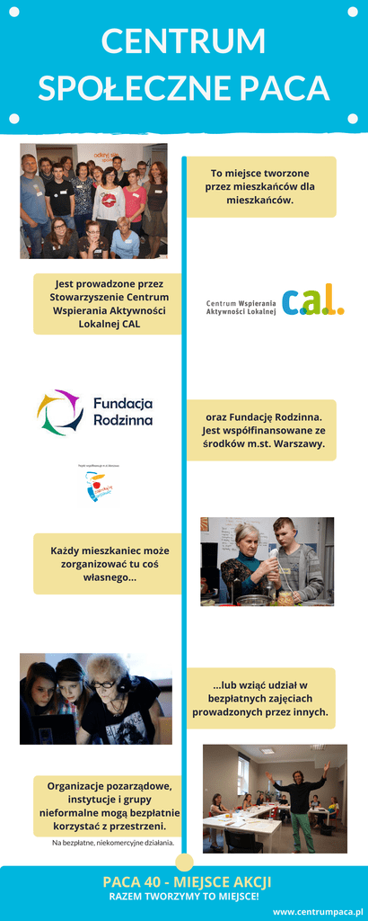 CENTRUM SPOŁECZNE PACA To miejsce tworzone przez mieszkańców dla mieszkańców. Jest prowadzone przez Stowarzyszenie Centrum Wspierania Aktywności Lokalnej CAL oraz Fundację Rodzinna. Jest współfinansowane ze środków m.st. Warszawy. Każdy mieszkaniec może zorganizować tu coś własnego... ...lub wziąć udział w bezpłatnych zajęciach prowadzonych przez innych. Organizacje pozarządowe, instytucje i grupy nieformalne mogą bezpłatnie korzystać z przestrzeni. Na bezpłatne, niekomercyjne działania. PACA 40 - MIEJSCE AKCJI RAZEM TWORZYMY TO MIEJSCE! www.centrumpaca.pl CO MOGĘ ZROBIĆ W CENTRUM PACA? Możesz wziąć udział w bezpłatnych zajęciach prowadzonych przez innych mieszkańców Jakie zajęcia odbywają się na Paca? Szczegóły dalej oraz na www.centrumpaca.pl Możesz zorganizować swoje zajęcia/spotkanie/warsztat itp. Jak to zrobić? Szczegóły dalej oraz na www.centrumpaca.pl Możesz wziąć udział w warsztatch,debatach, spotkaniach, seminariach, konsultacjach społecznych Harmonogram i program spotkan ustalany jest na bieżąco. Szczegóły na www.centrumpaca.pl Możesz wymienić się usługą/książka, dołączyć do kooperatywy. Jak działa wzjamenośc na Paca? Szczegóły dalej oraz na www.centrumpaca.pl Możesz bezpłatnie skorzystać z komputera, kuchni, biblioteki. Napić się kawy w kawiarni "Wolna przestrzeń", skorzystać z coworkingu i klubu malucha. Co jest do Twojej dyspozycji? Szczegółydalej oraz na www.centrumpaca.pl Możesz spotkać innych ludzi, poznać sąsiadów i nawiązać nowe przyjaźnie! PACA 40 - MIEJSCE AKCJI RAZEM TWORZYMY TO MIEJSCE! www.centrumpaca.pl CO DZIEJE SIĘ W CENTRUM PACA? Wszystko to, co chcą zorganizować sami mieszkańcy! Między innymi: cotygodniowe spotkania seniorów Klub malucha i klub rodziców MaTa, warsztaty dla rodziców, zajęcia dla młodzieży Zajęcia rękodzieła: Decoupage, koraliki, szydełko Kursy komputerowe dla seniorów (i nie tylko) Zajęcia gimnastyczne: yoga, tai-chi, ping-pong, gimnastyka dla seniorów PACA 40 - MIEJSCE AKCJI RAZEM TWORZYMY TO MIEJSCE! www.centrumpaca.pl CO DZIEJE SIĘ W CENTRUM PACA? Kursy językowe: hiszpański, niemiecki, rosyjski, angielskie dla dorosłych i dzieci Bezpłatne poradnictwo: prawne, psychologiczne, coaching, grupy samopomocowe Zajęcia artystyczne: chór sąsiedzki, warsztat ilustracji, wystawy, odczyty Warsztaty, szkolenia, spotkania z innowatorami społecznymi Zajęcia integracyjne: potańcówki, Dni Sąsiada, spotkania świąteczne Warsztaty kulinarne i wiele, wiele innych! PACA 40 - MIEJSCE AKCJI RAZEM TWORZYMY TO MIEJSCE! www.centrumpaca.pl JESTEM MIESZKAŃCEM I CHCĘ COŚ ZROBIĆ! Zastanów, co chciałbyś/chciałabyś zrobić. Przemyśl dla kogo i dlaczego chcesz to zrobić oraz czego potrzebujesz. Nie masz pomysłu albo napotkałeś/łaś problem na etapie planowania? Pomożemy! Zgłoś się do nas! Zgłoś się do nas - zadzwoń, napisz, przyjdź, wyślij formularz elektroniczny każdy sposób jest dobry. Omówimy Twój pomysł, wybierzemy najlepszą salę i datę , zarezerwujemy je w kalendarzu (w miarę dostępności). Ze względu na duże zainteresowanie nie zawsze mamy wolne sale - pamiętaj o tym planując swoje wydarzenie i upewnij się, że są dostępne. Powiadom innych o swoich działaniach - przygotuj plakat, informację, wyślij zaproszenia Jeśli nie potrafisz tego zrobić- pomożemy Ci! Do Twojej dyspozycji są: tablica ogłoszeń w holu, profil na FB, strona internetowa i newsletter. Działaj i ciesz się tym! Jeśli zdecydujesz się na długotrwałą i regularną współpracę podpiszemy z Tobą porozumienie wolontariackie. Możesz zrobić coś tylko raz, zdecydować się na cykl l kilku zajęć albo robić coś cyklicznie, np. co tydzień. Nowy pomysł? Super! Jeśli będziesz miał/ła nowy pomysł lub napotkasz trudności - zgłoś się do nas, postaramy się znaleźć nowe rozwiązanie! PACA 40 - MIEJSCE AKCJI RAZEM TWORZYMY TO MIEJSCE! www.centrumpaca.pl JESTEM PRZEDSTAWICIELEM ORGANIZACJI Chcesz zorganizować warsztat, spotkanie, szkolenie? Przemyśl dla kogo i dlaczego chcesz to zrobić oraz czego potrzebujesz. Pamiętaj, że wszystkie wydarzenia w Centrum paca są bezpłatne i otwarte dla lokalnej społeczności. Jeśli chcesz zorganizować event zamknięty, pamiętaj o zasadzie wzajemności (strona 6). Zgłoś się do nas - najlepiej za pośrednictwem formualrza on-line, ale każdy sposób jest dobry Omówimy Twój pomysł, wybierzemy najlepszą salę i datę , zarezerwujemy je w kalendarzu (w miarę dostępności). Ze względu na duże zainteresowanie nie zawsze mamy wolne sale - pamiętaj o tym planując swoje wydarzenie i upewnij się, że są dostępne. Powiadom innych o swoich działaniach - przygotuj plakat, informację, wyślij zaproszenia Pamiętaj o powiadomieniu, że Centrum Paca jest parterem wydarzenia i odpowiednich logotypach. Umieścimy Twoją informację na: tablicy ogłoszeń w holu, profilu na FB, stronie internetowej i w newsletterze. Działaj i ciesz się tym! Jeśli zdecydujemy się na długotrwałą i regularną współpracę podpiszemy z Tobą porozumienie użyczenia przestrzeni. Możesz zrobić coś tylko raz, zdecydować się na cykl l kilku zajęć albo robić coś cyklicznie, np. co tydzień. Nowy pomysł? Super! Jeśli będziesz miał/ła nowy pomysł lub napotkasz trudności - zgłoś się do nas, postaramy się znaleźć nowe rozwiązanie! PACA 40 - MIEJSCE AKCJI RAZEM TWORZYMY TO MIEJSCE! www.centrumpaca.pl ZASADA WZAJEMNOŚCI Jeśli korzystasz z czegoś (np. praca wolontariusza, bezpłatny warsztat, sala, kawa, herbata)... ...daj coś od siebie! Zastanów się co jest Twoją mocną stroną i co możesz dać innym. Np: pomóż prowadzącemu przygotować salę, zawieś plakat u siebie na klatce, przynieś kawę dla innych. A może sam zostaniesz wolontariuszem i poprowadzisz zajęcia dla innych? Zgłoś się do nas! NGO korzystające z przestrzeni zachęcamy do zrobienia czegoś dla lokalnej sp