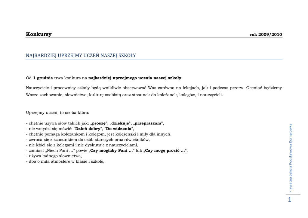 Konkursy rok 2009/2010 NAJBARDZIEJ UPRZEJMY UCZEŃ NASZEJ SZKOŁY Od 1 grudnia trwa konkurs na najbardziej uprzejmego ucznia naszej szkoły. Nauczyciele i pracownicy szkoły będą wnikliwie obserwować Was zarówno na lekcjach, jak i podczas przerw. Oceniać będziemy Wasze zachowanie, słownictwo, kulturę osobistą oraz stosunek do koleżanek, kolegów, i nauczycieli. - chętnie używa słów takich jak: „proszę”, „dziękuję”, „przepraszam”, nie wstydzi się mówić: "Dzień dobry", "Do widzenia", chętnie pomaga koleżankom i kolegom, jest koleżeński i miły dla innych, zwraca się z szacunkiem do osób starszych oraz rówieśników, nie kłóci się z kolegami i nie dyskutuje z nauczycielami, zamiast „Niech Pani …” powie „Czy mogłaby Pani ...” lub „Czy mogę prosić ...”, używa ładnego słownictwa, dba o miłą atmosferę w klasie i szkole, Prywatna Szkoła Podstawowa Kornelówka Uprzejmy uczeń, to osoba która: 1 Miesiąc Imię i nazwisko ucznia Grudzień Jakub Wiktorski Styczeń Milena Białobrzewska Luty Daniel Michalak Marzec Julia Lewańska Michalina Wójcikiewicz Kwiecień Max Dikof Maj Michalina Wójcikiewicz Czerwiec Milena Białobrzewska Prywatna Szkoła Podstawowa Kornelówka NAJBARDZIEJ UPRZEJMI UCZNIOWIE W POSZCZEGÓLNYCH MIESIĄCACH 2 NAJLEPSZA KLASA Również od 1 grudnia twa konkurs na najlepszą klasę KORNELÓWKI. W konkursie biorą udział wszystkie klasy. Oceniane będą następujące elementy: zachowanie uczniów podczas lekcji, zachowanie uczniów w czasie przerw (również obiadowej - czyli kultura jedzenia), porządek w klasie, wystrój klasy, zaangażowanie w życie szkoły, zaangażowanie w redagowanie gazetki szkolnej. Klasy oceniane będą przez nauczycieli oraz dyrekcję szkoły. W ocenianie klas zaangażowana będzie również Rada Rodziców. Każda klasa może otrzymać od 0 do 3 punktów w każdej kategorii. Tablica informacyjna dotycząca konkursu wisi na parterze, przy schodach. Najlepszą klasą roku zostaje klasa, która została najlepszą klasą miesiąca największą ilość razy. W przypadku remisu, o wygranej decyduje suma punktów uzyskanych przez cały rok. Prywatna Szkoła Podstawowa Kornelówka - 3 PUNKTACJA ZA KONKURS DLA NAJLEPSZEJ KLASY Z P W ZA G Z P W ZA G Z P W ZA G Z P W ZA G Grudzień 1 1 1 2 0 5 2 2 3 3 1 11 2 3 1 1 0 7 1 1 2 1 3 8 1 1 3 1 2 8 Styczeń 1 2 2 0 0 5 3 3 2 1 1 10 3 3 2 3 2 13 2 2 1 1 3 9 2 1 1 2 1 7 Luty 2 2 1 3 0 8 3 2 2 2 0 9 3 3 2 3 0 11 1 1 2 2 0 6 2 2 1 3 0 8 Marzec 2 2 3 2 0 9 2 2 2 2 2 10 2 3 2 2 1 10 1 3 2 3 3 12 3 2 2 3 3 13 Kwiecień 2 3 3 3 0 11 1 2 2 2 0 7 3 3 2 3 0 11 1 3 2 1 3 10 1 2 1 1 3 8 Maj 2 2 3 2 0 9 0 2 2 2 0 6 2 3 2 2 0 9 0 3 2 2 2 9 3 1 1 2 3 10 Czerwiec 3 2 3 2 0 10 2 2 2 2 0 8 3 3 2 3 0 11 1 2 2 2 3 10 2 1 1 2 3 9 Razem 13 14 16 14 0 57 13 15 15 14 4 61 18 21 13 17 3 72 7 15 13 12 17 64 14 10 10 14 15 63 Z – Zachowanie, P – Porządek, W – wystrój klasy, ZA – Zaangażowanie w życie szkoły, G – Gazetka. Prywatna Szkoła Podstawowa Kornelówka G Klasa 6 ZA Klasa 4 W Klasa 3 P Klasa 2 Z Klasa 1 4 Podsumowanie: Najlepszą klasą Prywatnej Szkoły Podstawowej Kornelówka w roku 2009/2010 została klasa 3, której wychowawcą jest Lidia Wilk. W poszczególnych kategoriach można wyróżnić następujące klasy: - zachowanie – klasa 3 (wychowawca: Lidia Wilk), - porządek – klasa 3 (wychowawca: Lidia Wilk), - wystrój klasy – klasa 1 (wychowawca: Małgorzata Świątek), - zaangażowanie w życie szkoły – klasa 3 (wychowawca: Lidia Wilk), Serdecznie wszystkim wychowawcom oraz uczniom gratulujemy i życzymy dalszych sukcesów. Prywatna Szkoła Podstawowa Kornelówka - zaangażowanie w gazetkę PACANOWO – klasa 4 (wychowawca: Ewa Salamon). 5