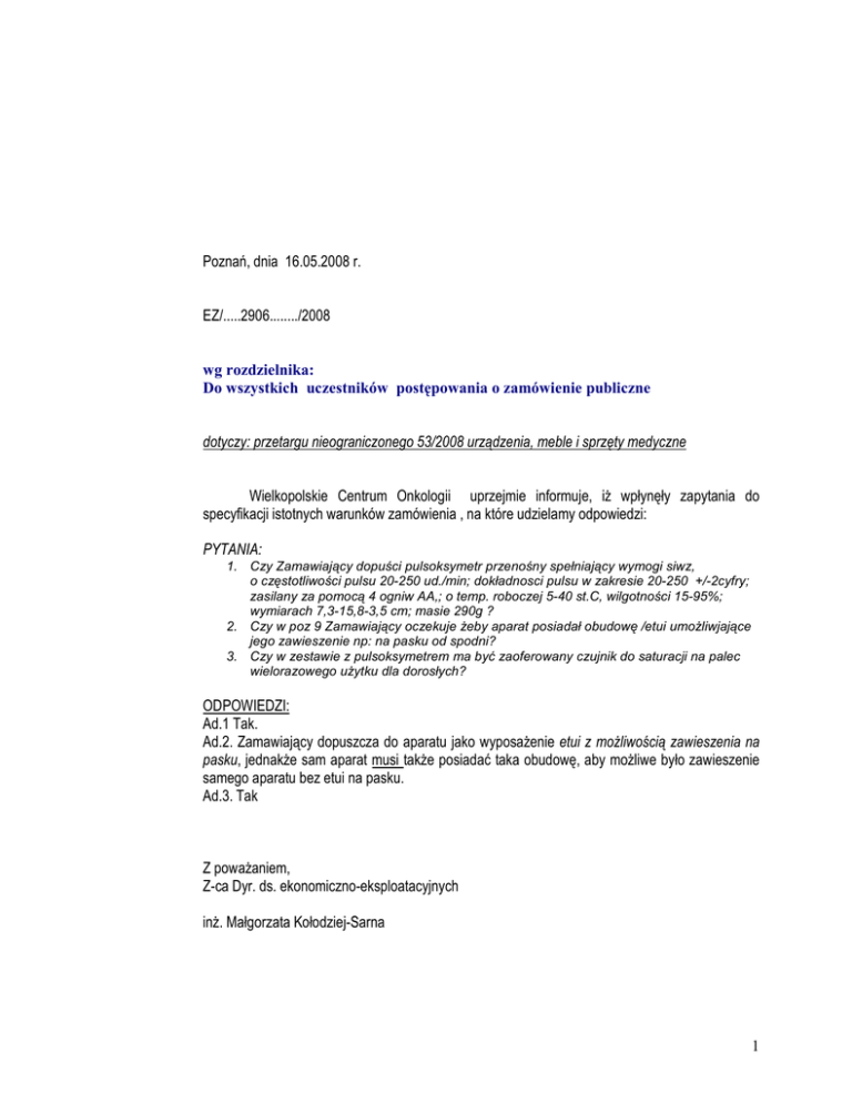 Poznań, dnia 16.05.2008 r. EZ/.....2906......../2008 wg rozdzielnika: Do wszystkich uczestników postępowania o zamówienie publiczne dotyczy: przetargu nieograniczonego 53/2008 urządzenia, meble i sprzęty medyczne Wielkopolskie Centrum Onkologii uprzejmie informuje, iŜ wpłynęły zapytania do specyfikacji istotnych warunków zamówienia , na które udzielamy odpowiedzi: PYTANIA: 1. Czy Zamawiający dopuści pulsoksymetr przenośny spełniający wymogi siwz, o częstotliwości pulsu 20-250 ud./min; dokładnosci pulsu w zakresie 20-250 +/-2cyfry; zasilany za pomocą 4 ogniw AA,; o temp. roboczej 5-40 st.C, wilgotności 15-95%; wymiarach 7,3-15,8-3,5 cm; masie 290g ? 2. Czy w poz 9 Zamawiający oczekuje Ŝeby aparat posiadał obudowę /etui umoŜliwjające jego zawieszenie np: na pasku od spodni? 3. Czy w zestawie z pulsoksymetrem ma być zaoferowany czujnik do saturacji na palec wielorazowego uŜytku dla dorosłych? ODPOWIEDZI: Ad.1 Tak. Ad.2. Zamawiający dopuszcza do aparatu jako wyposaŜenie etui z moŜliwością zawieszenia na pasku, jednakŜe sam aparat musi takŜe posiadać taka obudowę, aby moŜliwe było zawieszenie samego aparatu bez etui na pasku. Ad.3. Tak Z powaŜaniem, Z-ca Dyr. ds. ekonomiczno-eksploatacyjnych inŜ. Małgorzata Kołodziej-Sarna 1 2