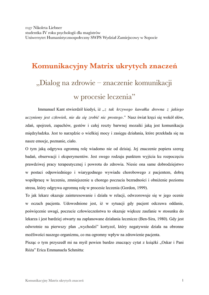 mgr Nikoleta Liebner studentka IV roku psychologii dla magistrów Uniwersytet Humanistycznospołeczny SWPS Wydział Zamiejscowy w Sopocie Komunikacyjny Matrix ukrytych znaczeń „Dialog na zdrowie – znaczenie komunikacji w procesie leczenia” Immanuel Kant stwierdził kiedyś, iż „z tak krzywego kawałka drewna z jakiego uczyniony jest człowiek, nie da się zrobić nic prostego.” Nasz świat kręci się wokół słów, zdań, spojrzeń, zapachów, gestów i całej reszty barwnej mozaiki jaką jest komunikacja międzyludzka. Jest to narzędzie o wielkiej mocy i zasięgu działania, które przekłada się na nasze emocje, poznanie, ciało. O tym jaką odgrywa ogromną rolę wiadomo nie od dzisiaj. Jej znaczenie popiera szereg badań, obserwacji i eksperymentów. Jest swego rodzaju punktem wyjścia ku rozpoczęciu prawdziwej pracy terapeutycznej i powrotu do zdrowia. Niesie ona same dobrodziejstwo w postaci odpowiedniego i wiarygodnego wywiadu chorobowego z pacjentem, dobrą współpracę w leczeniu, zmniejszenie u chorego poczucia bezradności i obniżenie poziomu stresu, który odgrywa ogromną rolę w procesie leczenia (Gordon, 1999). To jak lekarz okazuje zainteresowanie i działa w relacji, odwzorowuje się w jego ocenie w oczach pacjenta. Udowodnione jest, iż w sytuacji gdy pacjent odczuwa oddanie, poświęcenie uwagi, poczucie człowieczeństwa to okazuje większe zaufanie w stosunku do lekarza i jest bardziej otwarty na zaplanowane działania lecznicze (Ben-Sira, 1980). Gdy jest odwrotnie na pierwszy plan „wychodzi” kortyzol, który negatywnie działa na obronne możliwości naszego organizmu, co ma ogromny wpływ na zdrowienie pacjenta. Pisząc o tym przyszedł mi na myśl pewien bardzo znaczący cytat z książki „Oskar i Pani Róża” Erica Emmanuela Schmitta: Komunikacyjny Matrix ukrytych znaczeń "1 „ Myśli, których się nie zdradza, ciążą nam, zagnieżdżają się, paraliżują nas, nie dopuszczają nowych i w końcu zaczynają gnić. Staniesz się składem starych śmierdzących myśli, jeśli ich nie wypowiesz.” ( Éric-Emmanuel Schmitt, 2004) to właśnie takie „gnijące myśli”, pod którymi ukryte są negatywne emocje, przeświadczenia, wątpliwości, strach, niepewność mają destruktywny wpływ na proces zdrowienia. Jeżeli my jako pacjencji nie jesteśmy wysłuchani, pewne terminy nie zostaną nam wyjaśnione, nie mamy poczucia zaufania, to niepewność i obawy trawią nas od środka. Pamiętam rozmowę z pewną starszą osobą, która opowiadała o pobycie w szpitalu na oddziale kardiologicznym. Te kilka dni były dla niej istną katorgą. Opowiadała, iż miała poczucie, że jej całe człowieczeństwo zamknięte było w liczbach, a konkretnie w numerze identyfikacyjnym pacjenta jaki został jej przydzielony. Doznała specyficznego dysonansu, gdy grupa lekarzy na obchodzie nie podejmowała z nią próby komunikowania się. Jakby pomiędzy nimi stał ogromny mur oddzielający dwie współistniejące rzeczywistości. Nie była człowiekiem... był liczbą i jednostką chorobową, nic poza tym. Obawiała się o swój stan zdrowia, a ze słów które słyszała nie rozumiała nic. Badania pokazują, iż tylko 36% pacjentów tak naprawdę poprawnie rozumuje podstawowe terminy medyczne (Mishler, 1986). Tak ograniczone informacje mogą być przyczyną do powstawania błędnych przekonań na temat swojego stanu zdrowia i do pewnego rodzaju niepotrzebnej „katastrofizacji” swojego położenia, jak było w przypadku opisanym powyżej. Nielubowicz podkreśla, iż dobra komunikacja werbalna jest czynnikiem który korzystnie wpływa na zdrowie psychiczne i znacznie obniża objawy somatyczne. Ma ogromny wpływ na nasz stan emocjonalny, co ważne jest dobrym środkiem kontrolującym poziom odczuwanego bólu, zmniejsza nadciśnienie i co zaskakujące ma wpływ na prawidłowy poziom cukru we krwi (Nielubowicz, 1991). Nawiązując do filozofii kantowskiej na tym przykładzie chciałabym podkreślić tezę, która mówi iż człowiek jako jednostka powinna być celem samym w sobie, a lekarze nie powinni poprzestać na nadaniu odpowiedniej nazwy chorobie, która nęka pacjenta. Dialog pomiędzy pacjentem, a lekarzem jest pewnego rodzaju sztuką, aktem twórczym. Faktem jest, iż często wkład w akt komunikacyjny jest niewspółmiernie rozłożony pomiędzy Komunikacyjny Matrix ukrytych znaczeń "2 uczestników. Bywa i tak, że to co inwestujemy, do nas nie wraca, tylko pochłania nasze emocje, zasoby poznawcze, zarówno pacjenta jak i lekarza. Pewien lekarz opowiadał o momentach, gdy wyjeżdżał karetką na wizytę. W takiej chwili charakteryzuje go jak to określił „schizofreniczny sposób myślenia”, skupia się tylko i wyłącznie na udzieleniu pierwszej pomocy. Widząc pacjenta stara się tak zadawać pytania, aby w jak najkrótszym czasie wydobyć maximum niezbędnych mu informacji do postawienia wstępnej, jak najbardziej trafnej diagnozy. Nie skupia się na ozdobnikach i zbędnej grzeczności, ponieważ doskonale wie, że czasami każda sekunda jest cenna. On sam znajduje tu analogię do rycerza w zbroi. Jego pancerz jest mu niezbędny, aby nie oddać się emocjom, które mogą sprawić, iż nie będzie w stanie skupić się na czynnościach ratujących życie. To co nosi na swoich barkach nazywa odpowiedzialnością za siebie, za swoje działania i zespół karetki, a poprzez co i zdrowie pacjenta. Związek pomiędzy pacjentem, a lekarzem jest trudny. W tej diadzie ciężko jest znaleźć złoty środek, ponieważ oboje działają na innych zasadach. Pomimo tego, iż współistnieją na jednej płaszczyźnie, funkcjonują w różnym „komunikacyjnym Matrix’ie ukrytych znaczeń”, są niczym dwa wymiary, które pomimo tego, iż chcą być jednością, czasami trudno odnajdują jedną, wspólną bazę porozumienia. Pacjent obarczony jest piętnem choroby, lekarz kieruje się działaniem pomocowym. Diada ta może być kompatybilna, lu