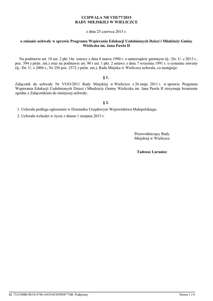 UCHWAŁA NR VIII/77/2015 RADY MIEJSKIEJ W WIELICZCE z dnia 25 czerwca 2015 r. o zmianie uchwały w sprawie Programu Wspierania Edukacji Uzdolnionych Dzieci i Młodzieży Gminy Wieliczka im. Jana Pawła II Na podstawie art. 18 ust. 2 pkt 14a ustawy z dnia 8 marca 1990 r. o samorządzie gminnym (tj.: Dz. U. z 2013 r., poz. 594 z póżn. zm.) oraz na podstawie art. 90 t ust. 1 pkt. 2 ustawy z dnia 7 września 1991 r. o systemie oświaty (tj.: Dz. U. z 2004 r., Nr 256 poz. 2572 z późn. zm.), Rada Miejska w Wieliczce uchwala, co następuje: § 1. Załącznik do uchwały Nr VI/83/2011 Rady Miejskiej w Wieliczce z 26 maja 2011 r. w sprawie Programu Wspierania Edukacji Uzdolnionych Dzieci i Młodzieży Gminy Wieliczka im. Jana Pawła II otrzymuje brzmienie zgodne z Załącznikiem do niniejszej uchwały. § 2. 1. Uchwała podlega ogłoszeniu w Dzienniku Urzędowym Województwa Małopolskiego. 2. Uchwała wchodzi w życie z dniem 1 sierpnia 2015 r. Przewodniczący Rady Miejskiej w Wieliczce Tadeusz Luraniec Id: 73A768B6-8E54-4746-A410-6C059E0F774B. Podpisany Strona 1 z 6 Załącznik do Uchwały Nr VIII/77/2015 Rady Miejskiej w Wieliczce z dnia 25 czerwca 2015 r. Program Wspierania Edukacji Uzdolnionych Dzieci i Młodzieży Gminy Wieliczka im. Jana Pawła II § 1. Postanowienia Ogólne 1. Przyjmuje się Program Wspierania Edukacji Uzdolnionych Dzieci i Młodzieży Gminy Wieliczka im. Jana Pawła II w celu poprawy warunków rozwoju uczniów zdolnych oraz zachęcenia dzieci do zdobywania wiedzy i doskonalenia swoich umiejętności. Realizacja Programu powinna sprzyjać rozwijaniu talentów i zainteresowań, pobudzaniu twórczego myślenia i mobilizacji do dalszej pracy nad sobą. 2. Formy pomocy i związane z nimi świadczenia są indywidualnym wyróżnieniem dla ucznia, którego zdolności i zainteresowania wykraczają poza program szkolny i który może poszczycić się znaczącymi osiągnięciami edukacyjnymi, artystycznymi lub społecznymi. 3. Formami pomocy materialnej o charakterze motywacyjnym dla uczniów są: 1) Nagroda Edukacyjna Gminy Wieliczka im. Jana Pawła II zwana dalej Nagrodą Edukacyjną; 2) Stypendium Edukacyjne Gminy Wieliczka im. Jana Pawła II zwane dalej Stypendium Edukacyjnym; 3) List Gratulacyjny dla najlepszego ucznia szkoły z nagrodą rzeczową. 4. Nagrodę Edukacyjną i/lub Stypendium Edukacyjne przyznaje się za: 1) wyniki w nauce – uczniom szóstych klas szkół podstawowych oraz uczniom gimnazjów; 2) osiągnięcia artystyczne – uczniom szkół artystycznych. 5. W przypadku zbiegu uprawnień do uzyskania dwóch stypendiów tj. stypendium naukowego i artystycznego organ przyznający stypendia uwzględniając charakter osiągnięć uprawnionego przyznaje tylko jeden rodzaj pomocy stypendialnej o charakterze motywacyjnym. 6. Nagroda Edukacyjna może zostać przyznana uczniowi szkoły, dla której organem prowadzącym jest Gmina Wieliczka lub dotowanej przez Gminę Wieliczka na podstawie wpisu do ewidencji prowadzonej przez Burmistrza Miasta i Gminy Wieliczka, za osiągnięcia uzyskane w roku szkolnym, który kończy się z dniem 31 sierpnia. 7. Nagrodę Edukacyjną uczeń może otrzymać tylko jeden raz. Uczniowi, któremu przyznano Nagrodę może również być przyznane Stypendium Edukacyjne. 8. Przyznaje się nie więcej niż dwie Nagrody Edukacyjne. 9. Stypendium Edukacyjne przyznaje się uczniowi będącemu mieszkańcem Gminy Wieliczka za osiągnięcia uzyskane w roku szkolnym, który kończy się z dniem 31 sierpnia. 10. Przyznaje się do dziesięciu Stypendiów za wyniki w nauce i do dziesięciu Stypendiów za osiągnięcia artystyczne. W szczególnie uzasadnionych przypadkach Kapituła może zaproponować przyznanie liczby stypendiów ponad ustalony limit. 11. Ilekroć w programie jest mowa o: 1) laureacie – rozumie się przez to zdobywcę głównej nagrody lub ucznia, który w olimpiadzie, konkursie lub turnieju zajął miejsca od 1 do 3; 2) finaliście – rozumie się przez to zdobywcę wyróżnienia albo innego miejsca premiowanego w olimpiadzie, konkursie lub turnieju, zgodnie z regulaminem przeprowadzanych zawodów wiedzy lub zawodów artystycznych. Id: 73A768B6-8E54-4746-A410-6C059E0F774B. Podpisany Strona 2 z 6 § 2. Nagroda Edukacyjna Gminy Wieliczka 1. Nagroda Edukacyjna Gminy Wieliczka za wybitne osiągnięcia w nauce lub wybitne osiągnięcia artystyczne może być przyznana uczniowi, który spełnia łącznie następujące kryteria: 1) uczęszcza do szkoły prowadzonej lub dotowanej przez Gminę Wieliczka; 2) jest laureatem: a) olimpiady – finału centralnego (zawodów trzeciego stopnia) przeprowadzonej zgodnie z przepisami Rozporządzenia Ministra Edukacji i Sportu z dnia 29 stycznia 2002 r. w sprawie organizacji oraz sposobu przeprowadzania konkursów, turniejów i olimpiad (Dz. U. z 2002 r. Nr 13 poz. 125 z późn.zm.) lub b) olimpiady – finału ogólnopolskiego (trzeciego etapu) przeprowadzonej zgodnie z przepisami Rozporządzenia Ministra Kultury i Dziedzictwa Narodowego z dnia 4 października 2011 r. w sprawie organizacji oraz sposobu przeprowadzania konkursów, turniejów i olimpiad dla uczniów publicznych szkół i placówek artystycznych (Dz. U. z 2011 r., Nr 224, poz. 1346). 2. W szczególnie uzasadnionych przypadkach Kapituła może zaproponować przyznanie Nagrody Edukacyjnej z tytułu innych wybitnych osiągnięć edukacyjnych lub artystycznych. Przedstawienie takiej propozycji musi zostać przez Kapitułę umotywowane. § 3. Stypendium Edukacyjne im. Jana Pawła II za wyniki w nauce Stypendium Edukacyjne im. Jana Pawła II za wyniki w nauce może być przyznane uczniowi, który spełnia łącznie następujące kryteria: 1) jest mieszkańcem Gminy Wieliczka; 2) w wyniku klasyfikacji rocznej bezpośrednio poprzedzającej okres na który ma być przyznane Stypendium uzyskał średnią ocen z obowiązkowych zajęć edukacyjnych, co najmniej: a) 5,0 – w przypadku uczniów szóstych klas szkół podstawowych; b) 4,8 – w przyp