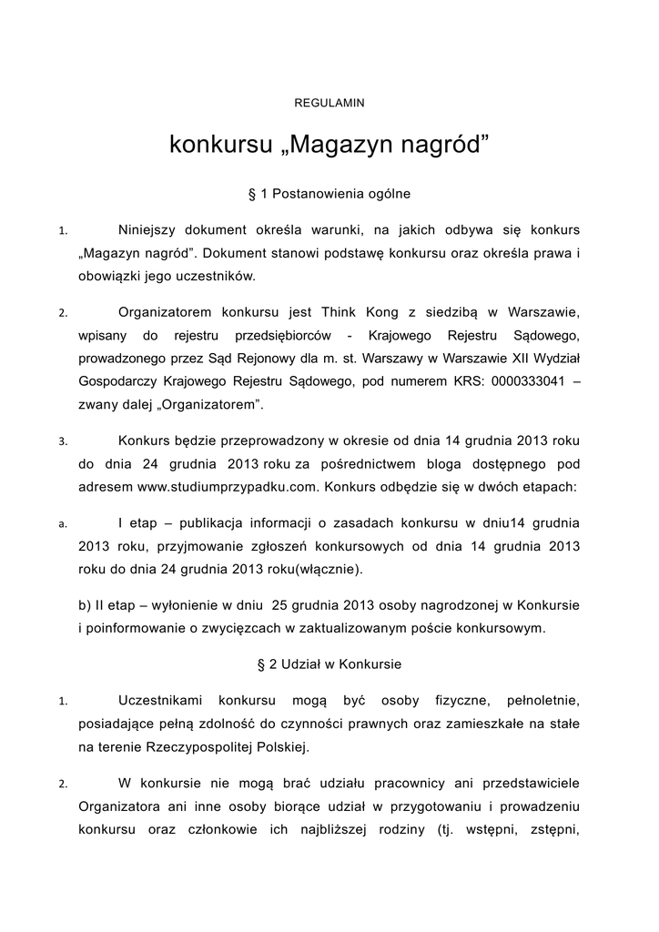 REGULAMIN konkursu „Magazyn nagród” § 1 Postanowienia ogólne 1. Niniejszy dokument określa warunki, na jakich odbywa się konkurs „Magazyn nagród”. Dokument stanowi podstawę konkursu oraz określa prawa i obowiązki jego uczestników. 2. Organizatorem konkursu jest Think Kong z siedzibą w Warszawie, wpisany do rejestru przedsiębiorców - Krajowego Rejestru Sądowego, prowadzonego przez Sąd Rejonowy dla m. st. Warszawy w Warszawie XII Wydział Gospodarczy Krajowego Rejestru Sądowego, pod numerem KRS: 0000333041 – zwany dalej „Organizatorem”. 3. Konkurs będzie przeprowadzony w okresie od dnia 14 grudnia 2013 roku do dnia 24 grudnia 2013 roku za pośrednictwem bloga dostępnego pod adresem www.studiumprzypadku.com. Konkurs odbędzie się w dwóch etapach: a. I etap – publikacja informacji o zasadach konkursu w dniu14 grudnia 2013 roku, przyjmowanie zgłoszeń konkursowych od dnia 14 grudnia 2013 roku do dnia 24 grudnia 2013 roku(włącznie). b) II etap – wyłonienie w dniu 25 grudnia 2013 osoby nagrodzonej w Konkursie i poinformowanie o zwycięzcach w zaktualizowanym poście konkursowym. § 2 Udział w Konkursie 1. Uczestnikami konkursu mogą być osoby fizyczne, pełnoletnie, posiadające pełną zdolność do czynności prawnych oraz zamieszkałe na stałe na terenie Rzeczypospolitej Polskiej. 2. W konkursie nie mogą brać udziału pracownicy ani przedstawiciele Organizatora ani inne osoby biorące udział w przygotowaniu i prowadzeniu konkursu oraz członkowie ich najbliższej rodziny (tj. wstępni, zstępni, rodzeństwo, małżonkowie, rodzice małżonków, osoby pozostające w stosunku przysposobienia oraz we wspólnym pożyciu). 3. Zadaniem uczestnika konkursu jest wpisanie pod postem ogłaszającym Konkurs komentarza będącego realizacją zadania konkursowego. 4. Ani uczestnictwa w konkursie, ani praw i obowiązków z nim związanych, w tym także prawa do żądania wydania nagrody, nie można przenosić na inne osoby. 5.Uczestnictwo w konkursie jest nieodpłatne. 6. Dane osobowe uczestników konkursu będą przetwarzane zgodnie z warunkami określonymi w ustawie z dnia 29 sierpnia 1997 r. o ochronie danych osobowych (tekst jednolity: Dz. U. z 2002 r., Nr 101 poz. 926 ze zm.) wyłącznie w celu przeprowadzenia konkursu, wyłonienia jego zwycięzców i przyznania im nagród przewidzianych niniejszym Regulaminem, i zostaną usunięte niezwłocznie po upływie terminu na składanie reklamacji co do przebiegu Konkursu. Administratorem danych osobowych jest Organizator. Podanie danych osobowych jest dobrowolne, jednak ich brak uniemożliwia przyznanie nagrody w konkursie. Uczestnikowi konkursu przysługuje prawo wglądu do swoich danych osobowych i ich poprawiania. § 3 Przebieg konkursu 1. Uczestnicy przystępują do konkursu poprzez wpisanie pod postem rozpoczynającym Konkurs komentarz. Uczestnicy muszą w komentarzu podać przykład dziwnej/niestandardowej infografiki/wykresu. 2. Komentarze należy publikować pod postem od 14 grudnia 2013 roku do dnia 24 grudnia2013 roku(włącznie). Komentarze, które zostaną opublikowane przed terminem określonym powyżej lub po nim nie będą brały udziału w konkursie. 3. Nad prawidłowością przebiegu konkursu czuwać będzie jury złożone z przedstawicieli Organizatora i Blogera. Jury będzie nadzorować wykonanie przez Organizatora wszystkich zobowiązań wynikających z niniejszego Regulaminu. Spośród zgłoszeń konkursowych właściciel bloga, na 4. którym został zamieszczony wpis konkursowy, wyłoni zwycięzcę, którego odpowiedz zdaniem blogera w najlepszy sposób spełniła warunki konkursowe. § 4 Zwycięzcy i nagrody w Konkursie 1. Nagrodą w konkursie jest: ekspres ciśnieniowy na kapsułki Nescafe Dolce Gusto Krups Piccolo 2. Zwycięzca konkursu zostanie opublikowany przez Blogera w zaktualizowanym poście konkursowym. 3. Nagroda, o których mowa w ust. 1. zostaną wysłane nagrodzonym przez Organizatora za pośrednictwem poczty kurierskiej na adres pocztowy wskazany przez laureata konkursu w terminie do 20 dni od daty ogłoszenia wyników konkursu. 4. Jeżeli zwycięzca konkursu nie poda swoich danych adresowych w terminie 14 (czternastu) dni od daty ogłoszenia wyników konkursu, jego prawo do nagrody wygasa, a nagroda zostanie przyznana innemu uczestnikowi konkursu wybranemu przez Blogera. 5. Organizator nie odpowiada za skutki podania przez Uczestnika nieprawdziwych danych uniemożliwiających wydanie nagrody. 6. Nagrody konkursowe będą wydawane wyłącznie w postaci określonej niniejszym Regulaminem, bez możliwości wypłaty ich równowartości w gotówce lub zamiany na inną nagrodę rzeczową na żądanie osoby nagrodzonej. § 6 Postanowienia Szczególne 1. Uczestnicy konkursu poprzez przystąpienie do niego oświadczają, że: posiadają a. pełne prawa autorskie do nadesłanych tekstów, a prawa te nie są w żadnym zakresie obciążone ani ograniczone na rzecz osób trzecich; zwalniają Organizatora od wszelkich roszczeń osób b. trzecich związanych z ewentualnym naruszeniem autorskich praw majątkowych lub niemajątkowych oraz dóbr osobistych w związku z korzystaniem przez Organizatora z prac konkursowych. wyrażają zgodę na zastosowanie się do niniejszego c. Regulaminu. 2. Organizator oświadcza, że konkurs nie jest grą losową, loterią fantową, zakładem wzajemnym ani loterią promocyjną, których wynik zależy od przypadku (przeprowadzenia losowania) w rozumieniu Art. 2 ustawy z dnia 29 lipca 1992 r. o grach losowych i zakładach wzajemnych (Dz.U. z 2004 r. Nr 4, poz. 27 z późn. zm.) 3. Dane osobowe mogą być udostępniane podmiotom uprawnionym do ich otrzymania na mocy obwiązujących przepisów prawa, w tym właściwym organom wymiaru sprawiedliwości i urzędom skarbowym. 4. Po zakończeniu konkursu wszelkie dane uczestników, którzy wzięli udział w konkursie, zostaną poddane anonimizacji.