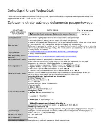 Dolnośląski Urząd Wojewódzki Źródło: http://duw.pl/pl/obsluga-klienta/paszporty/8346,Zgloszenie-utraty-waznego-dokumentu-paszportowego.html Wygenerowano: Piątek, 3 marca 2017, 22:03 Zgłoszenie utraty ważnego dokumentu paszportowego DOLNOŚLĄSKI URZĄD WOJEWÓDZKI we WROCŁAWIU Co chcę załatwić? Kogo dotyczy? Co przygotować? Jakie dokumenty muszę wypełnić? Jak wypełnić dokumenty? Ile muszę zapłacić? Kiedy złożyć dokumenty? Gdzie załatwię sprawę? KARTA USŁUGI Zgłoszenie utraty ważnego dokumentu paszportowego Nr: SOC.-P.0133/3/013 Data zatwierdzenia: 1.10.2013r. Zawiadomić organ paszportowy o utracie dokumentu paszportowego • Obywateli polskich, którzy utracili ważny dokument paszportowy. • UWAGA: Utrata paszportu jest to fizyczna utrata dokumentu przez osobę, dla której został on sporządzony a która nastąpiła w wyniku zagubienia lub przestępstwa. Zniszczenie paszportu należy przez to rozumieć zniszczenie dokumentu w stopniu utrudniającym identyfikację osoby, dla której został sporządzony lub stwierdzenie autentyczności dokumentu. • zawiadomienie o utracie/zniszczeniu* dokumentu paszportowego • ważny dowód osobisty zawiadomienie o utracie/zniszczeniu* dokumentu paszportowego Czytelnie i zalecamy wypełnienie drukowanymi literami Jeżeli paszport został utracony lub zniszczony z przyczyn zawinionych przez jego posiadacza w momencie składania wniosku o nowy paszport: • Opłata zostaje powiększona o 200% i wynosi nie 140 zł lecz 420 zł • Ulgowa: zostaje powiększona o 200% i wynosi nie 70 zł lecz 210 zł • Dla dzieci - Opłata 60 zł powiększona o 200% 180 zł • Ulgowa: zostaje powiększona o 200% i wynosi nie 30 zł lecz 90 zł Niezwłocznie po stwierdzeniu utraty ważnego dokumentu paszportowego, który jest zarówno dokumentem podróży jak również dokumentem tożsamości. Dolnośląski Urząd Wojewódzki we Wrocławiu Oddział Paszportowy Pl. Powstańców Warszawy 1 50-153 Wrocław Infolinia Wydziału Spraw Obywatelskich i Cudzoziemców 0 801 43 00 86 adres e-mail: [email protected] Delegatury DUW: • Jelenia Góra ul. Piłsudskiego 12 • Legnica ul. F.Skarbka 3 • Wałbrzych ul. Słowackiego 23a Jaki jest czas reakcji? • Oddział Paszportowy obsługuje klientów w: poniedziałek, wtorek, czwartek, piątek - w godzinach 9.30-15.45 środa w godzinach 8-18 Przyjmie zawiadomienie o utracie paszportu, zweryfikuje i sprawdzi poprawność danych a następnie wycofa zapis dot. dokumentu w Paszportowym Systemie Informacyjnym, tj.: wycofa paszport z obiegu prawnego. do 2 dni roboczych Jak się odwołać? Nie dotyczy Informacje dodatkowe Zawiadomienie o utracie paszportu składa się osobiście. Co zrobi Urząd? Podstawa prawna Ustawa z dnia z dnia 13 lipca 2006r. o dokumentach paszportowych (tekst jednolity: Dz.U. z 2013 r., poz. 268) • Rozporządzenie Ministra Spraw Wewnętrznych i Administracji z dnia 16 sierpnia 2010 r.w sprawie dokumentów paszportowych Dz.U z 2010 nr 152 poz. 1026 • Rozporządzenie Rady Ministrów z dnia 9 lutego 2010r w sprawie opłat za wydanie dokumentu paszportowego oraz ich zwrotu - Dz. U. nr 25, poz. 126. Rozporządzenie Ministra Spraw Wewnętrznych i Administracji z dnia 15 lutego 2010 r. w sprawie ewidencji paszportowych i centralnej ewidencji Dz. U. z 2010 r. Nr 26, poz.131 Karta ma charakter informacyjny i nie stanowi wykładni prawa Drukuj Generuj PDF Powiadom znajomego Wstecz liczba wejść: 29885