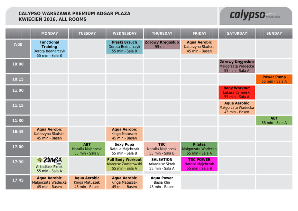 CALYPSO WARSZAWA PREMIUM ADGAR PLAZA KWIECIEŃ 2016, ALL ROOMS MONDAY 7:00 TUESDAY Functional Training Dorota Bednarczyk 55 min - Sala B WEDNESDAY THURSDAY FRIDAY Płaski Brzuch Dorota Bednarczyk 55 min - Sala B Zdrowy Kręgosłup 55 min - Aqua Aerobic Katarzyna Skulska 45 min - Basen SATURDAY Zdrowy Kręgosłup Małgorzata Wadecka 55 min - Sala A 10:00 Power Pump 55 min - Sala A 10:15 Body Workout Łukasz Cymiński 55 min - Sala A 11:00 Aqua Aerobic Małgorzata Wadecka 45 min - Basen 11:15 ABT 55 min - Sala A 11:30 16:45 Aqua Aerobic Katarzyna Skulska 45 min - Basen Aqua Aerobic Kinga Matuszek 45 min - Basen ABT Natalia Majchrzak 55 min - Sala B 17:00 17:30 Arkadiusz Skrok 55 min - Sala A 17:45 SUNDAY Aqua Aerobic Małgorzata Wadecka 45 min - Basen Aqua Aerobic Kinga Matuszek 45 min - Basen Sexy Pupa Natalia Majchrzak 55 min - Sala B TBC Natalia Majchrzak 55 min - Sala B Pilates Małgorzata Wadecka 55 min - Sala A Full Body Workout Mateusz Zawistowski 55 min - Sala A SALSATION Arkadiusz Skrok 55 min - Sala A TBC POWER Natalia Majchrzak 55 min - Sala B Aqua Aerobic Kinga Matuszek 45 min - Basen Aqua Power Basia Klin 45 min - Basen 18:00 Płaski Brzuch Aleksandra Biernat 55 min - Sala B TBC & Step Natalia Majchrzak 55 min - Sala B Pilates / Stretch Natalia Majchrzak 55 min - Sala B ABT Natalia Majchrzak 55 min - Sala B Aqua Aerobic Małgorzata Wadecka 45 min - Basen Cross Fight Mateusz Zawistowski 60 min - Sala B 18:30 Zdrowy Kręgosłup Sri Sri Joga Małgorzata Wadecka Ewa Wrzos-Nowacka 55 min - Sala A 90 min - Sala A Express Brzuch 30 min - Siłownia Stretching Aleksandra Biernat 55 min - Sala B ABT Aleksandra Biernat 55 min - Sala B Płaski Brzuch Natalia Majchrzak 55 min - Sala B Stretching Natalia Majchrzak 55 min - Sala B INTERVAL BIKING 55 min - Sztuki walki Łukasz Cymiński 90 min - Sala B Płaski brzuch / Stretching Aleksandra Biernat 55 min - Sala A Tabata Rafał Nowak 45 min - Sala B Express Brzuch 30 min - Siłownia Aqua Power Basia Klin 50 min - Basen 19:45 20:00 Power Pump 55 min Express Brzuch 30 min - Siłownia Express Brzuch 30 min - Siłownia Aqua Aerobic Kinga Matuszek 45 min - Basen 18:45 19:00 Express Brzuch 30 min - Siłownia Circuit Training Mateusz Zawistowski 55 min - Sala B Tabata Rafał Nowak 55 min - Sala B Joga / Stretch Małgorzata Wadecka 55 min - Sala A