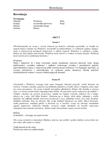 Rewolucja Rewolucja Występują: Okulara Szaleja Melina Zielona Wodzirej Asystentka pierwsza Asystentka druga Hetera Mim Pajac AKT I Scena I (Werble/muzyka na scenę z trzech różnych jej końców wchodzą asystentki, ze środka na samym końcu wyłania się Wodzirej. Asystentki są uśmiechnięte i w cekinach, piękne, lśniące, może w kolorowych perukach, koniecznie w takich samych. Wodzirej w cylindrze i fraku, dobrze by było gdyby miał brodę. Wodzirej może mówić w trakcie trwania muzyki. Wodzirej może mówić przy zamkniętej kurtynie.) Wodzirej Panie i panowie! Ja i moje zwierzęta, mamy nieopisany zaszczyt darować wam, droga publiczności, wszelkie nudności i mdłości cyrkowego światka i przedstawić jedynie najwybitniejsze okazy z najwyższej półki artystycznych rozkoszy! Te niepojęte zjawiska, są wysoce prawdziwe i zaświadczam, że cyrkowa arena, dostarczy dzisiaj państwu nieokiełzanych wrażeń i wysoce elektryzujących doznań! Scena II (Asystentki i Wodzirej wracają tymi sami drogami, którymi przyszli, wtedy kurtyna się otwiera. Ciemno, muzyka, pojawia się delikatne punktowe światło, które z biegiem sceny staje się coraz mocniejsze. Na scenę wchodzi porządnie alkoholowy Klaun. Ma butelkę w prawej ręce, a w lewej trzyma balon napompowany helem. Po pewnym czasie wypuszcza go jednak… Człapie, chwieje się, prawie przewraca, wpada na stojący wieszak, zahacza się o niego, okręca się z nim, robi kilka kroków. Zostawia go w końcu, idzie dalej, zdejmuje z siebie ubrania, nie odkłada butelki, kurczowo trzyma ją w ręce. Zdejmuje włosy, nos, buty, kostium. Zakłada sukienkę, buty na obcasie. Ma wciąż makijaż klaunowy na sobie. Maca kieszenie, szuka papierosa, znajduje gdzieś w kieszeni czy w torebce, wciąż się chwieje, nieudolnie zapala papierosa, odstawia butelkę, wreszcie siada okrakiem na krześle zmęczona. Automatycznie muzyka się kończy. Klaun siedzi nieruchomo i patrzy przed siebie) Melina Ja pierdole…(zaciąga się papierosem) (Na scenę wchodzi ze śmiechem Okulara, śpiewa, ma wielkie i grube okulary, przez które nic nie widzi, albo mało co widzi) Trąbą buczał mi do ucha Świerszczy skowyt szybko bucha 1 Rewolucja Tęcza się przewraca, facet klauna maca! (Śmiech, idzie i trafia na stolik, więc omija go i idzie dalej trafiając na lampę z abażurem, przewraca ją, potem trafia na wazon obok lampy na stoliku i wazon spada, ogólnie wprowadza chaos.) Okulara Chyba jestem ślepa Melina Co ty powiesz… Okulara Bachor miał urodziny, sto lat, sto lat, a tortu i tak nie zjadł, mama mówi, no zjedz, no zjedz, zobacz, kupiłam, zrobiła, świeczki zapaliłam, a on tylko girlandy zrywał i sikał na trawnik, głupi dzieciak, dobrze, że gotówką zapłacili, to uciekłam szybko…a ty co tak siedzisz? Melina Nienawidzę tej roboty Okulara Pracy, do roboty chodzą tylko kurwy i złodzieje Melina Nie widzę różnicy … Okulara No co ty, nie ma lepszej pracy, wszystkim się aż morda cieszy jak nas widzą, Melina Dzieci czasem płaczą… Okulara Ee to wyjątki, sprawiamy im sporo radości w tym ich strasznym dzieciństwie. Gdzie diabeł nie może tam klauna pośle…Nie powinnaś w ogóle popadać w jakiejś takie skrajności skrajne, jest kolorowo i bywa śmiesznie, nie zaprzeczysz Melina Tak, aż rzygam tą tęczą … Okulara Ty nie rzygaj ty się ogarnij, śmierdzisz wódą! Melina Ogarnij się, przestań marudzić, może jeszcze każesz mi wziąć prysznic!? Okulara Słusznie, słusznie kochana Melinko, bo jeszcze chwila i stwierdzę, że masz Syndrom Smutnego Klauna… 2 Rewolucja Scena III (Na scenę wchodzi kolorowo, ale zwyczajnie ubrana kobieta, z uśmiechem na twarzy, pełna szaleństwa, z torbami, z zakupami) Szaleja Taa daaa! Dzień dobry moje kochane dziewczynki, jak ja jestem dziś rozpromieniona! Jakaś taka pełna, sama nie wiem, ekscytacji chyba … Melina Ja bym to nazwała ADHD… Szaleja Wiecie, tak biegam, tak szeleszczę… Melina Wódki Jeszcze i jeszcze… Szaleja Słuchajcie ten facet, ten gość, w cylindrze i fraku, garniaku, taki nabuzowany, napchany, odjechany, z cekinami po bokach i w długich lokach… Melina/Okulara A ten… Szaleja A ten właśnie! On tak puchł i puchł i puchł, a ja, co się tak wydyma, tak napina i tak puchnie i co też taka mina?!A on, że jest jak bańska mydlana!! Miał biuro drewniane, schowane na kolei, bo to cyrk w końcu, cyrki na torach stoją, w wagonach, pochowane, więc idziemy, idziemy i tak mkniemy i mkniemy przez te wąskie tunele, i ciasne salony, tu facet brodaty, nieogolony, tam żaba i małpa i dwie żyrafy z szafy, tam dalej i słonie i koty… (Melina z ledwością wstaje, a raczej od razu z pozycji siedzącej przechodzi w pozycję na czworakach, zaczyna kroczyć powoli, niepewnie w głąb sceny, w kierunku fotela. Szaleja nieprzerwanie mówi dalej) Szaleja …i konie i orangutany… (siada na fotel, rozpływa się w nim) …Boże jak ja uwielbiam ten fotel!!! …A te wagony, jeden za drugim, podoczepiane, poutykane, tam śpią na łóżkach polowych takich, hamakach i matach, idziemy!, idziemy!, krzyczy ten balon, ta bańka mydlana, tam garderoby i stroje, pod szafkami leżą grube Berty z papierosami, w perukach i o śliskich ustach takie młode ladacznice! No i te Klauny, klaunice kolorowe, matowe i z włosami, nosami do pasa, zresztą wreszcie biuro stoi na końcu i cyrk, cyrk się otwiera!! 3 Rewolucja (Wstaje z fotela, kilku sekundowy taniec zwycięstwa) Szaleja No dobra, a co tam u was? Melina Kicha … Scena IV (Muzyka, światła gasną, scena zostaje zakryta środkową czarną kurtyną, zasłaniając znieruchomiałych aktorów. Lub po prostu światła zostają wyłączone a akcja zostaje przeniesiona przed scenę, bądź na proscenium. Wchodzi, jeżeli nie wskakuje odziany na czarno ale z białą twarzą i białymi rękami Mim. Kiedy jest na scenie rozgląda się wokół. Mim pod określoną muzykę pokazuje swój program artystyczny, w