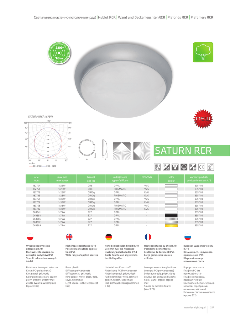 Светильники настенно-потолочные (рдд) Hublot RCR Wand und DeckenleuchtenRCR Plafonds RCR Plafoniery RCR SATURN RCR 1x75W 180° 105° 105° 90° 90° 75° 75° 60° 60° 45° 45° 30° 15° cd/km CO - C180 0° 15° SATURN RCR 30° C9O - C270 1 index index max moc max power trzonek end cap rodzaj klosza type of diffuser EVG/VVG 182754 182761 182778 182785 183751 183775 183768 183782 063541 063558 063565 063572 063589 1x28W 1x28W 1x28W 1x28W 1x38W 1x38W 1x38W 1x38W 1x75W 1x75W 1x75W 1x75W 1x75W GR8 GR8 GR10q GR10q GR10q GR10q GR10q GR10q E27 E27 E27 E27 E27 OPAL PRISMATIC OPAL PRISMATIC OPAL OPAL PRISMATIC PRISMATIC OPAL OPAL OPAL OPAL OPAL VVG VVG EVG EVG VVG EVG VVG EVG - kolor colour wymiary produktu product dimensions A/B 335/110 335/110 335/110 335/110 335/110 335/110 335/110 335/110 335/110 335/110 335/110 335/110 335/110 Wysoka odporność na uderzenia IK 10 Możliwość stosowania na zewnątrz budynków IP54 Szeroki zakres stosowanych źródeł High impact resistance IK 10 Possibility of outside application IP54 Wide range of applied sources Hohe Schlagbeständigkeit IK 10 Geeignet fuer die Aussenbeleuchtung an Gebaeuden IP54 Breite Palette von angewendeten Lichtquellen Haute résistance au choc IK 10 Possibilité de montage à l’extérieur du bâtiment IP54 Large gamme des sources utilisées Высокая ударопрочность IK 10 Возможность наружного применения IP65 Широкий спектр источников света Podstawa: tworzywo sztuczne Klosz: PC (policarbonat) Klosz: opal, prismatic Kolor pierścieni: biały, czarny, złoty, srebrny, srebrny mat Źródło światła: w komplecie (oprócz E27) Base: plastic Diffuser: polycarbonate Diffuser: mat, prismatic Ring colour: white, black, gold, silver, silver mat Light source: in the set (except E27) Unterteil aus Kunststoff Abdeckung: PC (Polycarbonat) Abdeckung opal, prismatisch Farbe der Ringe: weiß, schwarz, golden, silbern, silbermatt Inkl. Lichtquelle (ausgenommen E 27) Le corps: en matière plastique Le corps: PC (polycarbonate) Diffuseur: opale, prismatique Couleur des anneaux: blanche, noire, jaune, argent, argent mat Source de lumière: fourni (sauf E27) Корпус: пласмасса Плафон: PC (из поликарбоната) Плафон: опаловый, призматический Цвет колец: белый, чёрный, золотой, серебряный, матово-серебряный Источник света в комплекте (кроме Е27) www.lenalighting.pl 257