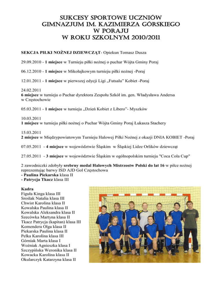 Sukcesy sportowe uczniów Gimnazjum im. Kazimierza Górskiego W Poraju W roku szkolnym 2010/2011 SEKCJA PIŁKI NOŻNEJ DZIEWCZĄT- Opiekun Tomasz Dusza 29.09.2010 - 1 miejsce w Turnieju piłki nożnej o puchar Wójta Gminy Poraj 06.12.2010 - 1 miejsce w Mikołajkowym turnieju piłki nożnej -Poraj 12.01.2011 - 1 miejsce w pierwszej edycji Ligi „Futsalu” Kobiet -Poraj 24.02.2011 6 miejsce w turnieju o Puchar dyrektora Zespołu Szkół im. gen. Władysława Andersa w Częstochowie 05.03.2011 - 1 miejsce w turnieju „Dzień Kobiet z Libero”- Myszków 10.03.2011 1 miejsce w turnieju piłki nożnej o Puchar Wójta Gminy Poraj Łukasza Stachery 15.03.2011 2 miejsce w Międzypowiatowym Turnieju Halowej Piłki Nożnej z okazji DNIA KOBIET -Poraj 07.05.2011 - 4 miejsce w województwie Śląskim w Śląskiej Lidze Orlików dziewcząt 27.05.2011 - 3 miejsce w województwie Śląskim w ogólnopolskim turnieju "Coca Cola Cup" 2 zawodniczki zdobyły srebrny medal Halowych Mistrzostw Polski do lat 16 w piłce nożnej reprezentując barwy ISD AJD Gol Częstochowa - Paulina Piekarska klasa II - Patrycja Tkacz klasa III Kadra Figuła Kinga klasa III Sroślak Natalia klasa III Chwist Karolina klasa II Kowalska Paulina klasa II Kowalska Aleksandra klasa II Szecówka Martyna klasa II Tkacz Patrycja (kapitan) klasa III Komendera Olga klasa II Piekarska Paulina klasa II Pelka Karolina klasa III Górniak Marta klasa I Woźniak Agnieszka klasa I Szczypińska Weronika klasa II Kowacka Karolina klasa II Okularczyk Katarzyna klasa II SEKCJA PIŁKI SIATKOWEJ DZIEWCZĄT – Opiekun Paweł Churas 29.11.2010 2 miejsce w Turnieju Piłki Siatkowej Dziewcząt o puchar Starosty Myszkowskiego Grudzień 2010 3 miejsce w Turnieju Piłki Siatkowej Dziewcząt o puchar Prezesa UKS Żarki Miasto 21.02.2011 1 miejsce w Turnieju Piłki Siatkowej Dziewcząt o puchar Wójta gminy Poraj 11.03.2011 3 miejsce w Powiatowym Turnieju Piłki Siatkowej Dziewcząt pod patronatem Wójta Gminy PORAJ Kadra: Sandra Gurbała Patrycja Sobota Barbara Kowal Kamila Jarkiewicz Patrycja Tomzik Magdalena Sawicka Ola Łakomska Ola Ratman Julia Karolkiewicz Klaudia Konieczko Dominika Komendera Dominika Sztanka Dominika Ordon Ewelina Jarkiewicz Agnieszka Woźniak Wiktoria Musialik Wiktoria Sołtysik Marcelina Małczak SEKCJA PIŁKI SIATKOWEJ CHŁOPCÓW – Opiekun Paweł Churas/Małgorzata Rodek 21.02.2011 1 miejsce w Turnieju Piłki Siatkowej Chłopców o puchar Wójta Gminy Poraj 01.03.2011 3 miejsce w Powiatowym Turnieju Piłki Siatkowej Chłopców SEKCJA PIŁKI NOŻNEJ CHŁOPCÓW – Opiekun Rafał Picz 01.10.2010 5 miejsce - Turniej „ORLIK 2012-Gram i kibicuje bezpiecznie.” 21.10.2010 1 miejsce - VI Powiatowy Turniej Piłki Nożnej w Kamienicy Polskiej 19.11.2010 1 miejsce - Gminny Turniej Futsalu w Poraju 06.12.2010 1 miejsce - Gminny Mikołajkowy Turniej Piłki Halowej Dziewcząt i Chłopców 11.02.2011 2 miejsce w Międzypowiatowej Ligi Piłki Halowej „MALPIH”. 09.03.2011 1 miejsce - Gminny Turniej Piłki Halowej Chłopców Puchar Wójta Gminy Poraj POZOSTAŁE SUKCESY 28.02.2011 3 miejsce - Powiatowe Mistrzostwa w Tenisie Stołowym Dziewcząt i Chłopców w Koziegłowach.Opiekun Rafał Picz 16.03.2011 2 miejsce - Rejonowe Mistrzostwa w Szachach Chłopców w Zawierciu – Opiekun Rafał Picz 03.02.2011 2 miejsce w Gminnym Turnieju Koszykówki chłopców – Opiekun Rafał Picz 03.02.2011 1 miejsce w Gminnym Turnieju Koszykówki dziewcząt – Opiekun Tomasz Dusza Skład drużyny Koszykówki dziewcząt 1. Tkacz Patrycja 2. Sroślak Natalia 3. Chwist Karolina 4. Kowalska Aleksandra 5. Kowalska Paulina 6. Piekarska Paulina 7. Komendera Olga 8. Szczypińska Weronika 9. Okularczyk Katarzyna 10. Zemła Aleksandra 11. Szecówka Martyna LEKKOATLETYKA- Opiekun Małgorzata Rodek GMINNE SZTAFETOWE BIEGI PRZEŁAJOWE ŻARKI LETNISKO, październik 2010 Klasa Dziewczęta Chłopcy Klasa I I miejsce-dz I miejsce-chł Wiktoria Musialik Karolina Kierat Natalia Bednarczyk Id Id Ib Paweł Biały Jakub Jędryka Marcin Szecówka Grzegorz Bajor Ia Ib Ib Ib Klasa II I miejsce –dz I miejsce- chł Katarzyna Okularczyk Weronika Szczypińska Martyna Szecówka Aleksandra Kowalska IIa IIa IId IIb Dawid Kosętka Dawid Szecówka Mariusz Bubak IIc IIa IIb Klasa III I miejsce-chł II miejsce-dz Angelika Pilarska Patrycja Tkacz Natalia Sawicka Angelika Hadzińska III b IIIc IIIc IIIb Dawid Piszczała Mateusz Walentek Marcin Marczak Bartosz Górecki IIIb IIIc IIIa IIId