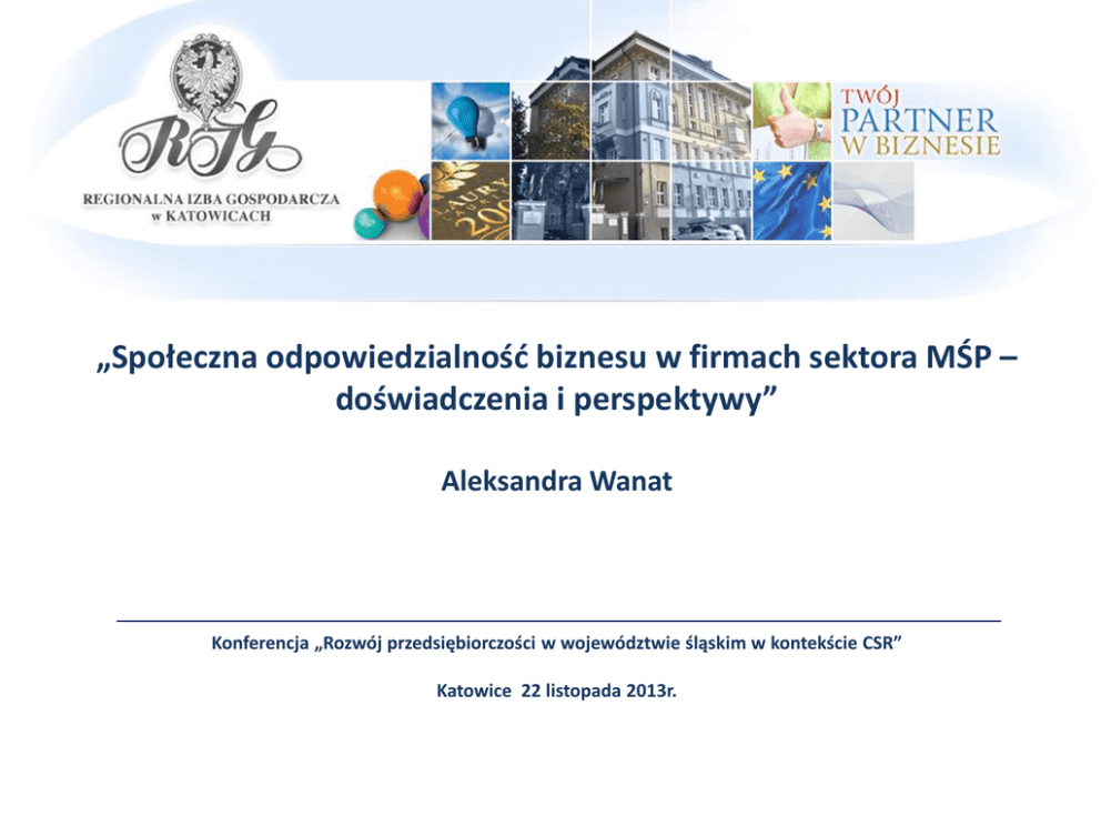 „Społeczna odpowiedzialność biznesu w firmach sektora MŚP – doświadczenia i perspektywy” Aleksandra Wanat Konferencja „Rozwój przedsiębiorczości w województwie śląskim w kontekście CSR” Katowice 22 listopada 2013r. Doświadczenia… Badanie kadry zarządzającej polskich firm sektora MŚP w zakresie CSR Badanie realizowane w ramach projektu systemowego Polskiej Agencji Rozwoju Przedsiębiorczości „Społeczna odpowiedzialność biznesu” współfinansowanego ze środków Europejskiego Funduszu Społecznego Grupa docelowa pierwszego etapu badań: 1000 przedstawicieli kadry zarządzającej sektora MŚP Cel badania: weryfikacja odsetka przedstawicieli grupy docelowej, którzy deklarują włączenie koncepcji CSR do prowadzonej działalności gospodarczej Realizacja pierwszego etapu badania: maj – lipiec 2013 Świadomość polskich firm sektora MŚP w zakresie CSR /Źródło: Badanie kadry zarządzającej w ramach projektu „Społeczna odpowiedzialność biznesu” na zlecenie PARP 2013/ Firmy, które spotkały się z pojęciem CSR rozumiały jego znaczenie najczęściej jako: Dbałość o otoczenie lokalne i jego rozwój – działania na rzecz społeczności lokalnej Odpowiedzialność wobec pracowników, godne warunki pracy i płacy Rzetelne, profesjonalne wykonywanie obowiązków Dbałość o dobro społeczne, interes społeczny Wspieranie lokalnych instytucji, grup, osób, organizacji Etyka prowadzenia biznesu, uczciwość i odpowiedzialność wobec klientów, kontrahentów, innych firm i otoczenia Dbałość o środowisko naturalne /Źródło: Badanie kadry zarządzającej w ramach projektu „Społeczna odpowiedzialność biznesu” na zlecenie PARP 2013/ Wybrane wnioski z badania Choć 2/3 polskich firm sektora MŚP w ogóle nie spotkało się z pojęciem CSR, to jednak wśród nich wysoki jest odsetek firm deklarujących realizowanie działań zgodnych z założeniami CSR Przedsiębiorstwa, które deklarują znajomość pojęcia CSR, utożsamiają ideę z pojedynczymi działaniami będącymi jedynie elementami CSR – brak im kompleksowej wiedzy na temat założeń i celów tego modelu zarządzania Bycie firmą społecznie odpowiedzialną jest często rozumiane jako działalność zgodnie z przepisami prawa, a nie jako dodatkowa i dobrowolna inicjatywa czy też model zarządzania Niemal wszystkie firmy, które zadeklarowały znajomość pojęcia CSR, wdrożyły działania zgodne z założeniami tego modelu Najczęściej wdrażane są te elementy, które są stosunkowo łatwe do wdrożenia, nie wymagają dużych nakładów i przynoszą wymierne korzyści dla firmy Bariery we wdrażaniu CSR w firmach sektora MŚP Brak świadomości Błędne pojmowanie istoty CSR wyłącznie jako działalności filantropijnej Postrzeganie CSR jako domeny dużych firm Zbyt wysokie koszty wprowadzenia CSR w MŚP Brak czasu Brak wiedzy i umiejętności Perspektywy… Rekomendacje przedsiębiorców sektora MŚP Upowszechnienie i promowanie idei CSR poprzez realizację programów i akcji informacyjnych dla firm sektora MŚP oraz promocję dobrych praktyk Wprowadzenie tematyki CSR na wszystkich poziomach edukacji w celu uświadomienia przyszłym przedsiębiorcom i pracownikom konieczności działania zgodnie z zasadami społecznej odpowiedzialności biznesu Wprowadzenie kryterium CSR jako jednego z kryteriów w zamówieniach publicznych Wsparcie finansowe na działania związane z wdrażaniem CSR w firmach sektora MŚP Powoływanie i aktywna działalność Rad ds. Społecznej Odpowiedzialności Biznesu przy Marszałkach Województw Ulga podatkowa dla firm wdrażających ideę CSR Program Zwiększenie konkurencyjności regionów poprzez społeczną odpowiedzialność biznesu (CSR) Program realizowany przez Polską Agencję Rozwoju Przedsiębiorczości, współfinansowany ze środków Szwajcarsko-Polskiego Programu Współpracy Komponent I Budowa kompetencji, spotkania informacyjne i szkolenia Komponent II Komponent III Wsparcie finansowe na wdrożenie CSR Upowszechnienie w MŚP – II rundy rezultatów konkursu i promocja najlepszych praktyk Na jakie działania można pozyskać wsparcie? Doradztwo w zakresie przygotowania lub wdrożenia strategii CSR. Audyt, z wyłączeniem audytu finansowego – np. audyt środowiskowy, energetyczny, procesu/wyrobu, systemu obsługi klienta, organizacyjny. Badania lub analizy produktów oraz procesów produkcyjnych lub usługowych, a także certyfikacja produktu, procesu lub usługi. Działania informacyjno-promocyjne – wyłącznie gdy stanowią element projektu. Inwestycje w rzeczowe składniki majątku oraz wartości niematerialne i prawne . Dobre praktyki CSR – przykłady projektów /1/ Status wnioskodawcy: mały przedsiębiorca Rodzaj działalności: przetwarzanie zużytego sprzętu elektrycznego i elektronicznego Działania: opracowanie strategii CSR audyt środowiskowy oraz wdrożenie systemu zarządzania środowiskowego przeprowadzenie analizy potrzeb szkoleniowych i stworzenie programu szkoleniowego dla pracowników opracowanie systemu ocen okresowych pracowników komunikacja społeczna opracowanie raportu odpowiedzialności społecznej przedsiębiorstwa Rezultaty: optymalizacja działalności - poprawa wyników ekonomicznych (obniżenie zużycia paliwa), zmniejszenie natężenia i zatorów w ruchu (ograniczanie pustych przebiegów) zmniejszeniu negatywnego wpływu na środowisko (mniejsze zużycie surowców naturalnych, obniżenie szkodliwych emisji, ograniczenie sumarycznego poziomu hałasu) podniesienie kwalifikacji pracowników współpraca ze społecznością lokalną Zwiększenie wiarygodności i poprawa pozycji konkurencyjnej firmy Dobre praktyki CSR – przykłady projektów/2/ Status wnioskodawcy: mikroprzedsiębiorca Rodzaj działalności: usługi w zakresie cięcia i obróbki metali Działania: stworzenie strategii CSR zastosowanie systemu filtrowentylacji spalin opracowanie i wdrożenie systemu zarządzania jakością ISO 9