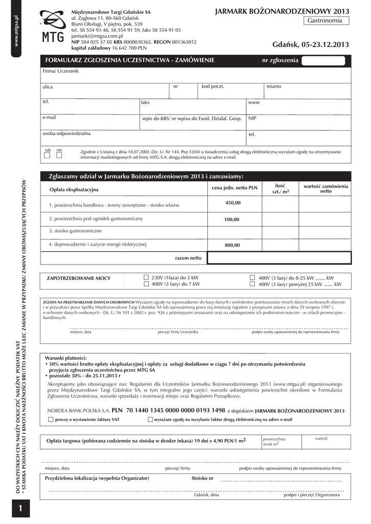 JARMARK BOŻONARODZENIOWY 2013 www.mtgsa.pl Międzynarodowe Targi Gdańskie SA ul. Żaglowa 11, 80-560 Gdańsk Biuro Obsługi, V piętro, pok. 539 tel. 58 554 93 48, 58 554 91 59, faks 58 554 91 03 [email protected] NIP 584 025 37 05 KRS 0000038362, REGON 001363012 kapitał zakładowy 16 642 700 PLN Gastronomia Gdańsk, 05-23.12.2013 FORMULARZ ZGŁOSZENIA UCZESTNICTWA - ZAMÓWIENIE nr zgłoszenia Firma/ Uczestnik nr ulica kod poczt. miasto tel. faks www e-mail wpis do KRS/ nr wpisu do Ewid. Działal. Gosp. NIP osoba odpowiedzialna DO WSZYSTKICH CEN NALEŻY DOLICZYĆ NALEŻNY PODATEK VAT * STAWKA PODATKU VAT I KWOTA NALEŻNOŚCI BRUTTO MOŻE ULEC ZMIANIE W PRZYPADKU ZMIANY OBOWIĄZUJĄCYCH PRZEPISÓW tak 1 nie tel. Zgodnie z Ustawą z dnia 18.07.2002 (Dz. U. Nr 144. Poz.1204) o świadczeniu usług drogą elektroniczną wyrażam zgodę na otrzymywanie informacji marketingowych od firmy MTG S.A. drogą elektroniczną na adres e-mail. Zgłaszamy udział w Jarmarku Bożonarodzeniowym 2013 i zamawiamy: cena jedn. netto PLN Opłata eksploatacyjna 1. powierzchnia handlowa - tereny zewnętrzne - stoisko własne 450,00 2. powierzchnia pod ogródek gastronomiczny 100,00 ilość szt./ m2 wartość zamówienia netto 3. stoisko gastronomiczne 4. doprowadzenie i zużycie energii elektrycznej 800,00 razem netto 230V (1faza) do 3 kW 400V (3 fazy) do 7 kW ZAPOTRZEBOWANIE MOCY 400V (3 fazy) do 8-25 kW ....... kW 400V (3 fazy) powyżej 25 kW ....... kW ZGODA NA PRZETWARZANIE DANYCH OSOBOWYCH Wyrażam zgodę na wprowadzenie do bazy danych i wielokrotne przetwarzanie moich danych osobowych obecnie i w przyszłości przez Spółkę Międzynarodowe Targi Gdańskie SA lub upoważnioną przez nią instytucję (zgodnie z przepisami ustawy z dnia 29 sierpnia 1997 r. o ochronie danych osobowych - Dz. U. Nr 101 z 2002 r. poz. 926 z późniejszymi zmianami) oraz na udostępnianie ich podmiotom trzecim - w celach promocyjno handlowych. miejsce, data pieczęć firmy Uczestnika podpis osoby upoważnionej do reprezentowania firmy Warunki płatności: • 50% wartości brutto opłaty eksploatacyjnej i opłaty za usługi dodatkowe w ciągu 7 dni po otrzymaniu potwierdzenia przyjęcia zgłoszenia uczestnictwa przez MTG SA • pozostałe 50% - do 25.11.2013 r Akceptujemy jako obowiązujące nas: Regulamin dla Uczestników Jarmarku Bożonarodzeniowego 2013 (www.mtgsa.pl) organizowanego przez Międzynarodowe Targi Gdańskie SA, w tym integralne jego części: warunki udostępnienia powierzchni określone w Formularzu Zgłoszenia Uczestnicwa, warunki sprzedaży i rezerwacji miejsc oraz Regulamin Porządkowy. NORDEA BANK POLSKA S.A. PLN 70 1440 1345 0000 0000 0193 1498 proszę o wystawienie faktury VAT z dopiskiem JARMARK BOŻONARODZENIOWY 2013 wyrażam zgodę na wysyłanie faktur drogą elektroniczną na adres e-mail Opłata targowa (pobierana codziennie na stoisku w drodze inkasa) 19 dni x 4,90 PLN/1 m2 miejsce, data Przydzielona lokalizacja (wypełnia Organizator) pieczęć firmy powierzchnia stoisk m2 wartość podpis osoby upoważnionej do reprezentowania firmy Stoisko nr Gdańsk, dnia podpis i pieczęć Organizatora www.mtgsa.pl Międzynarodowe Targi Gdańskie SA ul. Żaglowa 11, 80-560 Gdańsk Biuro Obsługi, V piętro, pok. 539 tel. 58 554 93 48, 58 554 91 59, faks 58 554 91 03 [email protected] NIP 584 025 37 05 KRS 0000038362, REGON 001363012 kapitał zakładowy 16 642 700 PLN JARMARK BOŻONARODZENIOWY 2013 Gastronomia Gdańsk, 05-23.12.2013 DO WSZYSTKICH CEN NALEŻY DOLICZYĆ NALEŻNY PODATEK VAT ZGODNIE Z OBOWIĄZUJĄCYMI PRZEPISAMI Regulamin porządkowy 2 • Jarmark Bożonarodzeniowy odbywa się w Gdańsku na Targu Węglowym w terminie 06-23.12.2013 r. • Uczestnik Jarmarku zobowiązany jest do prowadzenia działalności handlowej w godz. 11.00 - 19.00 tylko i wyłącznie w domkach MTG SA; ustawienie własnego stoiska możliwe jedynie po uprzedniej akceptacji MTG SA. • Po odbiór identyfikatorów oraz informacje na temat lokalizacji, organizacji, rozliczeń i faktur prosimy zgłaszać się w czasie Jarmarku do Biura Obsługi. Wszelkie awarie i usterki należy zgłaszać w Punkcie Serwisowym. • Odbiór identyfikatorów i kart wjazdowych: w dniu 04.12.2013 r. - w godz. 12.00-16.00 w dniu 05.12.2013 r. - od godz. 8.00 • Zaopatrzenie stoisk możliwe jest wyłącznie w godzinach 19.00 - 10.45 na podstawie wydanego przez MTG SA zezwolenia na wjazd na teren Jarmarku. • Na terenie Jarmarku obowiązuje bezwzględny zakaz parkowania pojazdów • Uczestnik Jarmarku może zagospodarować na potrzeby handlu wyłącznie wykupioną powierzchnię. • Uczestnik zobowiązany jest do utrzymywania estetycznego wyglądu stoiska i zaplecza. W przypadku nieuporządkowania zajmowanej powierzchni MTG SA zleci wykonanie prac porządkowych na koszt i ryzyko uczestnika. • Zabrania się pod rygorem odstąpienia od umowy przez MTG SA bez prawa do odszkodowania i bez zwrotu poniesionych kosztów uczestnictwa: - sprzedaży towarów niezgodnych z charakterem Jarmarku i niezweryfikowanych przez Organizatora, - wystawiania towarów poza obręb stoiska i umieszczania w ciągach komunikacyjnych przylegających do stoiska, - sprzedaży towarów bezpośrednio z chodnika, kartonów, itp. • Likwidacja stoisk musi nastąpić w dniu 23.12.2013 do godz. 22.00. Pozostałe obowiązujące warunki udziału – Regulamin MTG SA – www.mtgsa.com.pl