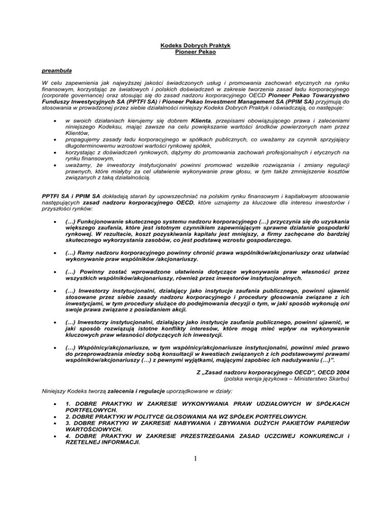 Kodeks Dobrych Praktyk Pioneer Pekao preambuła W celu zapewnienia jak najwyższej jakości świadczonych usług i promowania zachowań etycznych na rynku finansowym, korzystając ze światowych i polskich doświadczeń w zakresie tworzenia zasad ładu korporacyjnego (corporate governance) oraz stosując się do zasad nadzoru korporacyjnego OECD Pioneer Pekao Towarzystwo Funduszy Inwestycyjnych SA (PPTFI SA) i Pioneer Pekao Investment Management SA (PPIM SA) przyjmują do stosowania w prowadzonej przez siebie działalności niniejszy Kodeks Dobrych Praktyk i oświadczają, co następuje: • • • • w swoich działaniach kierujemy się dobrem Klienta, przepisami obowiązującego prawa i zaleceniami niniejszego Kodeksu, mając zawsze na celu powiększanie wartości środków powierzonych nam przez Klientów, propagujemy zasady ładu korporacyjnego w spółkach publicznych, co uważamy za czynnik sprzyjający długoterminowemu wzrostowi wartości rynkowej spółek, korzystając z doświadczeń rynkowych, dążymy do promowania zachowań profesjonalnych i etycznych na rynku finansowym, uważamy, że inwestorzy instytucjonalni powinni promować wszelkie rozwiązania i zmiany regulacji prawnych, które miałyby za cel ułatwienie wykonywanie praw głosu, w tym także zmniejszenie kosztów związanych z taką działalnością. PPTFI SA i PPIM SA dokładają starań by upowszechniać na polskim rynku finansowym i kapitałowym stosowanie następujących zasad nadzoru korporacyjnego OECD, które uznajemy za kluczowe dla interesu inwestorów i przyszłości rynków: • (…) Funkcjonowanie skutecznego systemu nadzoru korporacyjnego (…) przyczynia się do uzyskania większego zaufania, które jest istotnym czynnikiem zapewniającym sprawne działanie gospodarki rynkowej. W rezultacie, koszt pozyskiwania kapitału jest mniejszy, a firmy zachęcane do bardziej skutecznego wykorzystania zasobów, co jest podstawą wzrostu gospodarczego. • (…) Ramy nadzoru korporacyjnego powinny chronić prawa wspólników/akcjonariuszy oraz ułatwiać wykonywanie praw wspólników /akcjonariuszy. • (…) Powinny zostać wprowadzone ułatwienia dotyczące wykonywania praw własności przez wszystkich wspólników/akcjonariuszy, również przez inwestorów instytucjonalnych. • (…) Inwestorzy instytucjonalni, działający jako instytucje zaufania publicznego, powinni ujawnić stosowane przez siebie zasady nadzoru korporacyjnego i procedury głosowania związane z ich inwestycjami, w tym procedury służące do podejmowania decyzji o tym, w jaki sposób wykonują oni swoje prawa związane z posiadaniem akcji. • (…) Inwestorzy instytucjonalni, działający jako instytucje zaufania publicznego, powinni ujawnić, w jaki sposób rozwiązują istotne konflikty interesów, które mogą mieć wpływ na wykonywanie kluczowych praw własności dotyczących ich inwestycji. • (…) Wspólnicy/akcjonariusze, w tym wspólnicy/akcjonariusze instytucjonalni, powinni mieć prawo do przeprowadzania miedzy sobą konsultacji w kwestiach związanych z ich podstawowymi prawami wspólników/akcjonariuszy (…) z pewnymi wyjątkami, mającymi zapobiec ich nadużywaniu (…)”. Z „Zasad nadzoru korporacyjnego OECD”, OECD 2004 (polska wersja językowa – Ministerstwo Skarbu) Niniejszy Kodeks tworzą zalecenia i regulacje uporządkowane w działy: • • • • 1. DOBRE PRAKTYKI W ZAKRESIE WYKONYWANIA PRAW UDZIAŁOWYCH W SPÓŁKACH PORTFELOWYCH. 2. DOBRE PRAKTYKI W POLITYCE GŁOSOWANIA NA WZ SPÓŁEK PORTFELOWYCH. 3. DOBRE PRAKTYKI W ZAKRESIE NABYWANIA i ZBYWANIA DUŻYCH PAKIETÓW PAPIERÓW WARTOŚCIOWYCH. 4. DOBRE PRAKTYKI W ZAKRESIE PRZESTRZEGANIA ZASAD UCZCIWEJ KONKURENCJI i RZETELNEJ INFORMACJI. 1 • • 5. DOBRE PRAKTYKI W ZAKRESIE WYKRYWANIA, UJAWNIANIA KONFLIKTEM INTERESÓW 6. OBOWIĄZEK STOSOWANIA ZASAD KODEKSU W PRAKTYCE. ORAZ ZARZĄDZANIA Przyjmując i ogłaszając niniejszy Kodeks Dobrych Praktyk, PPTFI SA i PPIM SA zakładają, iż zapisy niniejszego dokumentu będą doskonalone, uzupełnianie i rozbudowywane wraz ze zdobywaniem kolejnych doświadczeń rynkowych oraz ewolucją prawa. Kodeks Dobrych Praktyk Pioneer Pekao DEFINICJE: Użyte w niniejszym Kodeksie definicje i skróty mają następujące znaczenie: 1) Pioneer Pekao – oznacza Pioneer Pekao Towarzystwo Funduszy Inwestycyjnych SA i Pioneer Pekao Investment Management SA, 2) Klient – oznacza uczestnika funduszy inwestycyjnych i posiadacza portfeli indywidualnych zarządzanych przez Pioneer Pekao, 3) Spółka Portfelowa – oznacza spółkę, której akcje nabywane są przez Pioneer Pekao dla Klientów, 4) WZ – oznacza walne zgromadzenie, 5) GIPS – Global Investment Performance Standards, globalne standardy prezentacji wyników inwestycyjnych 6) Inwestor Instytucjonalny – oznacza w szczególności banki, zakłady ubezpieczeń, fundusze emerytalne, firmy inwestycyjne, fundusze inwestycyjne i inne instytucje wspólnego inwestowania. 1. DOBRE PRAKTYKI PORTFELOWYCH. W ZAKRESIE WYKONYWANIA PRAW UDZIAŁOWYCH W SPÓŁKACH 1.1. Uczestnictwo w WZ. Przedstawiciele Pioneer Pekao powinni brać udział we wszystkich walnych zgromadzeniach Spółki Portfelowej, jeśli akcje tej spółki wchodzące w skład aktywów funduszy inwestycyjnych lub portfeli indywidualnych reprezentują co najmniej 5% głosów na walnym zgromadzeniu. 1.2. Kryterium istotności uczestnictwa w WZ. Przy udziałach mniejszych od poziomu wskazanego w punkcie 1.1. przedstawiciel Pioneer Pekao, w miarę możliwości, także powinien wziąć udział w walnym zgromadzeniu, na którym przedmiotem obrad są istotne sprawy Spółki Portfelowej, a zaniechanie wykonywania prawa głosu mogłoby spowodować utratę wartości posiadanych akcji wskutek dopuszczenia do podjęcia uchwał szkodliwych z punktu widzenia Klientów. 1.3. Kryterium efektywności uczestnictwa w WZ. Pioneer Pekao może rozważyć korzyści i koszty związane z udziałem na walnym zgromadzeniu i w przypadku uznania, że 
