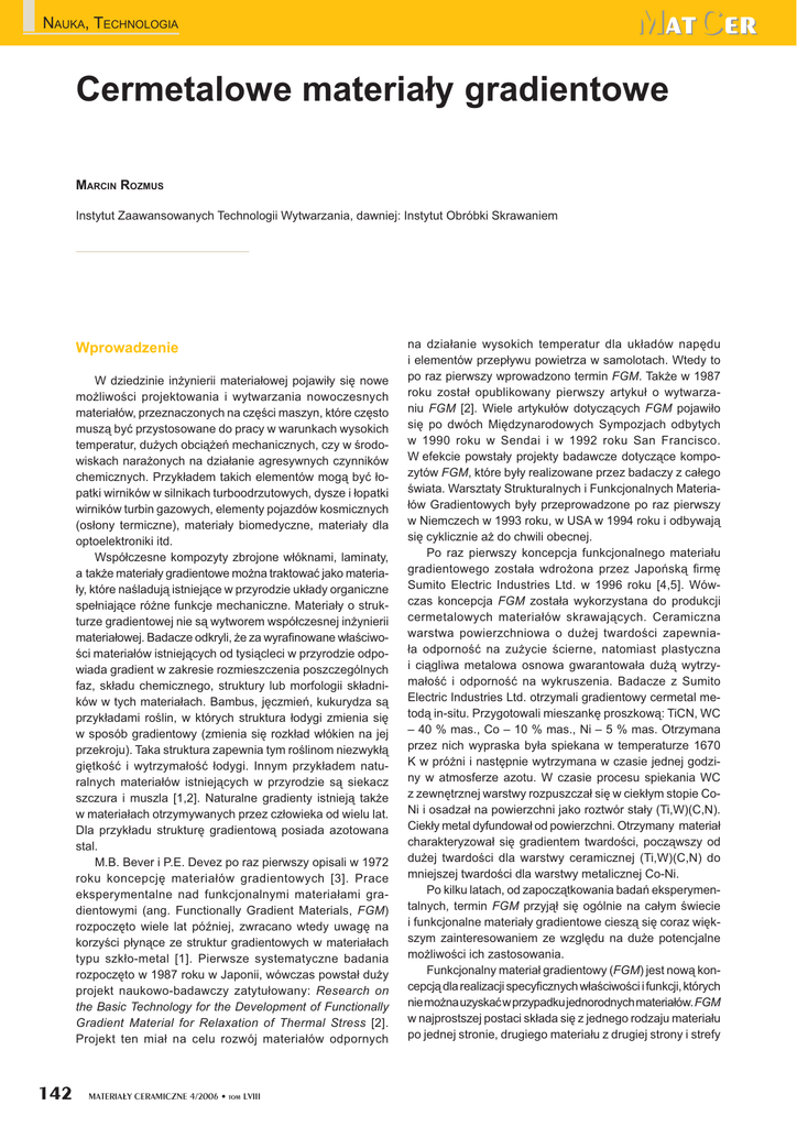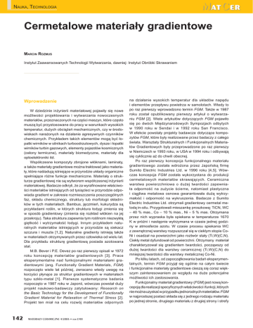 MatCer NAUKA, TECHNOLOGIA Cermetalowe materiay gradientowe MARCIN ROZMUS Instytut Zaawansowanych Technologii Wytwarzania, dawniej: Instytut Obróbki Skrawaniem Wprowadzenie W dziedzinie inynierii materiaowej pojawiy si nowe moliwoci projektowania i wytwarzania nowoczesnych materiaów, przeznaczonych na czci maszyn, które czsto musz by przystosowane do pracy w warunkach wysokich temperatur, duych obcie mechanicznych, czy w rodowiskach naraonych na dziaanie agresywnych czynników chemicznych. Przykadem takich elementów mog by opatki wirników w silnikach turboodrzutowych, dysze i opatki wirników turbin gazowych, elementy pojazdów kosmicznych (osony termiczne), materiay biomedyczne, materiay dla optoelektroniki itd. Wspóczesne kompozyty zbrojone wóknami, laminaty, a take materiay gradientowe mona traktowa jako materiay, które naladuj istniejce w przyrodzie ukady organiczne speniajce róne funkcje mechaniczne. Materiay o strukturze gradientowej nie s wytworem wspóczesnej inynierii materiaowej. Badacze odkryli, e za wyrafinowane waciwoci materiaów istniejcych od tysicleci w przyrodzie odpowiada gradient w zakresie rozmieszczenia poszczególnych faz, skadu chemicznego, struktury lub morfologii skadników w tych materiaach. Bambus, jczmie, kukurydza s przykadami rolin, w których struktura odygi zmienia si w sposób gradientowy (zmienia si rozkad wókien na jej przekroju). Taka struktura zapewnia tym rolinom niezwyk gitko i wytrzymao odygi. Innym przykadem naturalnych materiaów istniejcych w przyrodzie s siekacz szczura i muszla [1,2]. Naturalne gradienty istniej take w materiaach otrzymywanych przez czowieka od wielu lat. Dla przykadu struktur gradientow posiada azotowana stal. M.B. Bever i P.E. Devez po raz pierwszy opisali w 1972 roku koncepcj materiaów gradientowych [3]. Prace eksperymentalne nad funkcjonalnymi materiaami gradientowymi (ang. Functionally Gradient Materials, FGM) rozpoczto wiele lat póniej, zwracano wtedy uwag na korzyci pynce ze struktur gradientowych w materiaach typu szko-metal [1]. Pierwsze systematyczne badania rozpoczto w 1987 roku w Japonii, wówczas powsta duy projekt naukowo-badawczy zatytuowany: Research on the Basic Technology for the Development of Functionally Gradient Material for Relaxation of Thermal Stress [2]. Projekt ten mia na celu rozwój materiaów odpornych 142 MATERIA£Y CERAMICZNE 4/2006 • tom LVIII na dziaanie wysokich temperatur dla ukadów napdu i elementów przepywu powietrza w samolotach. Wtedy to po raz pierwszy wprowadzono termin FGM. Take w 1987 roku zosta opublikowany pierwszy artyku o wytwarzaniu FGM [2]. Wiele artykuów dotyczcych FGM pojawio si po dwóch Midzynarodowych Sympozjach odbytych w 1990 roku w Sendai i w 1992 roku San Francisco. W efekcie powstay projekty badawcze dotyczce kompozytów FGM, które byy realizowane przez badaczy z caego wiata. Warsztaty Strukturalnych i Funkcjonalnych Materiaów Gradientowych byy przeprowadzone po raz pierwszy w Niemczech w 1993 roku, w USA w 1994 roku i odbywaj si cyklicznie a do chwili obecnej. Po raz pierwszy koncepcja funkcjonalnego materiau gradientowego zostaa wdroona przez Japosk firm Sumito Electric Industries Ltd. w 1996 roku [4,5]. Wówczas koncepcja FGM zostaa wykorzystana do produkcji cermetalowych materiaów skrawajcych. Ceramiczna warstwa powierzchniowa o duej twardoci zapewniaa odporno na zuycie cierne, natomiast plastyczna i cigliwa metalowa osnowa gwarantowaa du wytrzymao i odporno na wykruszenia. Badacze z Sumito Electric Industries Ltd. otrzymali gradientowy cermetal metod in-situ. Przygotowali mieszank proszkow: TiCN, WC – 40 % mas., Co – 10 % mas., Ni – 5 % mas. Otrzymana przez nich wypraska bya spiekana w temperaturze 1670 K w próni i nastpnie wytrzymana w czasie jednej godziny w atmosferze azotu. W czasie procesu spiekania WC z zewntrznej warstwy rozpuszcza si w ciekym stopie CoNi i osadza na powierzchni jako roztwór stay (Ti,W)(C,N). Cieky metal dyfundowa od powierzchni. Otrzymany materia charakteryzowa si gradientem twardoci, poczwszy od duej twardoci dla warstwy ceramicznej (Ti,W)(C,N) do mniejszej twardoci dla warstwy metalicznej Co-Ni. Po kilku latach, od zapocztkowania bada eksperymentalnych, termin FGM przyj si ogólnie na caym wiecie i funkcjonalne materiay gradientowe ciesz si coraz wikszym zainteresowaniem ze wzgldu na due potencjalne moliwoci ich zastosowania. Funkcjonalny materia gradientowy (FGM) jest now koncepcj dla realizacji specyficznych waciwoci i funkcji, których nie mona uzyska w przypadku jednorodnych materiaów. FGM w najprostszej postaci skada si z jednego rodzaju materiau po jednej stronie, drugiego materiau z drugiej strony i strefy NAUKA, TECHNOLOGIA Rys. 1. Podstawowe rodzaje budowy proszkowych materiaów kompozytowych, ze wzgldu na rozmieszczenie faz (ciemna i biaa barwa na rysunku) w materiale. poredniej, której skad i morfologia zmienia si w sposób cigy. Podstawowe rodzaje budowy materiaów kompozytowych przedstawia rysunek 1. Kompozytem gradientowym jest np. materia laminatowy o zmieniajcym si skadzie [6]. Gradient danej waciwoci materiaowej realizowany jest przede wszystkim przez zmiany parametrów takich jak: skad chemiczny, gsto, wielko ziaren, oraz mikrostruktura w funkcji pooenia [1]. Sposób sterowania zaplanowanym gradientem jest jednym z podstawowych problemów w procesie projektowania kompozytów gradientowych [2,7,8]. Wystpuje przy tym sprzenie metod wytwarzania tych materiaów (co za tym idzie ich waciwoci) z nowymi technologiami do których zaliczamy rónego rodzaju techniki wytwarzania materiaów konstrukcyjnych, narzdziowych, biomedycznych, a gównie techniki elektroniczne. Rozwój technik wytwarzania materiaów opiera si na znanych od lat prawach fizyki, chemii oraz mechaniki, nie mniej osiga si tu waciwoci tworzyw trudne do uzyskania w przypadku materiaów wytwarzanych tradycyjnymi metodami [9]. Kompozyty ceramika-metal nale do grupy materiaów inynierskich stosowanych zarówno jako materiay konstrukcyjn