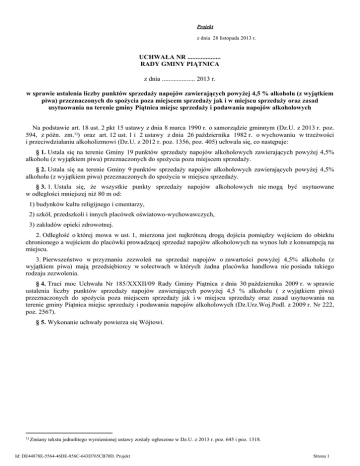 Projekt z dnia 28 listopada 2013 r. UCHWAŁA NR .................... RADY GMINY PIĄTNICA z dnia .................... 2013 r. w sprawie ustalenia liczby punktów sprzedaży napojów zawierających powyżej 4,5 % alkoholu (z wyjątkiem piwa) przeznaczonych do spożycia poza miejscem sprzedaży jak i w miejscu sprzedaży oraz zasad usytuowania na terenie gminy Piątnica miejsc sprzedaży i podawania napojów alkoholowych Na podstawie art. 18 ust. 2 pkt 15 ustawy z dnia 8 marca 1990 r. o samorządzie gminnym (Dz.U. z 2013 r. poz. 594, z późn. zm.1)) oraz art. 12 ust. 1 i 2 ustawy z dnia 26 października 1982 r. o wychowaniu w trzeźwości i przeciwdziałaniu alkoholizmowi (Dz.U. z 2012 r. poz. 1356, poz. 405) uchwala się, co następuje: § 1. Ustala się na terenie Gminy 19 punktów sprzedaży napojów alkoholowych zawierających powyżej 4,5% alkoholu (z wyjątkiem piwa) przeznaczonych do spożycia poza miejscem sprzedaży. § 2. Ustala się na terenie Gminy 9 punktów sprzedaży napojów alkoholowych zawierających powyżej 4,5% alkoholu (z wyjątkiem piwa) przeznaczonych do spożycia w miejscu sprzedaży. § 3. 1. Ustala się, że wszystkie punkty sprzedaży napojów alkoholowych nie mogą być usytuowane w odległości mniejszej niż 80 m od: 1) budynków kultu religijnego i cmentarzy, 2) szkół, przedszkoli i innych placówek oświatowo-wychowawczych, 3) zakładów opieki zdrowotnej. 2. Odległość o której mowa w ust. 1, mierzona jest najkrótszą drogą dojścia pomiędzy wejściem do obiektu chronionego a wejściem do placówki prowadzącej sprzedaż napojów alkoholowych na wynos lub z konsumpcją na miejscu. 3. Pierwszeństwo w przyznaniu zezwoleń na sprzedaż napojów o zawartości powyżej 4,5% alkoholu (z wyjątkiem piwa) mają przedsiębiorcy w sołectwach w których żadna placówka handlowa nie posiada takiego rodzaju zezwolenia. § 4. Traci moc Uchwała Nr 185/XXXII/09 Rady Gminy Piątnica z dnia 30 października 2009 r. w sprawie ustalenia liczby punktów sprzedaży napojów zawierających powyżej 4,5 % alkoholu ( z wyjątkiem piwa) przeznaczonych do spożycia poza miejscem sprzedaży jak i w miejscu sprzedaży oraz zasad usytuowania na terenie gminy Piątnica miejsc sprzedaży i podawania napojów alkoholowych (Dz.Urz.Woj.Podl. z 2009 r. Nr 222, poz. 2567). § 5. Wykonanie uchwały powierza się Wójtowi. 1) Zmiany tekstu jednolitego wymienionej ustawy zostały ogłoszone w Dz.U. z 2013 r. poz. 645 i poz. 1318. Id: DE44878E-5564-46DE-856C-643D765CB70D. Projekt Strona 1 § 6. Uchwała wchodzi w życie po upływie 14 dni od dnia jej ogłoszenia w Dzienniku Urzędowym Województwa Podlaskiego. Przewodniczący Rady Dariusz Kossakowski Id: DE44878E-5564-46DE-856C-643D765CB70D. Projekt Strona 2 UZASADNIENIE Zgodnie z art. 12 ust. 1 ustawy z dnia 26 października 1982 r. o wychowaniu w trzeźwości i przeciwdziałaniu alkoholizmowi (Dz.U. z 2012 r., poz. 1356, z późn. zm.) do kompetencji Rady Gminy należy ustalanie liczby punktów sprzedaży napojów alkoholowych zawierających powyżej 4,5% alkoholu (z wyjątkiem piwa) przeznaczonych do spożycia poza miejscem sprzedaży jak i w miejscu sprzedaży. Rada Gminy Piątnica Uchwałą Nr 185/XXXII/09 z dnia 30 października 2009 r. w sprawie ustalenia liczby punktów sprzedaży napojów zawierających powyżej 4,5% alkoholu (z wyjątkiem piwa) przeznaczonych do spożycia poza miejscem sprzedaży jak i w miejscu sprzedaży oraz zasad usytuowania na terenie gminy Piątnica miejsc sprzedaży i podawania napojów alkoholowych, przyjęła limit dziewięciu punktów w miejscu sprzedaży i szesnastu punktów poza miejscem sprzedaży. Wnoszę o zwiększenie limitu o 3 punkty sprzedaży napojów alkoholowych zawierających powyżej 4,5% alkoholu (z wyjątkiem piwa) przeznaczonych do spożycia poza miejscem sprzedaży. Id: DE44878E-5564-46DE-856C-643D765CB70D. Projekt Strona 1