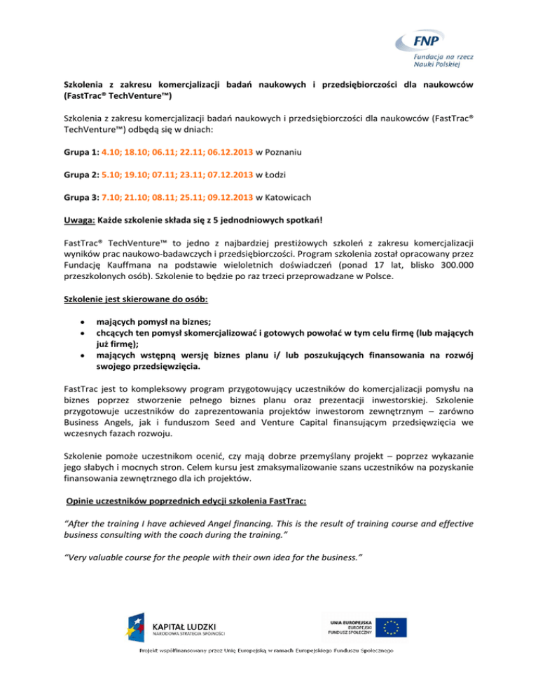 Szkolenia z zakresu komercjalizacji badań naukowych i przedsiębiorczości dla naukowców (FastTrac® TechVenture™) Szkolenia z zakresu komercjalizacji badań naukowych i przedsiębiorczości dla naukowców (FastTrac® TechVenture™) odbędą się w dniach: Grupa 1: 4.10; 18.10; 06.11; 22.11; 06.12.2013 w Poznaniu Grupa 2: 5.10; 19.10; 07.11; 23.11; 07.12.2013 w Łodzi Grupa 3: 7.10; 21.10; 08.11; 25.11; 09.12.2013 w Katowicach Uwaga: Każde szkolenie składa się z 5 jednodniowych spotkań! FastTrac® TechVenture™ to jedno z najbardziej prestiżowych szkoleń z zakresu komercjalizacji wyników prac naukowo-badawczych i przedsiębiorczości. Program szkolenia został opracowany przez Fundację Kauffmana na podstawie wieloletnich doświadczeń (ponad 17 lat, blisko 300.000 przeszkolonych osób). Szkolenie to będzie po raz trzeci przeprowadzane w Polsce. Szkolenie jest skierowane do osób: mających pomysł na biznes; chcących ten pomysł skomercjalizować i gotowych powołać w tym celu firmę (lub mających już firmę); mających wstępną wersję biznes planu i/ lub poszukujących finansowania na rozwój swojego przedsięwzięcia. FastTrac jest to kompleksowy program przygotowujący uczestników do komercjalizacji pomysłu na biznes poprzez stworzenie pełnego biznes planu oraz prezentacji inwestorskiej. Szkolenie przygotowuje uczestników do zaprezentowania projektów inwestorom zewnętrznym – zarówno Business Angels, jak i funduszom Seed and Venture Capital finansującym przedsięwzięcia we wczesnych fazach rozwoju. Szkolenie pomoże uczestnikom ocenić, czy mają dobrze przemyślany projekt – poprzez wykazanie jego słabych i mocnych stron. Celem kursu jest zmaksymalizowanie szans uczestników na pozyskanie finansowania zewnętrznego dla ich projektów. Opinie uczestników poprzednich edycji szkolenia FastTrac: “After the training I have achieved Angel financing. This is the result of training course and effective business consulting with the coach during the training.” “Very valuable course for the people with their own idea for the business.” Szkolenie składa się z 10 modułów z czego pierwsze 4 dotyczą analizy samego pomysłu na biznes i przygotowania się do pracy nad biznes planem. Kolejne 6 modułów to planowanie całego biznesu – strategii wejścia na rynek, finansów, budowania odpowiedniego zespołu i jego wynagradzania, ochrony własności intelektualnej i patentowania rozwiązań, zarządzania płynnością finansową oraz pracy z inwestorami i prezentacji całego przedsięwzięcia przed profesjonalnymi inwestorami (Business Angels, Venture Capital). Szkolenie uwzględnia polski kontekst oraz prezentuje najlepsze praktyki zagraniczne w zakresie rozwijania przedsiębiorczości w środowisku naukowym. Uwaga: Szkolenie będzie wymagało od uczestników dużego zaangażowania, samodzielnego wykonywania zadań także poza zajęciami – prosimy o uwzględnienie tego wymogu przy podejmowaniu decyzji o złożeniu aplikacji. Praca własna przewidziana jest po każdych zajęciach. Zapisy prowadzone są https://szkolenia.fnp.org.pl do 12 września 2013r. przez internetową bazę szkoleń Zapisów można dokonać po zalogowaniu się na swoje konto i po wejściu w zakładkę „RekrutacjaRekrutacja na szkolenia”. Osoby nieposiadające konta w bazie muszą najpierw takie konto założyć. Należy się zapisywać tylko na jedną z dostępnych grup! Każde szkolenie składa się z 5 jednodniowych spotkań! Uczestnicy: - pracownicy naukowi zamieszkali w Polsce, zatrudnieni na umowę o pracę w jednostce naukowej posiadającej siedzibę na terenie RP - doktoranci z polskich jednostek naukowych, zamieszkali w Polsce. Osoby, które zapiszą się w bazie na to szkolenie do 12 września, i spełnią powyższe warunki formalne, wezmą udział w rekrutacji, podczas której wyłoniona zostanie lista osób przyjętych na szkolenie. Z wybranymi osobami przeprowadzona zostanie rozmowa telefoniczna/ skype. Osoby, które zapiszą się na szkolenie po upływie podanego terminu, znajdą się na liście rezerwowej i wezmą udział w rekrutacji, pod warunkiem że będą jeszcze wolne miejsca w grupach. Szkolenia będą odbywać się w języku angielskim. Od uczestników oczekuje się biegłej znajomości języka angielskiego. Przed szkoleniem uczestnikom zostaną rozesłane materiały do lektury własnej, zawierające niezbędne informacje, które będą przydatne podczas spotkań. Prowadzący: Jacek Błoński, Luigi Amati, Marco Villa, Andrea di Anselmo Szkolenia są bezpłatne. Organizator zapewnia uczestnikom wyżywienie podczas szkolenia, a także nocleg osobom spoza miasta, w którym odbywa się szkolenie. Dojazd na szkolenie uczestnicy organizują we własnym zakresie i na własny koszt. Każdy uczestnik szkolenia będzie zobowiązany podpisać umowę z organizatorem, w której między innymi zobowiąże się do zachowania wymaganej frekwencji na zajęciach.
