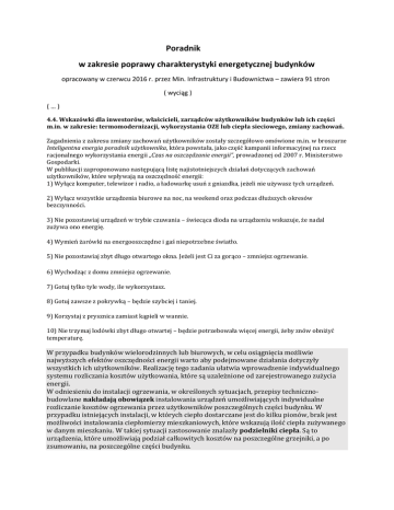 Poradnik w zakresie poprawy charakterystyki energetycznej budynków opracowany w czerwcu 2016 r. przez Min. Infrastruktury i Budownictwa – zawiera 91 stron ( wyciąg ) (…) 4.4. Wskazówki dla inwestorów, właścicieli, zarządców użytkowników budynków lub ich części m.in. w zakresie: termomodernizacji, wykorzystania OZE lub ciepła sieciowego, zmiany zachowań. Zagadnienia z zakresu zmiany zachowań użytkowników zostały szczegółowo omówione m.in. w broszurze Inteligentna energia poradnik użytkownika, która powstała, jako część kampanii informacyjnej na rzecz racjonalnego wykorzystania energii „Czas na oszczędzanie energii”, prowadzonej od 2007 r. Ministerstwo Gospodarki. W publikacji zaproponowano następującą listę najistotniejszych działań dotyczących zachowań użytkowników, które wpływają na oszczędność energii: 1) Wyłącz komputer, telewizor i radio, a ładowarkę usuń z gniazdka, jeżeli nie używasz tych urządzeń. 2) Wyłącz wszystkie urządzenia biurowe na noc, na weekend oraz podczas dłuższych okresów bezczynności. 3) Nie pozostawiaj urządzeń w trybie czuwania – świecąca dioda na urządzeniu wskazuje, że nadal zużywa ono energię. 4) Wymień żarówki na energooszczędne i gaś niepotrzebne światło. 5) Nie pozostawiaj zbyt długo otwartego okna. Jeżeli jest Ci za gorąco – zmniejsz ogrzewanie. 6) Wychodząc z domu zmniejsz ogrzewanie. 7) Gotuj tylko tyle wody, ile wykorzystasz. 8) Gotuj zawsze z pokrywką – będzie szybciej i taniej. 9) Korzystaj z prysznica zamiast kąpieli w wannie. 10) Nie trzymaj lodówki zbyt długo otwartej – będzie potrzebowała więcej energii, żeby znów obniżyć temperaturę. W przypadku budynków wielorodzinnych lub biurowych, w celu osiągnięcia możliwie najwyższych efektów oszczędności energii warto aby podejmowane działania dotyczyły wszystkich ich użytkowników. Realizację tego zadania ułatwia wprowadzenie indywidualnego systemu rozliczania kosztów użytkowania, które są uzależnione od zarejestrowanego zużycia energii. W odniesieniu do instalacji ogrzewania, w określonych sytuacjach, przepisy technicznobudowlane nakładają obowiązek instalowania urządzeń umożliwiających indywidualne rozliczanie kosztów ogrzewania przez użytkowników poszczególnych części budynku. W przypadku istniejących instalacji, w których ciepło dostarczane jest do kilku pionów, brak jest możliwości instalowania ciepłomierzy mieszkaniowych, które wskazują ilość ciepła zużywanego w danym mieszkaniu. W takiej sytuacji zastosowanie znalazły podzielniki ciepła. Są to urządzenia, które umożliwiają podział całkowitych kosztów na poszczególne grzejniki, a po zsumowaniu, na poszczególne części budynku. W przypadku instalacji ciepłej wody użytkowej, zamontowanie wodomierzy również wpływa na racjonalne jej zużywanie. Dodatkowo w celu modernizacji instalacji istniejących, warto zwrócić uwagę na następujące aspekty: zapewnienie sprawności wszystkich elementów aparatury czerpalnej oraz szczelności przewodów, odpowiednią izolację termiczną przewodów (izolowanie przewodów przebiegających przez pomieszczenia nieogrzewane), poprawę działania układu przygotowującego ciepłą wodę oraz układu cyrkulacyjnego i wprowadzenie cyrkulacji pompowej z wyłącznikiem czasowym, które zapewniają, że ciepła woda pojawia się w krótkim czasie od momentu odkręcenia kurka; wyłącznik czasowy warto zaprogramować tak, by pompa cyrkulacyjna działała jedynie w okresie największego zapotrzebowania na ciepłą wodę, wprowadzenie automatycznej regulacji temperatury wody oraz pracy pompy obiegowej i cyrkulacyjnej, wprowadzenie regulatora ciśnienia na przyłączu wodociągowym, wprowadzenie specjalnej aparatury umożliwiającej oszczędność ciepłej wody np. perlatorów, urządzeń zamykających przepływ wody w niezakręconych kranach itp. Wskazane rozwiązania wpłyną na poprawę efektywności energetycznej przyczyniając się jednocześnie do zwiększenia komfortu użytkowania budynku. (…) ( Uwaga: fragment tekstu wyeksponowany – K.D. )