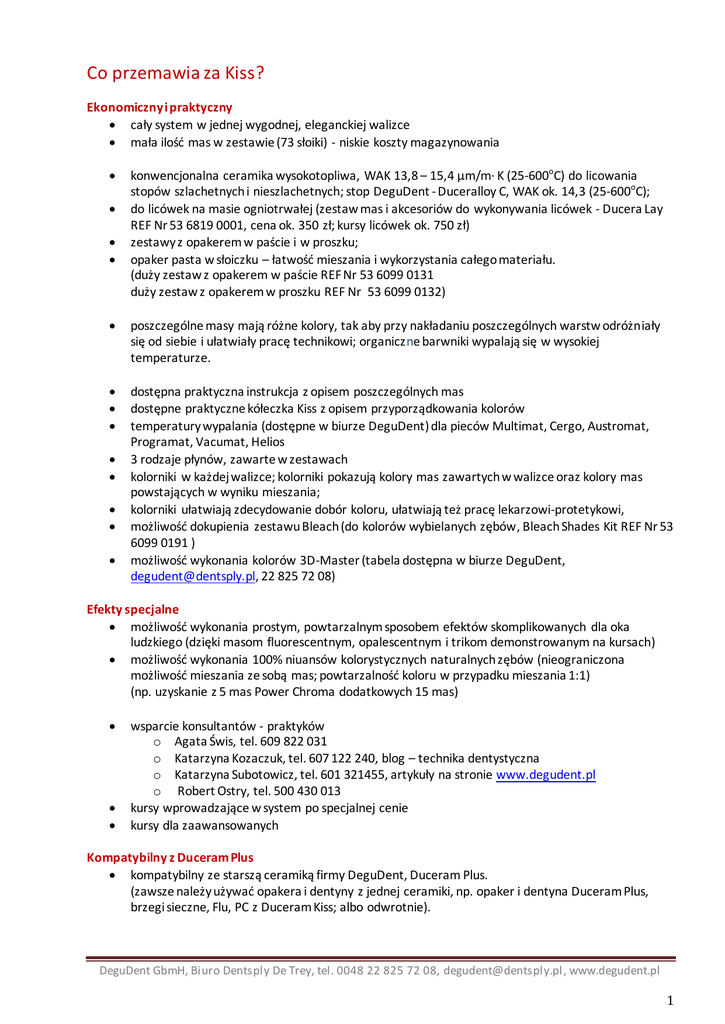 Co przemawia za Kiss? Ekonomiczny i praktyczny cały system w jednej wygodnej, eleganckiej walizce mała ilość mas w zestawie (73 słoiki) - niskie koszty magazynowania konwencjonalna ceramika wysokotopliwa, WAK 13,8 – 15,4 µm/m· K (25-600oC) do licowania stopów szlachetnych i nieszlachetnych; stop DeguDent - Duceralloy C, WAK ok. 14,3 (25-600oC); do licówek na masie ogniotrwałej (zestaw mas i akcesoriów do wykonywania licówek - Ducera Lay REF Nr 53 6819 0001, cena ok. 350 zł; kursy licówek ok. 750 zł) zestawy z opakerem w paście i w proszku; opaker pasta w słoiczku – łatwość mieszania i wykorzystania całego materiału. (duży zestaw z opakerem w paście REF Nr 53 6099 0131 duży zestaw z opakerem w proszku REF Nr 53 6099 0132) poszczególne masy mają różne kolory, tak aby przy nakładaniu poszczególnych warstw odróżniały się od siebie i ułatwiały pracę technikowi; organiczne barwniki wypalają się w wysokiej temperaturze. dostępna praktyczna instrukcja z opisem poszczególnych mas dostępne praktyczne kółeczka Kiss z opisem przyporządkowania kolorów temperatury wypalania (dostępne w biurze DeguDent) dla pieców Multimat, Cergo, Austromat, Programat, Vacumat, Helios 3 rodzaje płynów, zawarte w zestawach kolorniki w każdej walizce; kolorniki pokazują kolory mas zawartych w walizce oraz kolory mas powstających w wyniku mieszania; kolorniki ułatwiają zdecydowanie dobór koloru, ułatwiają też pracę lekarzowi-protetykowi, możliwość dokupienia zestawu Bleach (do kolorów wybielanych zębów, Bleach Shades Kit REF Nr 53 6099 0191 ) możliwość wykonania kolorów 3D-Master (tabela dostępna w biurze DeguDent, [email protected], 22 825 72 08) Efekty specjalne możliwość wykonania prostym, powtarzalnym sposobem efektów skomplikowanych dla oka ludzkiego (dzięki masom fluorescentnym, opalescentnym i trikom demonstrowanym na kursach) możliwość wykonania 100% niuansów kolorystycznych naturalnych zębów (nieograniczona możliwość mieszania ze sobą mas; powtarzalność koloru w przypadku mieszania 1:1) (np. uzyskanie z 5 mas Power Chroma dodatkowych 15 mas) wsparcie konsultantów - praktyków o Agata Świs, tel. 609 822 031 o Katarzyna Kozaczuk, tel. 607 122 240, blog – technika dentystyczna o Katarzyna Subotowicz, tel. 601 321455, artykuły na stronie www.degudent.pl o Robert Ostry, tel. 500 430 013 kursy wprowadzające w system po specjalnej cenie kursy dla zaawansowanych Kompatybilny z Duceram Plus kompatybilny ze starszą ceramiką firmy DeguDent, Duceram Plus. (zawsze należy używać opakera i dentyny z jednej ceramiki, np. opaker i dentyna Duceram Plus, brzegi sieczne, Flu, PC z Duceram Kiss; albo odwrotnie). DeguDent GbmH, Biuro Dentsply De Trey, tel. 0048 22 825 72 08, [email protected] , www.degudent.pl 1 DeguDent GbmH, Biuro Dentsply De Trey, tel. 0048 22 825 72 08, [email protected] , www.degudent.pl 2