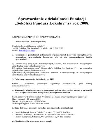 Sprawozdanie z działalności Fundacji „Sokólski Fundusz Lokalny” za rok 2008. I.WPROWADZENIE DO SPRAWOZDANIA 1. Nazwa siedziba i adres organizacji Fundacja „Sokólski Fundusz Lokalny” 16-100 Sokółka, Plac Kościuszki 9, tel./fax: (085) 711 57 00 e-mail: [email protected] 2. Informacja o posiadanych jednostkach organizacyjnych ( zarówno sporządzających samodzielne sprawozdania finansowe, jak też nie sporządzających takich sprawozdań). a) Ośrodek usług Socjalnych i Terapeutycznych, Sokółka, Plac Kościuszki 9 – nie sporządza samodzielnie sprawozdań finansowych b)Świetlica Socjoterapeutyczna” Koniczynka”, Sokółka Oś. Centrum 17 – nie sporządza samodzielnie sprawozdań finansowych c)Świetlica Socjoterapeutyczna „Stokrotka”, Sokółka Os. Broniewskiego 16 - nie sporządza samodzielnie sprawozdań finansowych. 3. Podstawowy przedmiot działalności wg PKD 9499Z – działalność niesklasyfikowanych pozostałych organizacji członkowskich, gdzie indziej 4. Wskazanie właściwego sądu prowadzącego rejestr, data wpisu, numer w ewidencji oraz statystyczny numer identyfikacyjny w systemie REGON Sąd Rejonowy w Białymstoku XII Wydział Gospodarczy Krajowego Rejestru Sądowego Data rejestracji – 28 marzec 2000 Numer księgi rejestrowej - 0000026308 Nr identyfikacyjny REGON - P-050679990 5. Dane dotyczące członków zarządu ( imię i nazwisko oraz funkcje) - Maria Talarczyk, Prezes, Osiedle Centrum 9/33, 16-100 Sokółka Barbara Chmielecka, Wice Prezes, ul. Pocztowa 2/11, 16-100 Sokółka Alina Struczewska, Sekretarz, Os. Centrum 21/3, 16-100 Sokółka 6. Określenie celów statutowych organizacji 1 Celem statutowym Fundacji jest rozwijanie i propagowanie inicjatyw, postaw i działań sprzyjających rozwojowi społecznemu, gospodarczemu oraz poprawie jakości życia społeczności regionu sokólskiego poprzez prowadzenie i finansowanie działań w zakresie: Pomocy społecznej, w tym wspieranie domów opieki społecznej, ochrony zdrowia i rehabilitacji osób niepełnosprawnych. Oświaty i wychowania, kultury, sportu i turystyki. Ochrony środowiska. Programów w zakresie przeciwdziałania bezrobociu. Pomocy dzieciom wielodzietnym oraz słabo usytuowanym finansowo w kształceniu dzieci i młodzieży. Poprawy infrastruktury cywilizacyjnej regionu. II. Stan organizacyjno - prawny. Fundacja działa na podstawie statutu uchwalonego przez Radę Miejską w dniu 26 listopada 1999 roku z późniejszymi zmianami dokonanymi przez Radę Fundacji. Rada Fundacji stanowi organ nadzoru i kontroli. Składa się z 9-ciu osób wybranych przez Radę Miejską w dniu 30.XII.2003 roku na okres 4 lat. Zarząd Fundacji składa się z 3 osób wybranych na 5 lat – dnia 13.I. 2005 roku. Z związku z upływem kadencji Rady, Rada Miejska powołała nową Radę Fundacji na lata 2007-2011. Majątek Fundacja użytkuje lokal o pow. 125 m2 w zasobach ZGKiM wyposażony staraniem Fundacji w niezbędne urządzenia i sprzęt biurowy o wartości 56145,79 zł., w tym : 17 235 zł. z Funduszy AED, z Akademii Rozwoju Filantropii w Polsce i Polskiej Fundacji Dzieci i Młodzieży, 5 200 zł. ze środków Unii Europejskiej z programu ACCESS, 7859 zł z Fundacji Stefana Batorego, 18 104 zł z funduszy EFS zakupionych w 2007 roku w projekcie „Sami budujemy swoje szanse - wsparcie dla młodzieży trudnej”. Świetlica socjoterapeutyczna „Koniczynka” w zasobach Spółdzielni Mieszkaniowej zajmuje powierzchnię 121,57 m2 i jest wyposażona w sprzęt audio - wizualny, zaplecze kuchenne, meble, gry. Wyposażenie pochodzi z darowizn krajowych, dotacji Urzędu Miasta i Gminy, Fundacji dla Polski, Fundacji Belgijskiej „Nord Limburg Help Polen”. Świetlica istnieje od lutego 1997 roku - i przez cały ten okres byliśmy zwalniani z opłat za czynsz przez Zarząd Spółdzielni Mieszkaniowej. W roku 2008 zakupiliśmy: w ramach projektu „Razem łatwiej – kącik Skype dla dzieci emigrantów” (program Polsko – Amerykańskiej Fundacji Wolności, realizator programu Fundacja Inicjatyw Społeczno – Ekonomicznych): - notebook ASUS (3660,00zł), kamera internetowa (350,00zł), słuchawki (100,00zł) i MS Office 2007 (400,00zł); w ramach projekt „Sokółka oczami młodych” realizowanego przez Fundację w partnerstwie z UM w Sokółce ze środków Regionalnego Ośrodka Polityki Społecznej: - notebook HP (2500,00 zł), drukarka HP laser (500,00 zł), dyktafon (300,00 zł); kamera cyfrowa z aparatem fotograficznym Panasonic (1449,00 zł). 2 w ramach projektu „Lato z aparatem” realizowanego przez Fundację w partnerstwie z UM w Sokółce ze środków Wojewody Podlaskiego: - cyfrowy aparat fotograficzny (640 zł); w ramach projektu „Kuchnie świata” – program Danone „Podziel się posiłkiem” - kuchnia mikrofalowa (315,00 zł), frytkownica (165,00 zł), robot kuchenny (176,00 zł). Kapitał żelazny na dzień 31.12.2008 w wysokości 492860,00 zł. został ulokowany: w Funduszu Inwestycyjnym Zamkniętym KBC Britc – 89 400,00 zł w Funduszu Inwestycyjnym KBC Nowa Europa – 81357,00 zł i w Funduszu Inwestycyjnym Opera NGO SFIO – 199 526,41 zł. Zatrudnienie Na etacie Ośrodka i Świetlic zatrudnione były w roku 2008 na umowie o pracę: a) pracownik administracyjno – księgowy – opłacany ze środków własnych (01.01.2008 do 29.02.2008); b) wychowawca dzieci w świetlicy „Koniczynka” – ½ etatu od 01.01.2008 do 29.02.2008; od 21.04.2008 d0 20.10.2008 – etat ze środków PUP (roboty publiczne); od 21.10.2008 do 31.12.2008 – ½ etatu; c) wychowawca dzieci w świetlicy „Stokrotka” – ½ etatu od 01.01.2008 do 31.01.2008 d) wychowawca dzieci w świetlicy „Stokrotka” – etat od 01.01.2008 do 31.07.2008 e) wychowawca dzieci w świetlicy „Koniczynka” – etat – od 01.01.2008 do 31.12.2008 f) asystent kierownika projektu „Sami budujemy swoje szanse - wsparcie dla młodzieży trudnej” - etat od 01.01.2008 do 30.06.2008 opłacana ze środków EFS; g)pracow