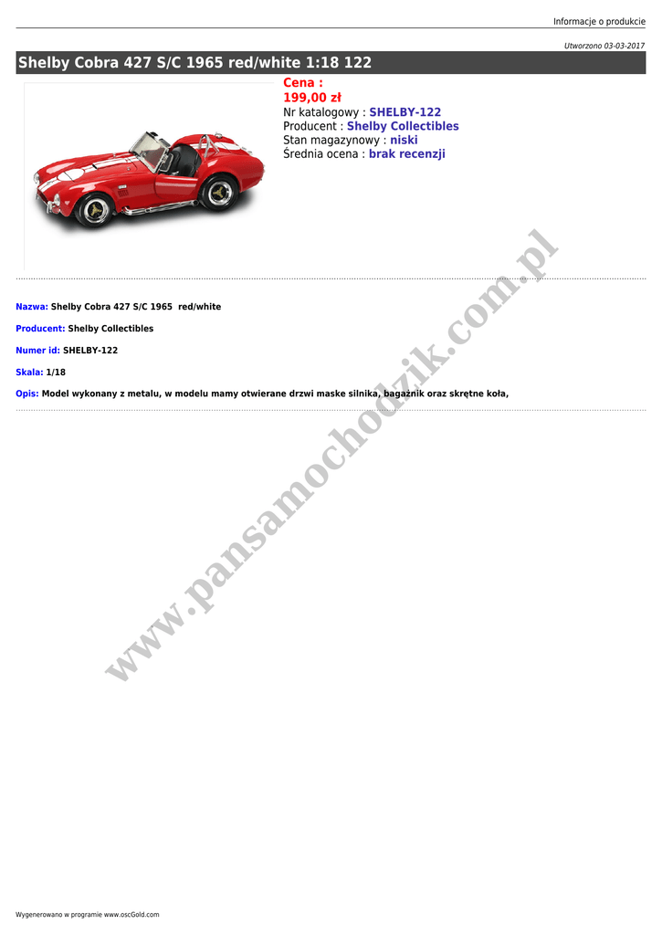 Informacje o produkcie Utworzono 03-03-2017 Shelby Cobra 427 S/C 1965 red/white 1:18 122 Cena : 199,00 zł om .p l Nr katalogowy : SHELBY-122 Producent : Shelby Collectibles Stan magazynowy : niski Średnia ocena : brak recenzji Nazwa: Shelby Cobra 427 S/C 1965 red/white .c Producent: Shelby Collectibles dz ik Numer id: SHELBY-122 Skala: 1/18 w w w .p an sa m oc ho Opis: Model wykonany z metalu, w modelu mamy otwierane drzwi maske silnika, bagażnik oraz skrętne koła, Wygenerowano w programie www.oscGold.com