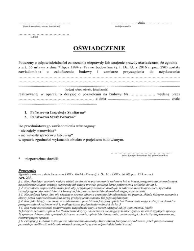 …………………………………. …..………..……dnia………………… (imię i nazwisko, nazwa inwestora) (miejscowość) ………………………………… (adres) OŚWIADCZENIE Pouczony o odpowiedzialności za zeznanie nieprawdy lub zatajenie prawdy oświadczam, że zgodnie z art. 56 ustawy z dnia 7 lipca 1994 r. Prawo budowlane (j. t. Dz. U. z 2016 r. poz. 290) zostały zawiadomione o zakończeniu budowy i zamiarze przystąpienia do użytkowania: ……………………………………………………………………………………………………………. …………………………………………………………………………………………………................. ..................................................................................................................................................................... (rodzaj robót, obiekt, lokalizacja) realizowanej w oparciu o decyzję o pozwoleniu na budowę Nr ………………. wydaną przez …………………………………….…………… z dnia ............................................................... znak: ................................................................................ 1. Państwowa Inspekcja Sanitarna* 2. Państwowa Straż Pożarna* Do przedmiotowego zawiadomienia w/w organy: - nie zajęły stanowiska* - nie wniosły sprzeciwu lub uwag* w sprawie zgodności wykonania obiektu z projektem budowlanym. ………………………………………... (data i podpis inwestora lub pełnomocnika) * niepotrzebne skreślić Pouczenie: Zgodnie z ustawa z dnia 6 czerwca 1997 r. Kodeks Karny (j. t. Dz. U. z 1997 r. Nr 88, poz. 55,3 ze zm.). Art. 233. § 1. Kto, składając zeznanie mające służyć za dowód w postępowaniu sądowym lub w innym postępowaniu prowadzonym na podstawie ustawy, zeznaje nieprawdę lub zataja prawdę, podlega karze pozbawienia wolności do lat 3. § 2. Warunkiem odpowiedzialności jest, aby przyjmujący zeznanie, działając w zakresie swoich uprawnień, uprzedził zeznającego o odpowiedzialności karnej za fałszywe zeznanie lub odebrał od niego przyrzeczenie. § 3. Nie podlega karze, kto, nie wiedząc o prawie odmowy zeznania lub odpowiedzi na pytania, składa fałszywe zeznanie z obawy przed odpowiedzialnością karną grożącą jemu samemu lub jego najbliższym. § 4. Kto, jako biegły, rzeczoznawca lub tłumacz, przedstawia fałszywą opinię lub tłumaczenie mające służyć za dowód w postępowaniu określonym w § 1, podlega karze pozbawienia wolności do lat 3. § 5. Sąd może zastosować nadzwyczajne złagodzenie kary, a nawet odstąpić od jej wymierzenia, jeżeli: 1) fałszywe zeznanie, opinia lub tłumaczenie dotyczy okoliczności nie mogących mieć wpływu na rozstrzygnięcie sprawy, 2) sprawca dobrowolnie sprostuje fałszywe zeznanie, opinię lub tłumaczenie, zanim nastąpi, chociażby nieprawomocne, rozstrzygnięcie sprawy. § 6. Przepisy § 1–3 oraz 5 stosuje się odpowiednio do osoby, która składa fałszywe oświadczenie, jeżeli przepis ustawy przewiduje możliwość odebrania oświadczenia pod rygorem odpowiedzialności karnej.
