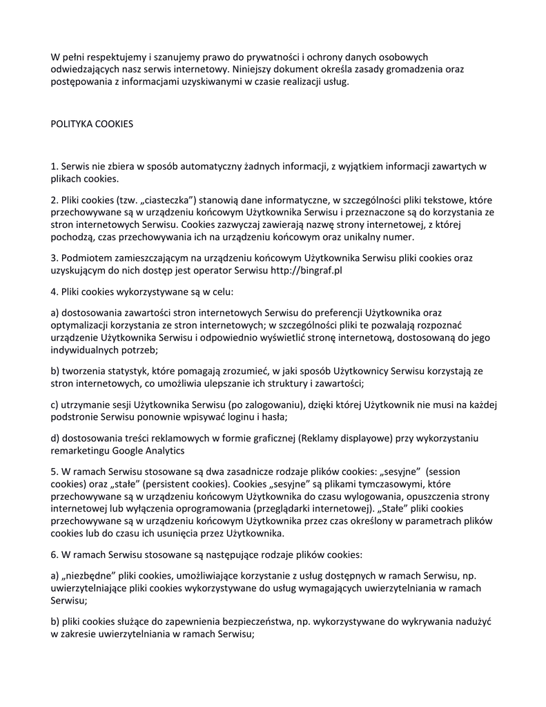 W pełni respektujemy i szanujemy prawo do prywatności i ochrony danych osobowych odwiedzających nasz serwis internetowy. Niniejszy dokument określa zasady gromadzenia oraz postępowania z informacjami uzyskiwanymi w czasie realizacji usług. POLITYKA COOKIES 1. Serwis nie zbiera w sposób automatyczny żadnych informacji, z wyjątkiem informacji zawartych w plikach cookies. 2. Pliki cookies (tzw. „ciasteczka”) stanowią dane informatyczne, w szczególności pliki tekstowe, które przechowywane są w urządzeniu końcowym Użytkownika Serwisu i przeznaczone są do korzystania ze stron internetowych Serwisu. Cookies zazwyczaj zawierają nazwę strony internetowej, z której pochodzą, czas przechowywania ich na urządzeniu końcowym oraz unikalny numer. 3. Podmiotem zamieszczającym na urządzeniu końcowym Użytkownika Serwisu pliki cookies oraz uzyskującym do nich dostęp jest operator Serwisu http://bingraf.pl 4. Pliki cookies wykorzystywane są w celu: a) dostosowania zawartości stron internetowych Serwisu do preferencji Użytkownika oraz optymalizacji korzystania ze stron internetowych; w szczególności pliki te pozwalają rozpoznać urządzenie Użytkownika Serwisu i odpowiednio wyświetlić stronę internetową, dostosowaną do jego indywidualnych potrzeb; b) tworzenia statystyk, które pomagają zrozumieć, w jaki sposób Użytkownicy Serwisu korzystają ze stron internetowych, co umożliwia ulepszanie ich struktury i zawartości; c) utrzymanie sesji Użytkownika Serwisu (po zalogowaniu), dzięki której Użytkownik nie musi na każdej podstronie Serwisu ponownie wpisywać loginu i hasła; d) dostosowania treści reklamowych w formie graficznej (Reklamy displayowe) przy wykorzystaniu remarketingu Google Analytics 5. W ramach Serwisu stosowane są dwa zasadnicze rodzaje plików cookies: „sesyjne” (session cookies) oraz „stałe” (persistent cookies). Cookies „sesyjne” są plikami tymczasowymi, które przechowywane są w urządzeniu końcowym Użytkownika do czasu wylogowania, opuszczenia strony internetowej lub wyłączenia oprogramowania (przeglądarki internetowej). „Stałe” pliki cookies przechowywane są w urządzeniu końcowym Użytkownika przez czas określony w parametrach plików cookies lub do czasu ich usunięcia przez Użytkownika. 6. W ramach Serwisu stosowane są następujące rodzaje plików cookies: a) „niezbędne” pliki cookies, umożliwiające korzystanie z usług dostępnych w ramach Serwisu, np. uwierzytelniające pliki cookies wykorzystywane do usług wymagających uwierzytelniania w ramach Serwisu; b) pliki cookies służące do zapewnienia bezpieczeństwa, np. wykorzystywane do wykrywania nadużyć w zakresie uwierzytelniania w ramach Serwisu; c) „wydajnościowe” pliki cookies, umożliwiające zbieranie informacji o sposobie korzystania ze stron internetowych Serwisu; d) „funkcjonalne” pliki cookies, umożliwiające „zapamiętanie” wybranych przez Użytkownika ustawień i personalizację interfejsu Użytkownika, np. w zakresie wybranego języka lub regionu, z którego pochodzi Użytkownik, rozmiaru czcionki, wyglądu strony internetowej itp.; e) „reklamowe” pliki cookies, umożliwiające dostarczanie Użytkownikom treści reklamowych bardziej dostosowanych do ich zainteresowań. 7. W wielu przypadkach oprogramowanie służące do przeglądania stron internetowych (przeglądarka internetowa) domyślnie dopuszcza przechowywanie plików cookies w urządzeniu końcowym Użytkownika. Użytkownicy Serwisu mogą dokonać w każdym czasie zmiany ustawień dotyczących plików cookies. Ustawienia te mogą zostać zmienione w szczególności w taki sposób, aby blokować automatyczną obsługę plików cookies w ustawieniach przeglądarki internetowej bądź informować o ich każdorazowym zamieszczeniu w urządzeniu Użytkownika Serwisu. Szczegółowe informacje o możliwości i sposobach obsługi plików cookies dostępne są w ustawieniach oprogramowania (przeglądarki internetowej). Użytkownicy mogą zablokować usługę Analytics dla reklam displayowych oraz dostosowywać reklamy w sieci reklamowej Google w Menedżerze preferencji reklam. Można również pobrać program blokujący Google Analytics ze strony https://tools.google.com/dlpage/gaoptout/ 8. Operator Serwisu informuje, że ograniczenia stosowania plików cookies mogą wpłynąć na niektóre funkcjonalności dostępne na stronach internetowych Serwisu. 9. Pliki cookies zamieszczane w urządzeniu końcowym Użytkownika Serwisu i wykorzystywane mogą być również przez współpracujących z operatorem Serwisu reklamodawców oraz partnerów. 10. Więcej informacji na temat plików cookies dostępnych jest pod adresem http://wszystkoociasteczkach.pl lub w sekcji „Pomoc” w menu przeglądarki internetowej.