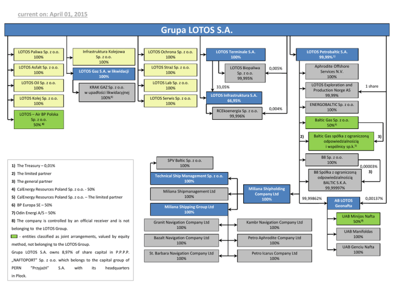 current on: April 01, 2015 Grupa LOTOS S.A. Infrastruktura Kolejowa Sp. z o.o. 100% LOTOS Paliwa Sp. z o.o. 100% LOTOS Asfalt Sp. z o.o. 100% LOTOS Gaz S.A. w likwidacji 100% LOTOS Oil Sp. z o.o. 100% KRAK GAZ Sp. z o.o. w upadłości likwidacyjnej 100%8) LOTOS Kolej Sp. z o.o. 100% LOTOS Ochrona Sp. z o.o. 100% LOTOS Straż Sp. z o.o. 100% LOTOS Biopaliwa Sp. z o.o. 99,995% LOTOS Lab Sp. z o.o. 100% LOTOS Serwis Sp. z o.o. 100% LOTOS Petrobaltic S.A. 99,99% 1) LOTOS Terminale S.A. 100% Aphrodite Offshore Services N.V. 100% 0,005% LOTOS Exploration and Production Norge AS 99,99% 33,05% LOTOS Infrastruktura S.A. 66,95% RCEkoenergia Sp. z o.o. 99,996% LOTOS – Air BP Polska Sp. z o.o. 50% 6) ENERGOBALTIC Sp. z o.o. 100% 0,004% Baltic Gas Sp. z o.o. 50%4) 2) 2) The limited partner 4) CalEnergy Resources Poland Sp. z o.o. - 50% 5) CalEnergy Resources Poland Sp. z o.o. – The limited partner 6) BP Europa SE – 50% 8) The company is controlled by an official receiver and is not belonging to the LOTOS Group. - entities classified as joint arrangements, valued by equity method, not belonging to the LOTOS Group. Grupa LOTOS S.A. owns 8,97% of share capital in P.P.P.P. „NAFTOPORT” Sp. z o.o. which belongs to the capital group of in Plock. ”Przyjaźń” Miliana Shipmanagement Ltd 100% Miliana Shipholding Company Ltd 100% 99,99862% Miliana Shipping Group Ltd 100% 7) Odin Energi A/S – 50% PERN B8 Spółka z ograniczoną odpowiedzialnością BALTIC S.K.A. 99,99997% Technical Ship Management Sp. z o.o. 100% 3) The general partner S.A. with its headquarters Baltic Gas spółka z ograniczoną odpowiedzialnością i wspólnicy sp.k.5) B8 Sp. z o.o. 100% SPV Baltic Sp. z o.o. 100% 1) The Treasury – 0,01% 1 share Granit Navigation Company Ltd 100% Kambr Navigation Company Ltd 100% Bazalt Navigation Company Ltd 100% Petro Aphrodite Company Ltd 100% St. Barbara Navigation Company Ltd 100% Petro Icarus Company Ltd 100% AB LOTOS Geonafta 3) 0,00003% 3) 0,00137% UAB Minijos Nafta 50%7) UAB Manifoldas 100% UAB Genciu Nafta 100%