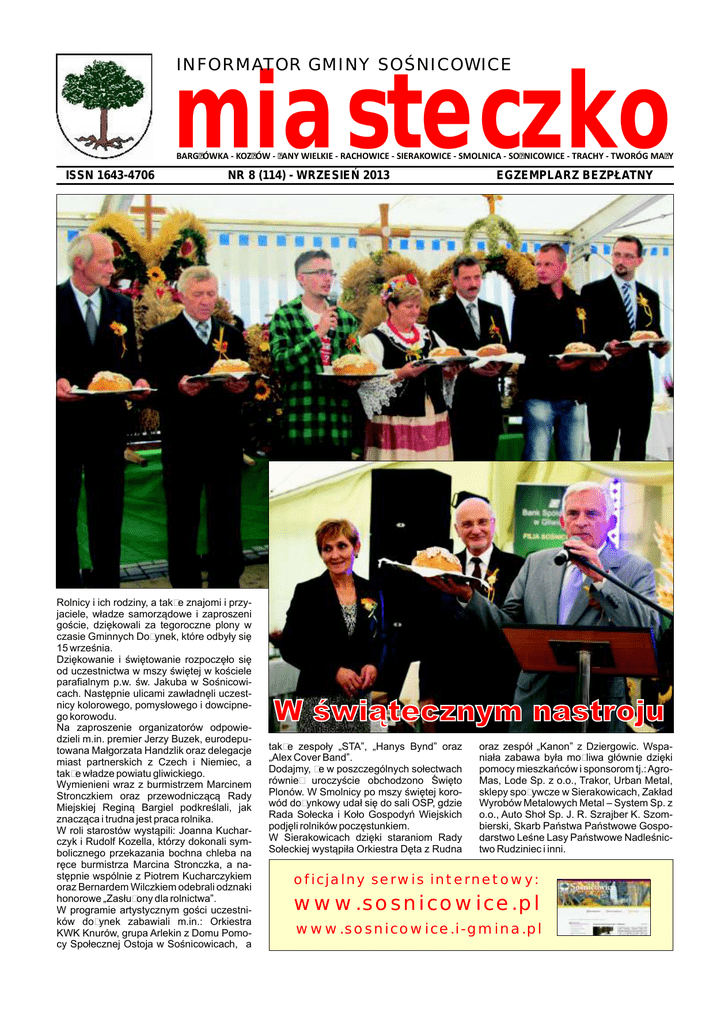 INFORMATOR GMINY SOŚNICOWICE miasteczko BARGŁÓWKA - KOZŁÓW - ŁANY WIELKIE - RACHOWICE - SIERAKOWICE - SMOLNICA - SOŚNICOWICE - TRACHY - TWORÓG MAŁY ISSN 1643-4706 NR 8 (114) - WRZESIEŃ 2013 Rolnicy i ich rodziny, a także znajomi i przyjaciele, władze samorządowe i zaproszeni goście, dziękowali za tegoroczne plony w czasie Gminnych Dożynek, które odbyły się 15 września. Dziękowanie i świętowanie rozpoczęło się od uczestnictwa w mszy świętej w kościele parafialnym p.w. św. Jakuba w Sośnicowicach. Następnie ulicami zawładnęli uczestnicy kolorowego, pomysłowego i dowcipnego korowodu. Na zaproszenie organizatorów odpowiedzieli m.in. premier Jerzy Buzek, eurodeputowana Małgorzata Handzlik oraz delegacje miast partnerskich z Czech i Niemiec, a także władze powiatu gliwickiego. Wymienieni wraz z burmistrzem Marcinem Stronczkiem oraz przewodniczącą Rady Miejskiej Reginą Bargiel podkreślali, jak znacząca i trudna jest praca rolnika. W roli starostów wystąpili: Joanna Kucharczyk i Rudolf Kozella, którzy dokonali symbolicznego przekazania bochna chleba na ręce burmistrza Marcina Stronczka, a następnie wspólnie z Piotrem Kucharczykiem oraz Bernardem Wilczkiem odebrali odznaki honorowe „Zasłużony dla rolnictwa”. W programie artystycznym gości uczestników dożynek zabawiali m.in.: Orkiestra KWK Knurów, grupa Arlekin z Domu Pomocy Społecznej Ostoja w Sośnicowicach, a EGZEMPLARZ BEZPŁATNY W świątecznym nastroju także zespoły „STA”, „Hanys Bynd” oraz „Alex Cover Band”. Dodajmy, że w poszczególnych sołectwach również uroczyście obchodzono Święto Plonów. W Smolnicy po mszy świętej korowód dożynkowy udał się do sali OSP, gdzie Rada Sołecka i Koło Gospodyń Wiejskich podjęli rolników poczęstunkiem. W Sierakowicach dzięki staraniom Rady Sołeckiej wystąpiła Orkiestra Dęta z Rudna oraz zespół „Kanon” z Dziergowic. Wspaniała zabawa była możliwa głównie dzięki pomocy mieszkańców i sponsorom tj.: AgroMas, Lode Sp. z o.o., Trakor, Urban Metal, sklepy spożywcze w Sierakowicach, Zakład Wyrobów Metalowych Metal – System Sp. z o.o., Auto Shoł Sp. J. R. Szrajber K. Szombierski, Skarb Państwa Państwowe Gospodarstwo Leśne Lasy Państwowe Nadleśnictwo Rudziniec i inni. oficjalny serwis internetowy: www.sosnicowice.pl www.sosnicowice.i-gmina.pl 2 wrzesień 2013 Wszystkiego najlepszego! Przedstawiamy kolejne dostojne Jubilatki – mieszkanki Gminy Sośnicowice, które obchodziły niedawno 90. i 91. urodziny. Z tej okazji, ze szczególnymi życzeniami, bukietem kwiatów i upominkami, solenizantki odwiedził Burmistrz Sośnicowic - Marcin Stronczek. 10 czerwca 2013 roku Anna Borkertas z Sośnicowic obchodziła 91. urodziny. 1 sierpnia 2013 roku Elżbieta Brom z Kozłowa obchodziła 90. urodziny. 25 sierpnia 2013 roku Elżbieta Staneczek z Tworoga Małego obchodziła 91. urodziny. 27 sierpnia 2013 roku Hildegarda Król z Rachowic obchodziła 91. urodziny. 8 września 2013 roku Helena Koziołek z Sierakowic obchodziła 91. urodziny. 14 września 2013 roku Lidia Pawłowska z Sośnicowic obchodziła 91. urodziny. Ponadto Burmistrz Sośnicowic, Marcin Stronczek wysłał listy gratulacyjne do Bronisławy Wolny (Trachy), która 3 września 2013 roku obchodziła 92. urodziny oraz do Gertrudy Dziuby ze Smolnicy, która 17 września 2013 roku obchodziła 91. urodziny. INFORMATOR GMINY SOŚNICOWICE miasteczko BARGŁÓWKA - KOZŁÓW - ŁANY WIELKIE - RACHOWICE - SIERAKOWICE - SMOLNICA - SOŚNICOWICE - TRACHY - TWORÓG MAŁY ISSN 1643-4706 Kronika kryminalna 10.09.2013 - nieustalony sprawca twardym narzędziem dokonał zniszczenia bramy garażowej, powodując straty na kwotę 2600 złotych na szkodę mieszkańca Smolnicy. 14.09.2013 - w sklepie mięsnym przy ul. Rynek nieznany sprawca ukradł portfel 32letniej mieszkance Sośnicowic. Straty oszacowano na 50 zł. 16.09.2013 - nieznany sprawca usiłował dokonać kradzieży samochodu marki BMW X5, wartości 231.000 zł, na szkodę 47-letniego Anatolija T. z Ukrainy. Do zdarzenia doszło o godzinie 7.27 w Sośnicowicach, na parkingu przy ul. Gliwickiej. 25.07.2013 - w Sierakowicach nieznany sprawca włamał się do domu jednorodzinnego, a następnie ukradł telewizor, dwa laptopy i biżuterię. Wydawca: Urząd Miejski Sośnicowice ul. Rynek 19, 44-153 Sośnicowice Redakcja: Urząd Miejski Sośnicowice ul. Rynek 19, 44-153 Sośnicowice Redaguje zespół. Redaktor wydania: Piotr Skorupa tel. 601 52 86 83 e-mail: [email protected] 27.07.2013 - w Sierakowicach (ul. Wiejska) dwóch mieszkańców powiatu gliwickiego w wieku 22 i 27 lat wraz z nieustaloną trzecią osobą pobili 19-letniego mieszkańca gminy Sośnicowice. Nakład: 1500 egzemplarzy. 29.07.2013 - dwa kamienne wazony zostały skradzione przez nieznaną osobę z nagrobków na cmentarzu parafialnym w Sierakowicach. Redakcja zastrzega sobie prawo dokonywania skrótów i redagowania nadesłanych tekstów. wrzesień 2013 Młodzież gimnazjum im. Unii Europejskiej w Sośnicowicach, pod opieką nauczycieli języków obcych wyjechała 28 lipca br. na międzynarodowy obóz do miasta partnerskiego Gminy Sośnicowice - Linden w Niemczech. Przez tydzień grupa naszej młodzieży uczestniczyła w bogatym programie kulturalno–rekreacyjnym, podczas którego mogła się zintegrować i poszerzyć znajomość języków obcych z rówieśnikami z Niemiec, Austrii i Japonii. Poznała miejscowość docelową, wyjechała na wycieczkę do Speyer (Sprewa), gdzie zwiedzała miasto i muzeum techniki. Japońska młodzież zaprezentowała w pigułce kulturę japońską, a ponadto wszyscy uczyli się origami i kaligrafii. Jeden dzień pobytu poświęcony był pracy nad projektem filcowania obrazu na ścianę z wełny, nawiązującego do hasła tegorocznego obozu „Razem doświadczymy więcej”. Popołudniowa sjesta upływała na kąpieli w basenie, na którego terenie były rozbite nasze namioty. Wieczory umilały spotkania przy ognisku,