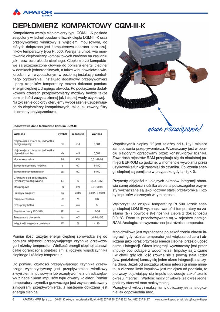 CIEP£OMIERZ KOMPAKTOWY CQM-III-K Kompaktowa wersja ciepłomierzy typu CQM-III-K posiada zespolony w jednej obudowie licznik ciepła LQM-III-K oraz przepływomierz wirnikowy z wyjściem impulsowym, do których dołączona jest komputerowo dobrana para czujników temperatury typu Pt 500. Wersja ta umożliwia montowanie ciepłomierzy kompaktowych zarówno na zasilaniu jak i powrocie układu cieplnego. Ciepłomierze kompaktowe są przeznaczone głównie do pomiaru energii cieplnej w domkach jednorodzinnych, a także w budownictwie wielorodzinnym wyposażonym w poziomą instalację centralnego ogrzewania. Instalując dodatkowy przepływomierz i parę czujników temperatury można dokonać pomiaru energii cieplnej z drugiego obwodu. Po podłączeniu dodatkowych czterech przepływomierzy możliwy będzie także pomiar ilości zużycia zimnej jak i ciepłej wody użytkowej. Na życzenie odbiorcy oferujemy wyposażenie uzupełniające do ciepłomierzy kompaktowych, takie jak zawory, filtry i elementy przyłączeniowe. Podstawowe dane techniczne licznika LQM-III Wielkość Symbol Jednostka Wartość Najmniejsza zliczana jednostka energii cieplnej: Qe GJ 0,001 Najmniejsza zliczana jednostka objętości nośnika: Ve m3 0,001 Moc maksymalna: Pd kW 0,01-99,99 t oC 1-180 Zakres różnicy temperatur: Δt oC 3-160 Graniczny błąd dopuszczalny (wyliczony według wzoru) Ei % ±(0,5+3/Δt) Moc progowa Pp kW 0,01-99,99 Przepływ progowy qp m3/h 0,001- 9,9999 Napięcie zasilania Uz V 3,6 Czas pracy baterii — rok 5 Stopień ochrony IEC-529 IP — IP-54 Temperatura otoczenia ta oC od 5 do 55 Wilgotność względna powietrza W % < 90 Zakres temperatury nośnika: Pomiar ilości zużytej energii cieplnej sprowadza się do pomiaru objętości przepływającego czynnika grzewczego i różnicy temperatur. Wielkość energii cieplnej stanowi całkę ograniczoną objętościami z iloczynu współczynnika cieplnego i różnicy temperatur. Do pomiaru objętości przepływającego czynnika grzewczego wykorzystywany jest przepływomierz wirnikowy z wyjściem impulsowym lub przepływomierz ultradźwiękowy z nadajnikiem impulsów typu otwarty kolektor. Pomiar temperatury czynnika grzewczego jest zsynchronizowany z impulsami przepływomierza, a następnie obliczana jest energia cieplna. 6 APATOR - KFAP Sp. z o.o. Współczynnik cieplny “k” jest zależny od t1 i t2 i miejsca zamocowania przepływomierza. Wyznaczany jest w oparciu o algorytm opracowany przez konstruktorów licznika. Zawartość rejestrów RAM przepisuje się do nieulotnej pamięci EEPROM co godzinę, w momencie wywołania przez użytkownika funkcji transmisji do czytnika. Obliczenia energii cieplnej są pomijane w przypadku gdy t1 - t2 < 0. Przyrosty objętości z kolejnych okresów integracji stanowią sumę objętości nośnika ciepła, a poszczególne przyrosty wyznaczane są jako iloczyny stałej przetwornika i liczby impulsów zliczonych w tym okresie. Wykorzystując czujniki temperatury Pt 500 licznik energii cieplnej LQM-III wyznacza wartości temperatury na zasilaniu (t1) i powrocie (t2) nośnika ciepła z dokładnością 0,010C. Dane te przechowywane są w rejestrze pamięci RAM. Analogicznie wyznaczana jest różnica temperatur. Moc chwilowa jest wyznaczana po zakończeniu okresu integracji, gdy różnica temperatur jest większa od zera i obliczana jako iloraz przyrostu energii cieplnej przez długość okresu integracji. Okres integracji wyznaczany jest przez impulsy pochodzące z wodomierza. Impulsy są zliczane i w chwili gdy ich ilość zrówna się z pewną stałą liczbą (tzw. podziałem) kończy się jeden okres integracji a zaczyna drugi. Jeżeli od początku okresu integracji minie minuta, a zliczana ilość impulsów jest mniejsza od podziału, to pierwszy pojawiający się impuls spowoduje zakończenie okresu integracji. Wartość mocy chwilowej za okres jednej godziny stanowi moc maksymalną. Przepływ chwilowy i maksymalny obliczany jest analogicznie jak odpowiednia moc. 30-011 Kraków; ul. Wrocławska 53, tel. (012) 637 87 20, 637 42 22, fax. (012) 637 34 97; www.apator-kfap.pl; e-mail: [email protected] Licznik energii cieplnej LQM-III posiada możliwość pomiaru energii nadprogowej. W tym celu powinien być ustawiony próg mocy, przepływu lub temperatury powyżej którego ma zostać naliczana energia nadprogowa. Licznik nalicza energię nadprogową tylko z jednego ustanowionego progu. Oznaczenie – Typ JS 90-0,6-NE JS 90-1,0-NE JS 90-1,5-NE JS 90-1,5-G1-NE JS 90-2,5-NE Średnica nominalna DN mm 15 15 15 20 20 Przepływ nominalny qp m3/h 0,6 1,0 1,5 1,5 2,5 Przepływ maksymalny qi m3/h 1,2 2,0 3,0 3,0 5,0 Przepływ minimalny – pozycja zabudowy pozioma – H qi dm3/h 12 20 30 30 50 Przepływ minimalny – pozycja zabudowy pionowa – V qi dm3/h 24 40 50 60 100 Próg rozruchu – dm3/h 3,5 5 8 5 15 Błąd względny EPd % Stan przetwarzania impulsów Vi imp/dm3 60,000 34,892 Dopuszczalna strata ciśnienia ∆p MPa 0,1 Ciśnienie nominalne – MPa 1,5 Temperatura maksymalna – ºC 90 Pozycja zabudowy 124,780 85,334 – Masa (bez elementów przyłączeniowych) Weight ) p/q 60,000 pozioma H / pionowa V G APATOR - KFAP Sp. z o.o. EPd = (3 + 0,05 q G 3/4 G 3/4 G 3/4 G1 G1 110 110 110 130 130 0,45 0,45 L mm H mm 68 D mm 73 kg 0,4 0,4 30-011 Kraków; ul. Wrocławska 53, tel. (012) 637 87 20, 637 42 22, fax. (012) 637 34 97; 0,4 www.apator-kfap.pl; e-mail: [email protected] 7