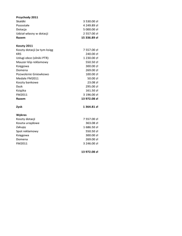 Przychody 2011 Skaldki Pozostałe Dotacja Udział własny w dotacji Razem 3 530.00 zł 4 249.89 zł 5 000.00 zł 2 557.00 zł 15 336.89 zł Koszty 2011 Koszty dotacji (w tym księg KRS Usługi obce (silniki PTR) Mauzer klip reklamowy Księgowa Domena Pozwolenie Gniewkowo Medale FM2011 Koszty bankowe Dysk Książka FM2011 Razem 7 557.00 zł 240.00 zł 1 230.00 zł 550.50 zł 300.00 zł 269.00 zł 100.00 zł 50.00 zł 23.08 zł 295.00 zł 161.50 zł 3 196.00 zł 13 972.08 zł Zysk 1 364.81 zł Wykres Koszty dotacji Koszta urzędowe Zakupy Spot reklamowy Księgowa Domena FM2011 7 557.00 zł 363.08 zł 1 686.50 zł 550.50 zł 300.00 zł 269.00 zł 3 246.00 zł 13 972.08 zł
