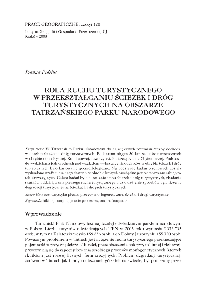 PRACE GEOGRAFICZNE, zeszyt 120 Instytut Geografii i Gospodarki Przestrzennej UJ Kraków 2008 Joanna Fidelus ROLA RUCHU TURYSTYCZNEGO W PRZEKSZTAŁCANIU ŚCIEŻEK I DRÓG TURYSTYCZNYCH NA OBSZARZE TATRZAŃSKIEGO PARKU NARODOWEGO Zarys treści: W Tatrzańskim Parku Narodowym do największych przemian rzeźby dochodzi w obrębie ścieżek i dróg turystycznych. Badaniami objęto 30 km szlaków turystycznych w obrębie dolin Bystrej, Kondratowej, Jaworzynki, Pańszczycy oraz Gąsienicowej. Podstawą do wydzielenia jednorodnych pod względem wykształcenia odcinków w obrębie ścieżek i dróg turystycznych było kartowanie geomorfologiczne. Na podstawie badań terenowych zostały wydzielone strefy silnie degradowane, w obrębie których niezbędne jest zastosowanie zabiegów rekultywacyjnych. Celem badań było określenie stanu ścieżek i dróg turystycznych, zbadanie skutków oddziaływania pieszego ruchu turystycznego oraz określenie sposobów ograniczenia degradacji turystycznej na ścieżkach i drogach turystycznych. Słowa kluczowe: turystyka piesza, procesy morfogenetyczne, ścieżki i drogi turystyczne Key words: hiking, morphogenetic processes, tourist footpaths Wprowadzenie Tatrzański Park Narodowy jest najliczniej odwiedzanym parkiem narodowym w Polsce. Liczba turystów odwiedzających TPN w 2005 roku wyniosła 2 372 733 osób, w tym na Kalatówki weszło 159 856 osób, a do Doliny Jaworzynki 155 720 osób. Poważnym problemem w Tatrach jest natężenie ruchu turystycznego przekraczające pojemność turystyczną ścieżek. Turyści, przez niszczenie pokrywy roślinnej i glebowej, przyczyniają się do zapoczątkowania przebiegu procesów morfogenetycznych, których skutkiem jest rozwój licznych form erozyjnych. Problem degradacji turystycznej, zarówno w Tatrach jak i innych obszarach górskich na świecie, był poruszany przez 20 PRACE GEOGRAFICZNE, ZESZYT 120 wielu badaczy, np. Skawiński 1993, Łajczak 1996, Krusiec 1996, Prędki 1999, Gorczyca 2000, Gorczyca i Krzemień 2006, w Górach Skalistych w USA (Wilson, Seney 1994) czy w Masywie Centralnym we Francji (Krzemień 1997). Masowa turystyka w obszarach górskich oddziaływuje w znacznym stopniu na naturalne ekosystemy objęte ścisłą formą ochrony, co w konsekwencji przyczynia się do licznych przekształceń rzeźby tych obszarów. Dlatego też pomimo licznych publikacji ważne są dalsze badania, zwłaszcza w obszarach chronionych w celu przeciwdziałania negatywnym skutkom związanym z masową turystyką. Specyfika poszczególnych obszarów, w których były prowadzone wspomniane badania, wpływa na zróżnicowanie skutków oddziaływania ruchu turystycznego i daje możliwość porównania metod stosowanych w celach ograniczenia przekształceń związanych z antropopresją. Celem badań w rejonie hal Gąsienicowej i Kondratowej było określenie stanu ścieżek i dróg turystycznych, zbadanie skutków oddziaływania pieszego ruchu turystycznego oraz określenie sposobów ograniczenia degradacji turystycznej na ścieżkach i drogach turystycznych. Obszar badań Granice badanego terenu stanowiły od zachodu Dolina Bystrej i Dolina Kondratowa. Od południa granica obejmowała ścieżki od Kopy Kondrackiej (2005 m n.p.m.) po Kasprowy Wierch (1987 m n.p.m.). Na wschodzie granica obejmowała szlaki prowadzące na Skrajny Granat (2225 m n.p.m.), Przełęcz Krzyżne (2112 m n.p.m.), Dolinę Pańszczycy i Dolinę Jaworzynki (ryc. 1). Obszar badań jest położony na pograniczu Tatr Zachodnich i Wysokich. Ścieżki w Tatrach Zachodnich są rozmieszczone w obrębie obszaru zbudowanego ze skał metamorficznych i osadowych. W Tatrach Wysokich ścieżki przebiegają w obrębie obszaru zbudowanego z granodiorytów (ryc. 2). Stoki w Tatrach Wysokich są wykształcone w postaci urwistych ścian skalnych, rozciętych głębokimi żlebami, w Tatrach Zachodnich natomiast charakterystyczne są kopulaste szczyty i zaokrąglone grzbiety. Badany obszar w plejstocenie został intensywnie przemodelowany przez lodowce; niezlodowacona została jedynie Dolina Jaworzynki. Obszar badań jest położony w obrębie pięciu pięter klimatycznych: umiarkowanie chłodnego (900–1150 m n.p.m.), chłodnego (1150–1550 m n.p.m.), bardzo chłodnego (1550–1850 m n.p.m.), umiarkowanie zimnego (1850–2200 m n.p.m.) i zimnego (> 2200 m n.p.m.) (Hess 1965). Wydzielone piętra charakteryzują się określonymi zespołami procesów morfogenetycznych, a ich roczny przebieg jest zależny od temperatury powietrza, opadów, pokrywy śnieżnej i prędkości wiatru. Metody badań W celu poznania przemian rzeźby na ścieżkach i drogach turystycznych zastosowano metodę kartowania geomorfologicznego. Wszystkie szlaki turystyczne o długości 30 km zostały podzielone na jednorodne odcinki i naniesione na mapę topograficzną w skali 1:10 000. Odcinki te zostały wyznaczone na podstawie: nachylenia powierzchni ROLA RUCHU TURYSTYCZNEGO W PRZEKSZTAŁCANIU ŚCIEŻEK... 21 Ryc. 1. Wydzielone odcinki morfodynamiczne w obrębie badanych ścieżek A – badane ścieżki na tle wszystkich ścieżek w TPN, B: 1 – badane ścieżki, 2 – wydzielone odcinki, 3 – górna granica lasu, 4 – szczyty i przełęcze, 5 – odcinki ścieżek najbardziej przekształcone przez procesy naturalne i antropogeniczne Figure 1. Identified morphodynamic sections within researched footpaths A – researched footpaths against all of TNP footpaths, B: 1 – researched footpaths, 2 – selected footpaths sections, 3 – timberline, 4 – summits, passes, 5 – most heavily damaged sections transformed by natural and anthrophogenic processes terenu, szerokości ścieżki, położenia względem głównych form rzeźby oraz rodzaju nawierzchni. Następnie w odniesieniu do każdego odcinka, za pomocą specjalnego raptularza, zebrano informacje na temat: wysokości n.p.m., średniej i maksymalnej szerokości, głębokości rozcięć, nachylenia terenu, rodzaju form erozyjnych i akumulacyjnych