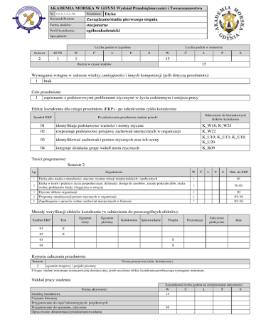AKADEMIA MORSKA W GDYNI Wydział Przedsiębiorczości i Towaroznawstwa Nr 4_6_0_1_5_2_788 Przedmiot: Etyka Kierunek/Poziom Zarządzanie/studia pierwszego stopnia Forma studiów: stacjonarne Profil kształcenia: ogólnoakademicki Specjalność: Liczba godzin w tygodniu Semestr ECTS W 2 1 1 Ć L P Liczba godzin w semestrze S W Ć L P S 15 15 Razem w czasie studiów Wymagania wstępne w zakresie wiedzy, umiejętności i innych kompetencji (jeśli dotyczą przedmiotu): 1 brak Cele przedmiotu: 1 zapoznanie z podstawowymi problemami etycznymi w życiu codziennym i miejscu pracy Efekty kształcenia dla całego przedmiotu (EKP) - po zakończeniu cyklu kształcenia: Symbol EKP Odniesienie do kierunkowych efektów kształcenia Po zakończeniu przedmiotu student potrafi: 01 02 identyfikuje podstawowe wartości i normy etyczne rozpoznaje podstawowe przejawy zachowań nieetycznych w organizacji K_W18; K_W21 K_W22 03 identyfikować zachowań i postaw etycznych oraz ich oceny K_U10; K_U13; K_U18: K_U20 04 integruje działania grupy wokół norm etycznych K_K09 Treści programowe: Semestr 2 Lp Zagadnienia W Ć L P S Odn. do EKP 1 Etyka jako nauka o moralności, etyczny wymiar relacji międzyludzkich i społecznych 3 01 2 Etyka w teorii i praktyce życia gospodarczego, dylematy: dostęp do zasobów, zasady podziału dóbr, etyka wobec problemów biedy i bogactwa w świecie 2 01,03 3 03 03; 04 02; 03 3 4 5 Etyczne oblicze organizacji Programy standaryzacji postaw etycznych w organizacji Zapobieganie i sprzeciw wobec zachowań nieetycznych w biznesie 4 3 Metody weryfikacji efektów kształcenia (w odniesieniu do poszczególnych efektów): Symbol EKP Test 01 X 02 X Egzamin ustny Egzamin pisemny Kolokwium Sprawozdanie Projekt 03 X 04 X Prezentacja Zaliczenie praktyczne Inne Kryteria zaliczenia przedmiotu: Semestr Ocena pozytywna (min. dostateczny) 2 egzamin testpowy i projekt pisemny Uwaga: student otrzymuje ocenę powyżej dostatecznej, jeżeli uzyskane efekty kształcenia przekraczają wymagane minimum. Nakład pracy studenta: Forma aktywności Godziny kontaktowe Czytanie literatury Przygotowanie do zajęć laboratoryjnych, projektowych Przygotowanie do egzaminu, zaliczenia Opracowanie dokumentacji projektu/sprawozdania Szacunkowa liczba godzin na zrealizowanie aktywności W Ć L P S 15 10 Uczestnictwo w zaliczeniach i egzaminach Udział w konsultacjach Łącznie godzin Liczba punktów ECTS Sumaryczna liczba punktów ECTS dla przedmiotu Obciążenie studenta związane z zajęciami praktycznymi Obciążenie studenta na zajęciach wymagających bezpośredn. udziału nauczycieli akadem. 2 1 28 1 1 10 18 Literatura: Semestr 2 Semestr 2 Literatura podstawowa 1.Bugdol M., Gry i zachowania nieetyczne w organizacji, Difin Warszawa 2007. 2.Elementy etyki gospodarki rynkowej, [red:] B. Pogonowska, PWE, Warszawa 2000 3.Etyka w biznesie, pod red. nauk. P.Minusa, Wyd. Naukowe PWN, Warszawa 1998. 4.Filek J.: Wprowadzenie do etyki biznesu, Akademia Ekonomiczna, Wrocław 2000. 5.Klimczak B.: Etyka gospodarcza, Wyd. Akademii Ekonomicznej, Wrocław 1996. 6.Nogalski B., Śniadecki J., Etyka menedżerska, Wyd. TNOiK, Bydgoszcz 1996. 7.Nogalski B., Śniadecki J., Etyka w zarządzaniu przedsiębiorstwem, Wyd. OPO Bydgoszcz 2001. Literatura uzupełniająca 1.Ossowska M., Normy moralne, PWN Warszawa 1971. 2.Szaban J., Miękkie zarządzanie, Wyd. WSPiZ, Warszawa 2003. Prowadzący przedmiot: Tytuł/stopień, Imię i Nazwisko 1. Osoba odpowiedzialna za przedmiot Jednostka dydaktyczna dr Andrzej Masłowski KEiZ dr Andrzej Masłowski KEiZ 2. Pozostałe osoby prowadzące zajęcia AKADEMIA MORSKA W GDYNI Wydział Przedsiębiorczości i Towaroznawstwa Nr 4_6_0_1_5_2_329 Przedmiot: Finanse przedsiębiorstwa Kierunek/Poziom Zarządzanie/studia pierwszego stopnia Forma studiów: stacjonarne Profil kształcenia: ogólnoakademicki Specjalność: Liczba godzin w tygodniu Semestr ECTS W Ć 2 4 1 1 L P Liczba godzin w semestrze S W Ć 15 15 L P S 30 Razem w czasie studiów Wymagania wstępne w zakresie wiedzy, umiejętności i innych kompetencji (jeśli dotyczą przedmiotu): 1 Nie dotyczy Cele przedmiotu: 1 Opanowanie wiedzy i nabycie umiejętności z podstaw finansów przedsiębiorstwa Efekty kształcenia dla całego przedmiotu (EKP) - po zakończeniu cyklu kształcenia: Symbol EKP Odniesienie do kierunkowych efektów kształcenia Po zakończeniu przedmiotu student potrafi: EKP_1 kategoryzuje kierunki i charakter powiązań finansów przedsiębiorstwa z otoczeniem publicznym i prywatnym EKP_2 wyjaśnia i stosuje podstawowe i rozszerzone formuły ustalania wartości przyszłej i K_W13 wartości zaktualizowanej pieniądza EKP_3 identyfikuje źródła informacji finansowej i wskazuje podstawowe techniki pomiaru K_W13 K_U08 zyskowności i płynności finansowej przedsiębiorstwa EKP_4 stosuje podstawowe metody oceny efektywności i ryzyka inwestycji, ocenia inwestycje wybranymi metodami K_W13 K_U08 K_K02 EKP_5 Kategoryzuje i opisuje cechy formalno - prawne i ekonomiczne głównych instrumentów finansowania K_W13 K_U08 K_U19 K_K02 EKP_6 wyjaśnia procedurę ustalania kosztu kapitału obcego, rozpoznaje różnice istoty kosztu kapitału własnego i obcego K_W13 K_U08 K_U19 EKP_7 opisuje językiem finansów (zasoby, źródła finansowania, wyniki) działalność operacyjną przedsiębiorstw K_W13 K_U08 K_U19 EKP_8 wykonuje obliczenia wartości przyszłej i wartości zaktualizowanej pieniądza (kapitału) w podstawowym zakresie K_W13 K_U08 K-U19 EKP_9 ocenia wartość liczbową poszczególnych wskaźników na podstawie porównań w czasie i porównań z wielkościami postulowanymi K_W13 K_U08 K_U19 EKP_10 rekomenduje przyjęcie lub odrzucenie planowanej inwestycji na podstawie ustalonego stopnia efektywności i ryzyka K_W13 K_U08 K_U19 K_K02 EKP_11 rekomenduje kredyt korzystniejszy z punktu widzenia kosztów jego pozyskania K_W13 K_U19 EKP_12 uzasadnia posługiwanie się kosztem kapitału obcego uwzględniającym efekt podatkowy w różnych decyzjach 