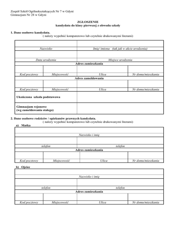 Zespół Szkół Ogólnokształcących Nr 7 w Gdyni Gimnazjum Nr 28 w Gdyni ZGŁOSZENIE kandydata do klasy pierwszej z obwodu szkoły 1. Dane osobowe kandydata. ( należy wypełnić komputerowo lub czytelnie drukowanymi literami) Imię/ imiona (tak jak w akcie urodzenia) Nazwisko Data urodzenia Miejsce urodzenia Adres zamieszkania Kod pocztowy Miejscowość Ulica Adres zameldowania Nr domu/mieszkania Kod pocztowy Miejscowość Ulica Nr domu/mieszkania Ukończona szkoła podstawowa Gimnazjum rejonowe (wg zameldowania stałego) 2. Dane osobowe rodziców / opiekunów prawnych kandydata. ( należy wypełnić komputerowo lub czytelnie drukowanymi literami) a) Matka Nazwisko i imię telefon telefon Adres zamieszkania Miejscowość Kod pocztowy Ulica Nr domu/mieszkania b) Ojciec Nazwisko i imię telefon telefon Adres zamieszkania Kod pocztowy Miejscowość Ulica Nr domu/mieszkania 3. Deklaracja kandydata dotycząca wyboru drugiego języka obcego nowożytnego ( należy zaznaczyć 1 język ): j. francuski j. niemiecki j. rosyjski 4. Deklaracja kandydata dotycząca udziału w zajęciach ( należy zaznaczyć wybrane zajęcia ): religia tak nie etyka tak nie wdż tak nie 5. Dodatkowe informacje o kandydacie ( należy znakiem "X" zaznaczyć właściwe informacje ): Informacje posiada orzeczenie poradni psychologiczno - pedagogicznej* posiada orzeczenie o niepełnosprawności* pochodzi z rodziny wielodzietnej* jest wychowywany przez jednego z rodziców* jest objęty pieczą zastępczą* posiada rodzeństwo uczące się w ZSzO Nr 7 w Gdyni * Należy dołączyć dokumenty potwierdzające spełnienie kryterium. 6. W trakcie rekrutacji do kandydat złożył wniosek do następujących gimnazjów: gimnazjum 1 wyboru gimnazjum 2 wyboru gimnazjum 3 wyboru 7. Do zgłoszenia dołączam: kopię odpisu skróconego aktu urodzenia potwierdzenie miejsca zameldowania kandydata ( może to być np. kserokopia z dowodu rodziców ) potwierdzenie miejsca zamieszkania kandydata w przypadku, gdy jest inne niż miejsce zameldowania( może to być np. kserokopia z dowodu rodziców ) 1 zdjęcie inne: inne: inne: inne: inne: Pouczenie: 1. Dane osobowe zawarte w niniejszym załączniku do zgłoszenia/wniosku będą wykorzystywane wyłącznie dla potrzeb związanych z postępowaniem rekrutacyjnym, a w przypadku przyjęcia kandydata do szkoły również dla celów ewidencji, dokumentowania procesu dydaktycznego oraz egzaminów zewnętrznych zgodnie z przepisami ustawy z dnia 07 września 1991 r. o systemie oświaty ( Dz. U. z 2004 r. Nr 256, poz. 2572) oraz aktami wykonawczymi wydanymi na jej podstawie. 2. Administratorem danych osobowych zawartych w załączniku do zgłoszenia/wniosku jest dyrektor ZSO nr 7 w Gdyni. Oświadczenia składających niniejsze zgłoszenie: 1. Oświadczam, pod rygorem odpowiedzialności karnej, że podane w załączniku do zgłoszenia wniosku dane są zgodne z aktualnym stanem faktycznym. 2. Wyrażam zgodę na przetwarzanie danych osobowych zawartych w niniejszym załączniku do zgłoszenia/wniosku dla potrzeb związanych z postępowaniem rekrutacyjnym, a w przypadku przyjęcia mojego dziecka do szkoły na ich przetwarzanie dla celów ewidencji, dokumentowania procesu dydaktycznego oraz egzaminów zewnętrznych zgodnie z przepisami ustawy z dnia 29 sierpnia 1997r. o ochronie danych osobowych ( Dz. U. z 2002 r. Nr 101, poz. 926 z późń. zm.). ........................................................................................... ( czytelny podpis rodzica / opiekuna prawnego kandydata )