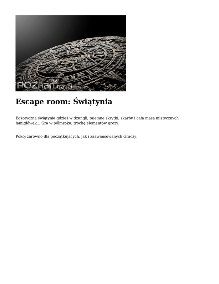 Escape room: Świątynia Egzotyczna świątynia gdzieś w dżungli, tajemne skrytki, skarby i cała masa mistycznych łamigłówek... Gra w półmroku, trochę elementów grozy. Pokój zarówno dla początkujących, jak i zaawansowanych Graczy.