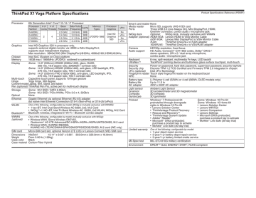 Product Specifications Reference (PSREF) ThinkPad X1 Yoga Platform Specifications Processor 6th Generation Intel® Core™ i3 / i5 / i7 Processor Processor # of # of Base Max Turbo Number Cores Threads Frequency Frequency i5-6200U 2.3 GHz 2.8 GHz i5-6300U 2.4 GHz 3.0 GHz 2 4 i7-6500U 2.5 GHz 3.1 GHz i7-6600U 2.6 GHz 3.4 GHz Graphics Cache Memory Types 3MB 3MB LPDDR3-1866 4MB 4MB Processor Graphics vPro Intel HD Graphics 520 No vPro No vPro Intel HD Graphics 520 in processor only, supports external digital monitor via HDMI or Mini DisplayPort; supports dual independent displays; Max resolution: 3840x2160 (Mini DisplayPort)@60Hz; 4096x2160 (HDMI)@24Hz Chipset Intel SoC (System on Chip) platform Memory 16GB max / 1866MHz LPDDR3 / soldered to systemboard Display Some: 14.0" (355mm) WQHD (2560x1440), glare, OLED, 300 nits, 16:9 aspect ratio, 2000000:1 contrast ratio Some: 14.0" (355mm) WQHD (2560x1440), anti-glare, LED backlight, IPS, 270 nits, 16:9 aspect ratio, 700:1 contrast ratio Some: 14.0" (355mm) FHD (1920x1080), anti-glare, LED backlight, IPS, 270 nits, 16:9 aspect ratio, 700:1 contrast ratio Multi-touch Capacitive touch panel, supports 10-finger gesture Hinge Yoga hinge, 360 degree Convert-mode Laptop, tent, stand, and tablet Pen (optional) ThinkPad Pen Pro, active pen for multi-touch display Storage Some: M.2 SSD / SATA 6.0Gb/s Some: M.2 SSD / PCIe NVMe, PCIe 3.0 x 4, 32Gb/s Optical None Ethernet Gigabit Ethernet via optional Ethernet (RJ-45) adapter (by native Intel Ethernet Connection I219-V (Non-vPro) or I219-LM (vPro)) One of the following, configurable by model (WiGig is mutually exclusive with WWAN): WLAN • 11ac+BT, Intel Dual Band Wireless-AC 8260, 2x2, M.2 Card • WiGig™+11AC+BT, Intel Tri-Band Wireless-AC 18260, 2x2 WLAN, WiGig, M.2 Card Bluetooth™ Bluetooth wireless, integrated in Wi-Fi + Bluetooth combo adapter One of the following, configurable by model (mutually exclusive with WiGig): WWAN (optional) • Wireless WAN, Sierra Wireless EM7455, Qualcomm® 4G LTE-Advanced/DC-HSPA+/HSPA+/HSPA/UMTS/GNSS, M.2 card • Wireless WAN, HUAWEI ME906S, HUAWEI 4G LTE/WCDMA/HSPA/GSM/GPRS/EDGE/GNSS, M.2 card (WE only) SIM card Micro-SIM card slot, optional Verizon LTE (US) or Lenovo Connect (WE) SIM card 13.11" x 9.02" x 0.66"; 333.0mm x 229.0mm x 16.8mm) Dimensions WxDxH: Weight From 3.00 lb (1.36kg) Case color Black Case materal Carbon-Fiber Hybrid Smart card reader None Media reader Micro SD, supports UHS-II SD card Ports Three USB 3.0 (one Always On), Mini DisplayPort, HDMI, Onelink+ connector, combo audio / microphone jack WiGig dock Optional: WiGig dock, mutually exclusive with WWAN Adapter (optional) HDMI-VGA: Lenovo HDMI to VGA Monitor Cable mDP-VGA: Lenovo Mini DisplayPort to VGA Monitor Cable RJ45: ThinkPad OneLink+ to RJ45 adapter VGA/RJ45: ThinkPad OneLink+ to VGA/RJ45 adapter Camera HD720p resolution, fixed focus Audio support HD Audio, Conexant® CX11852 codec, Dolby® DAX2 / stereo speakers, 2W x 2 / dual array microphone, combo audio / microphone jack Keyboard 6-row, spill-resistant, multimedia Fn keys, LED backlit UltraNav™ TrackPoint® pointing device and buttonless glass surface touchpad, multi-touch Security Power-on password, hard disk password, supervisor password, security keyhole Security chip Discrete TPM 1.2 TCG Certified and Firmware TPM 2.0 integrated in chipset vPro (optional) Intel vPro Technology Fingerprint reader Touch style fingerprint reader on the keyboard bezel NFC None Battery type Li-Polymer 4-cell (52Wh) or 4-cell (56Wh, OLED models only) Battery life Up to 11.0 hr AC adapter 45W or 65W AC adapter Light sensor Ambient Light Sensor G-sensor 3D accelerometer and 3D magnetometer Compass 3D compass Gyroscope 3D gyrometer Preload Some: Windows 10 Pro 64 Windows® 7 Professional 64 Some: Windows 10 Home 64 preinstalled through downgrade • Lenovo Solution Center rights in Windows 10 Pro 64 • Lenovo WRITEit • Lenovo Solution Center • Lenovo Companion • ThinkVantage Product Recovery • Lenovo Settings • Rescue and Recovery™ • Microsoft Office preloaded; • ThinkVantage System Update purchase a product key to activate • Adobe® Reader® • McAfee® Live Safe (30-day trial) • Microsoft® Office preloaded; purchase a product key to activate • McAfee® Live Safe (30-day trial) Limited warranty One of the following, configurable by model: • 1-year depot repair service • 3-year/1-yr battery depot repair service • 3-year/1-yr battery limited onsite service Mil-Spec test MIL-STD-810G military certification Environment EPEAT™ Gold; ENERGY STAR®; RoHS-compliant